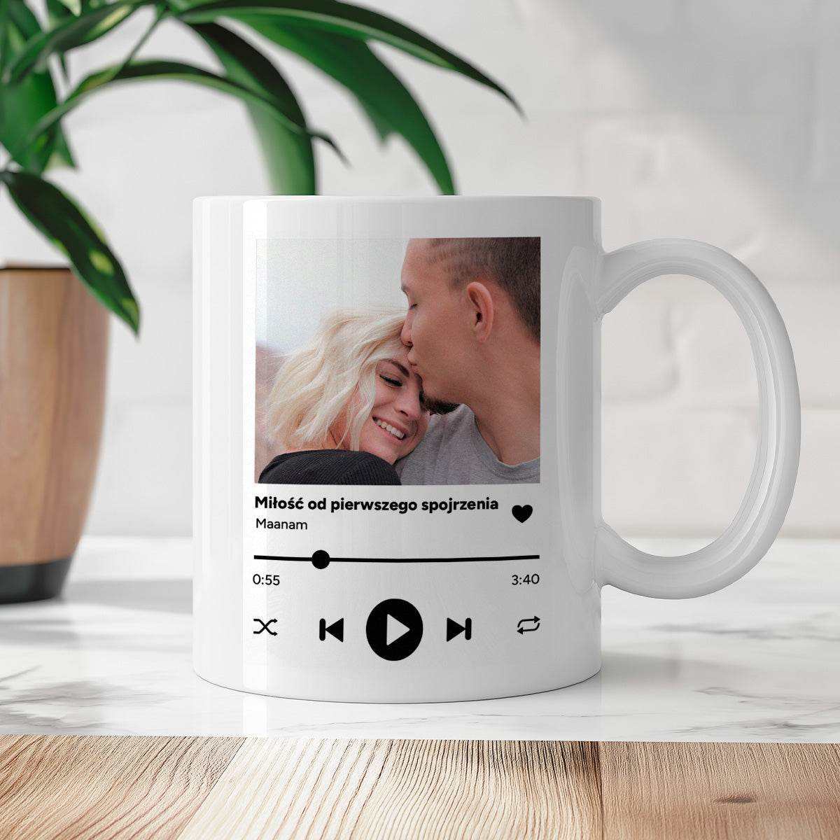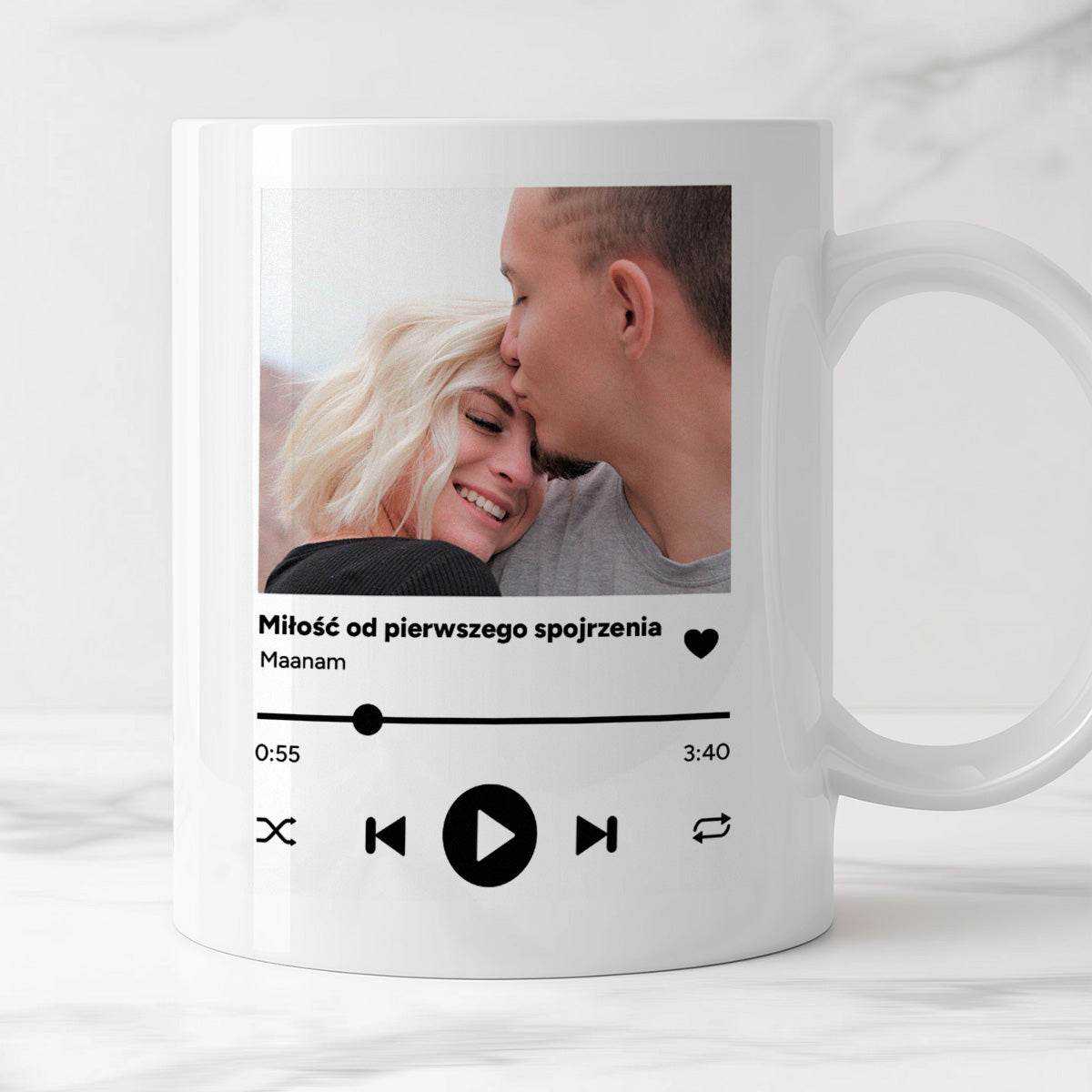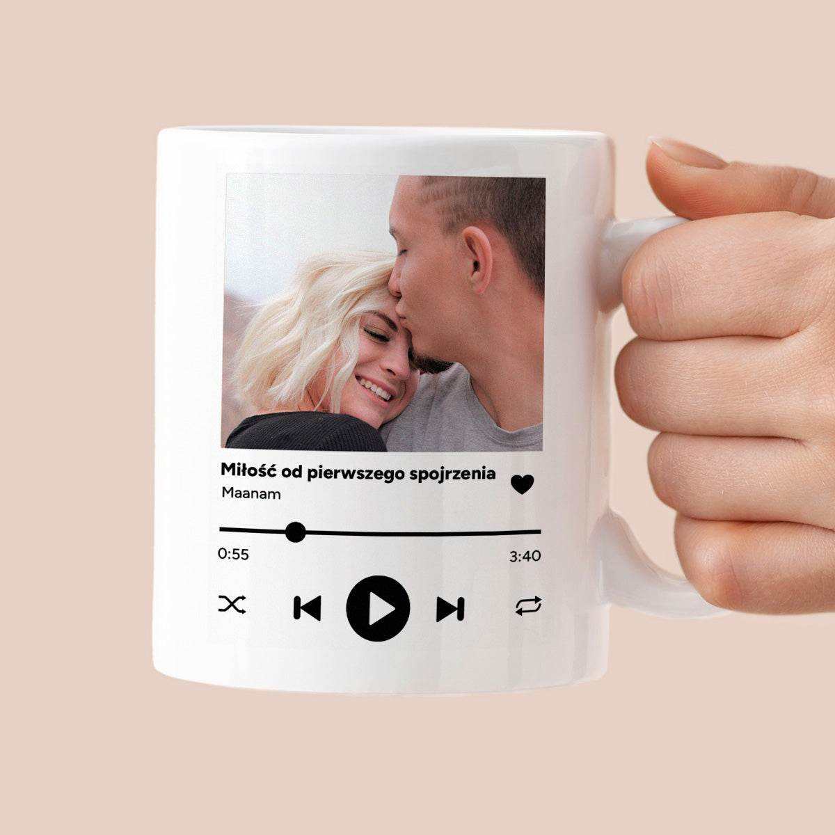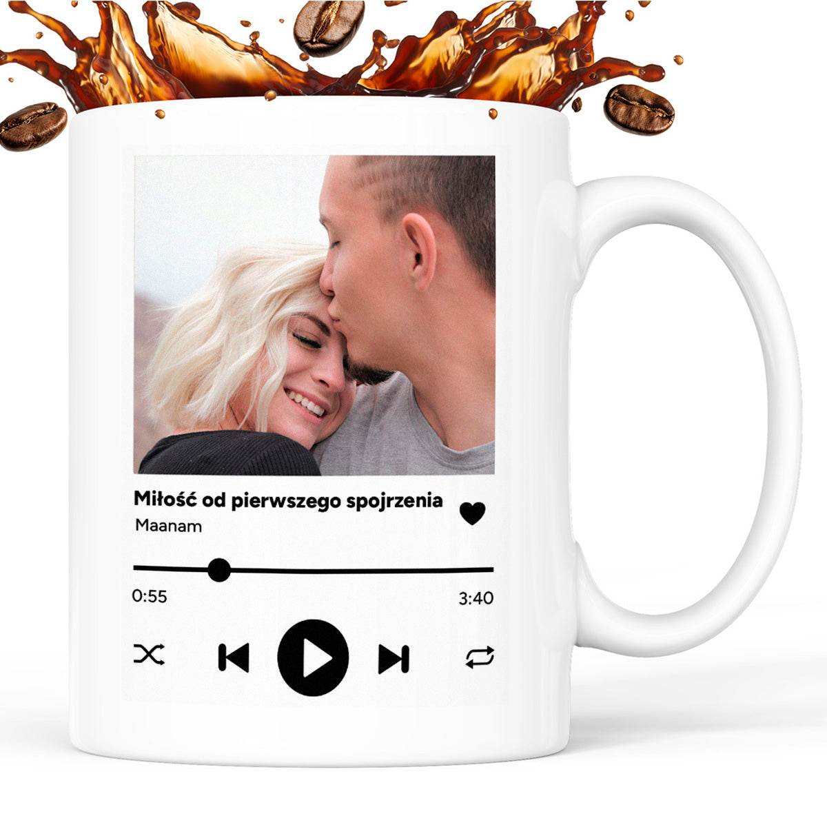 Kubek spersonalizowany z motywem ulubionego utworu ze zdjęciem - idealny sposób na wyrażenie swoich uczuć  i stworzenie jedynego w swoim rodzaju prezentu dla siebie lub bliskiej osoby. Z jeden strony kubka widoczny jest motyw odtwarzacza muzycznego z tytułem, wykonawcą i zdjęciem (wybranym przez Ciebie zdjęciem z ważnej chwili), a z drugiej strony widoczny jest kod QR przekierowujący do piosenki na Spotify.