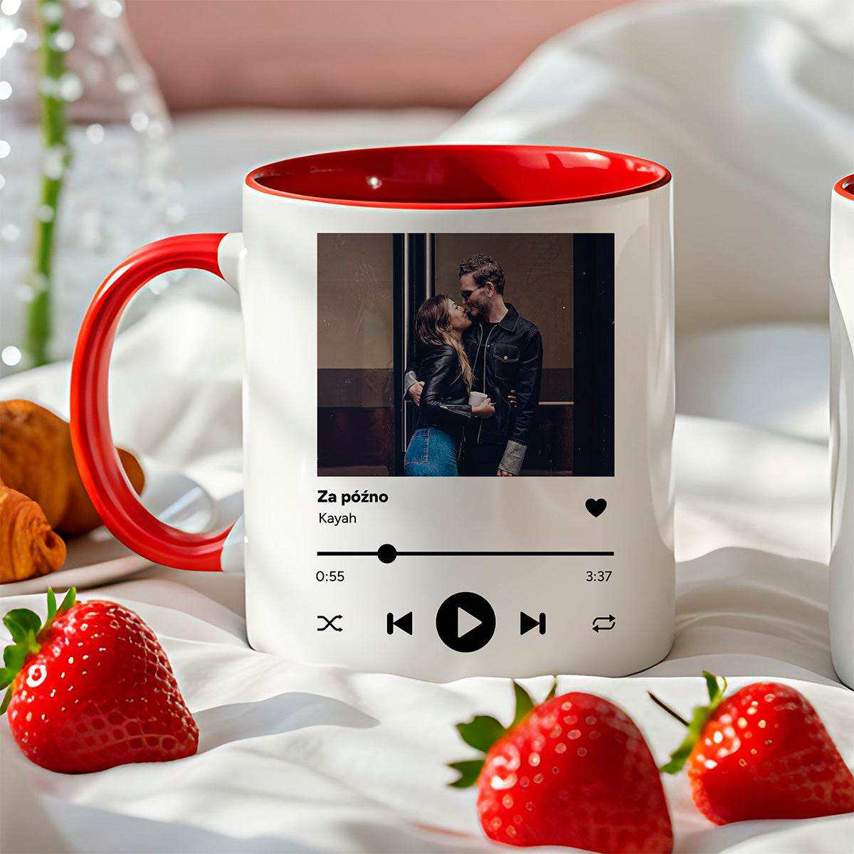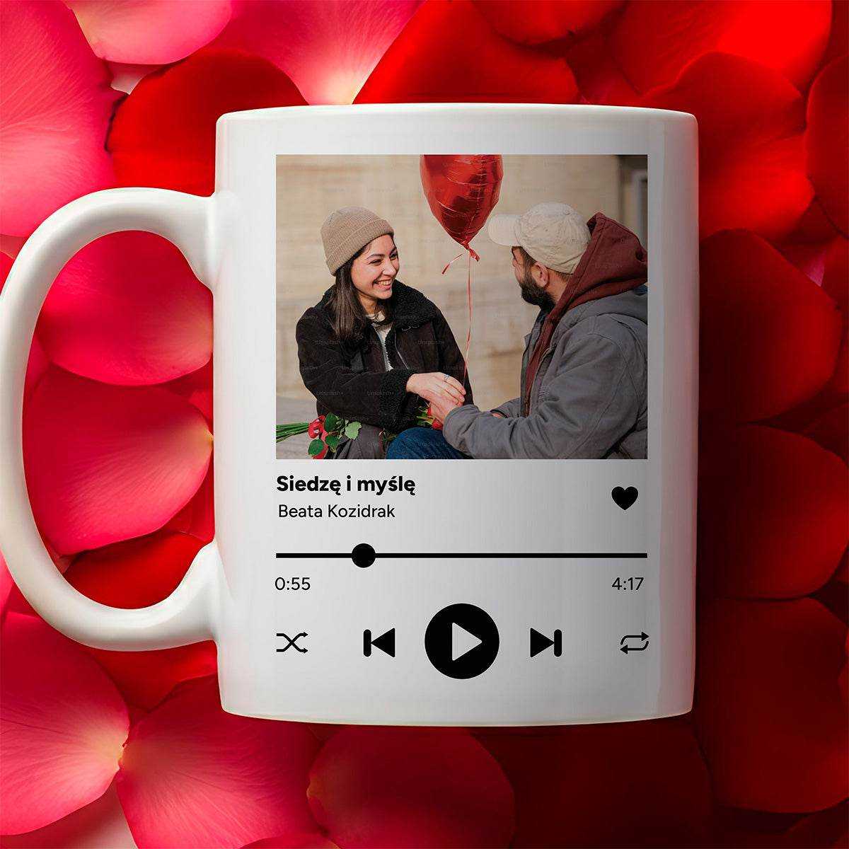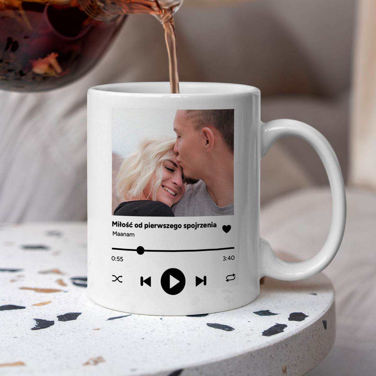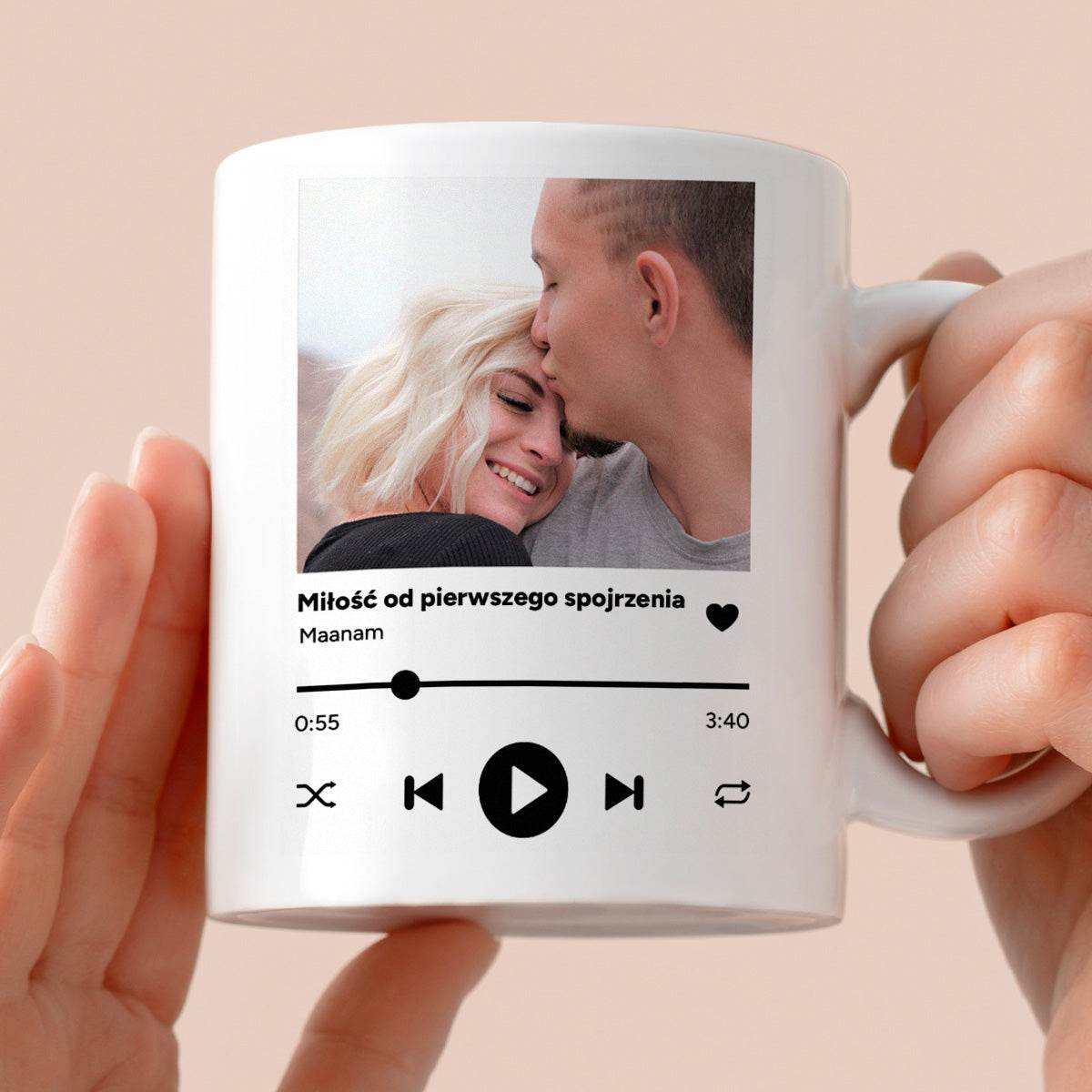 Kubek spersonalizowany z motywem ulubionego utworu ze zdjęciem - idealny sposób na wyrażenie swoich uczuć  i stworzenie jedynego w swoim rodzaju prezentu dla siebie lub bliskiej osoby. Z jeden strony kubka widoczny jest motyw odtwarzacza muzycznego z tytułem, wykonawcą i zdjęciem (wybranym przez Ciebie zdjęciem z ważnej chwili), a z drugiej strony widoczny jest kod QR przekierowujący do piosenki na Spotify.