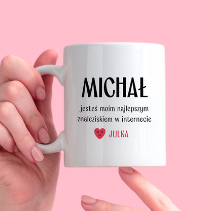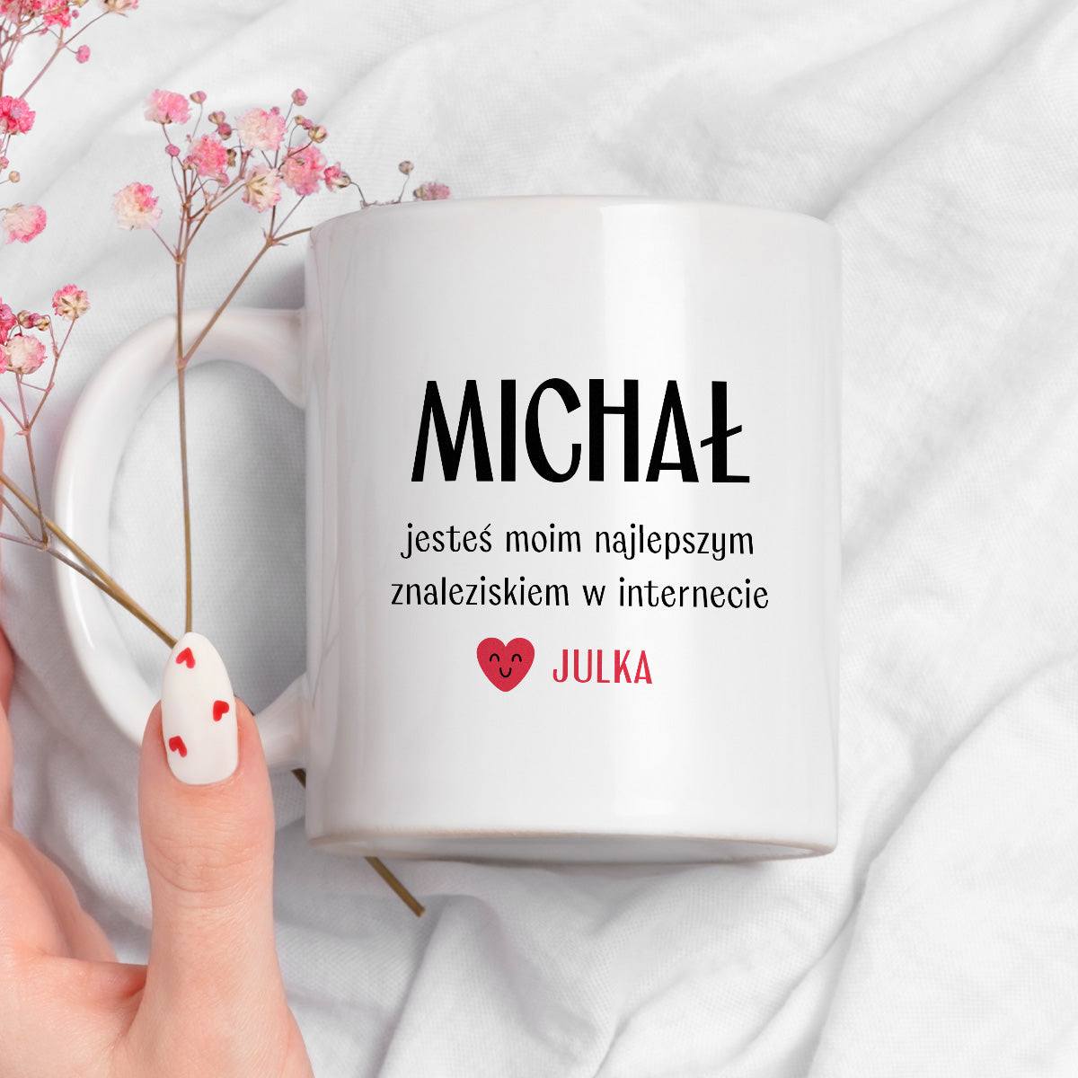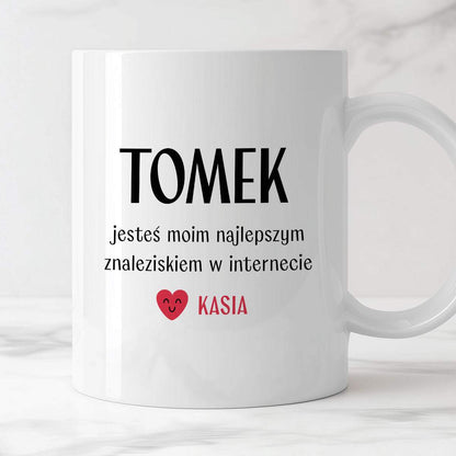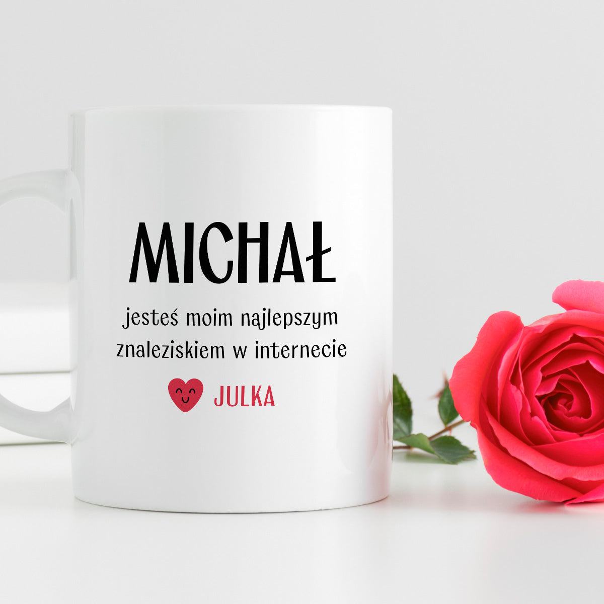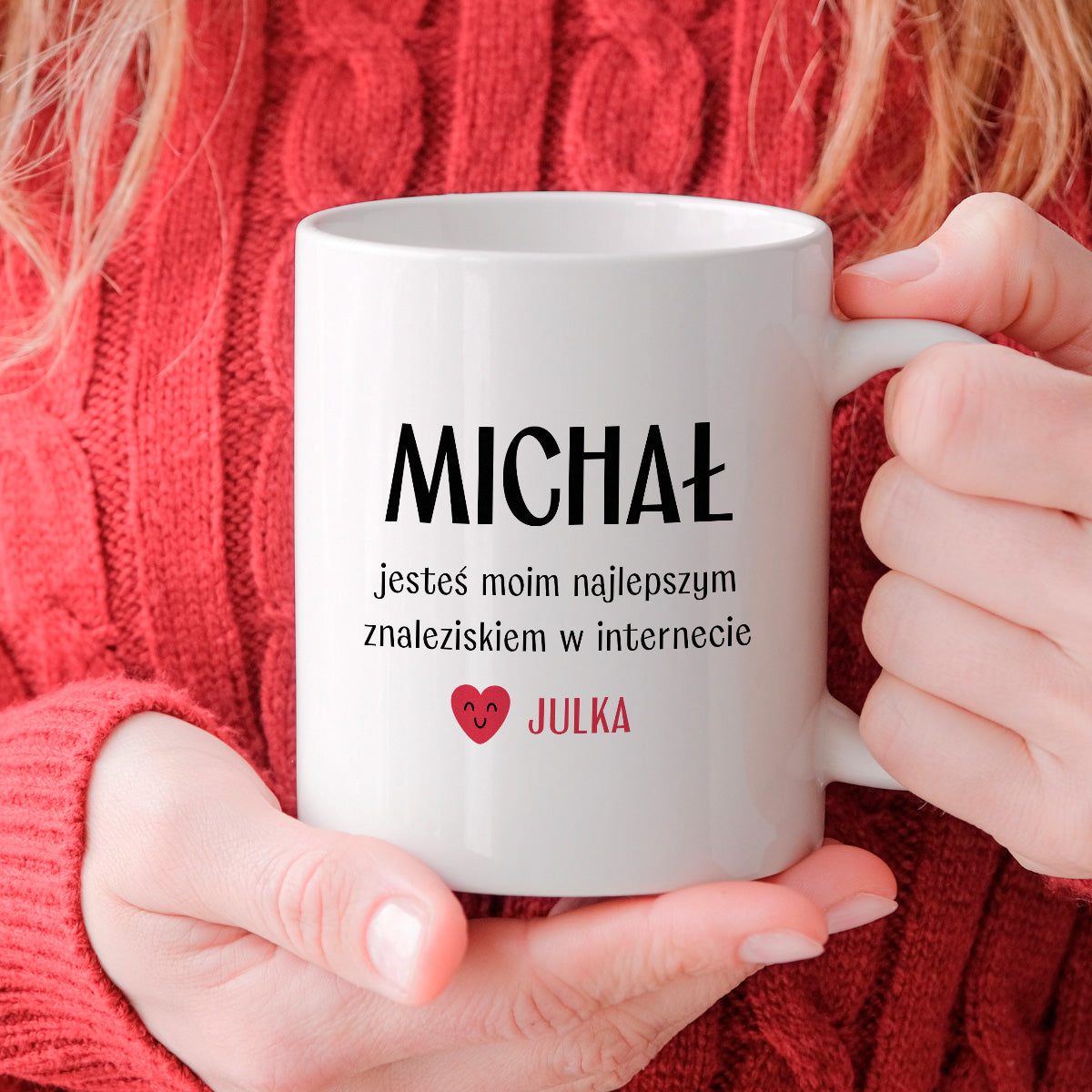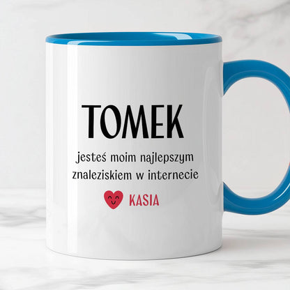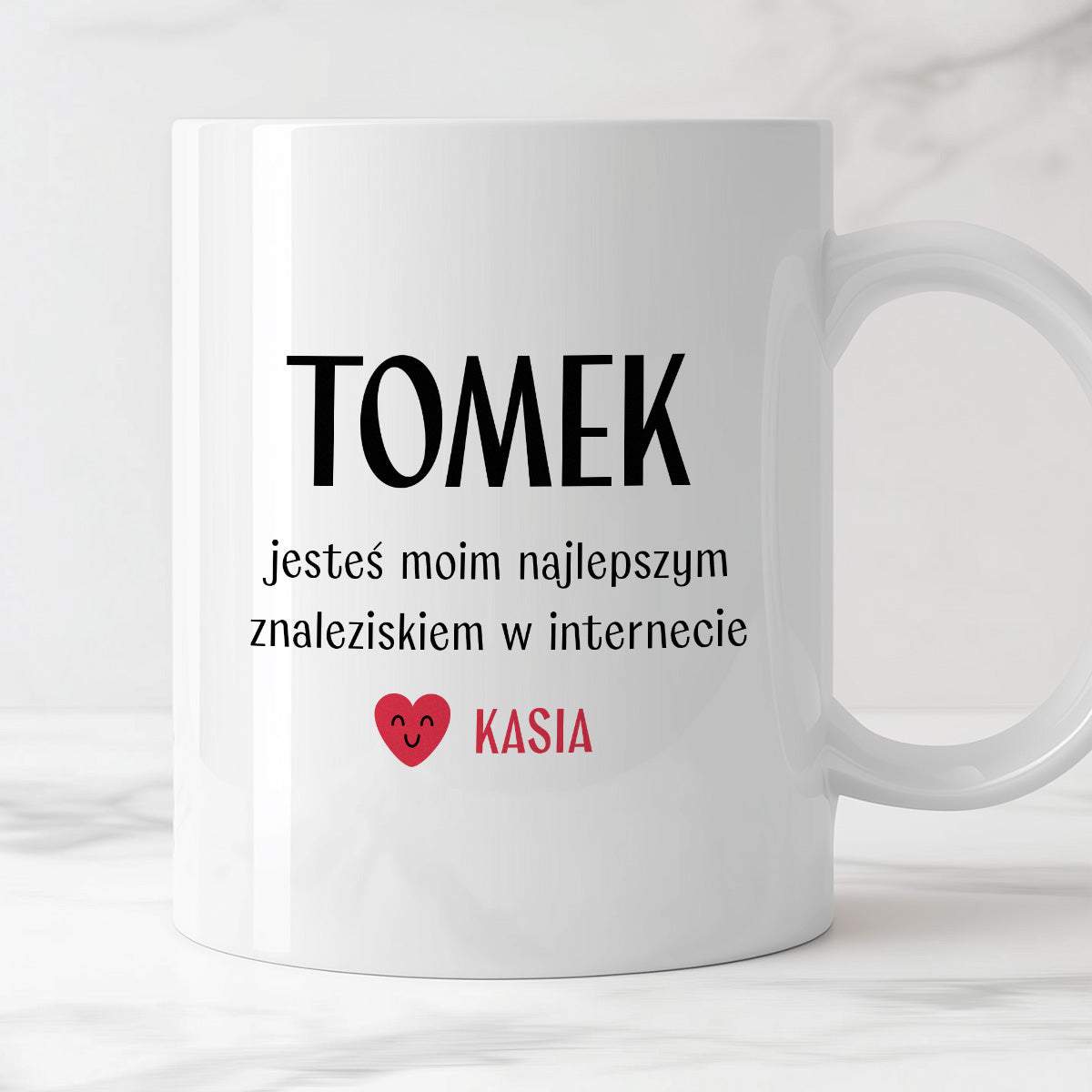 Przykład kubka dla osoby praworęcznejNa pierwszej stronie kubka (widocznej podczas picia) zostanie zamieszczony nadruk widoczny na zdjęciach danego produktu, a na drugiej imię zapisane czcionką taką samą jak na nadruku oraz przesłane zdjęcie.