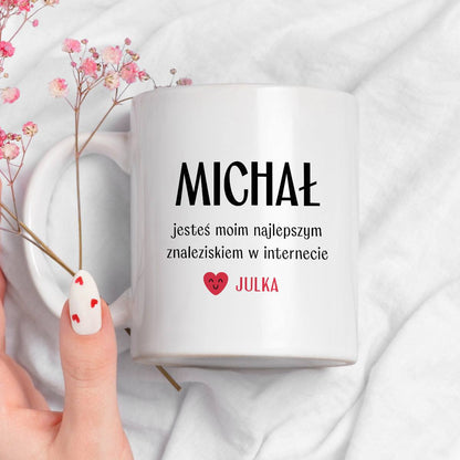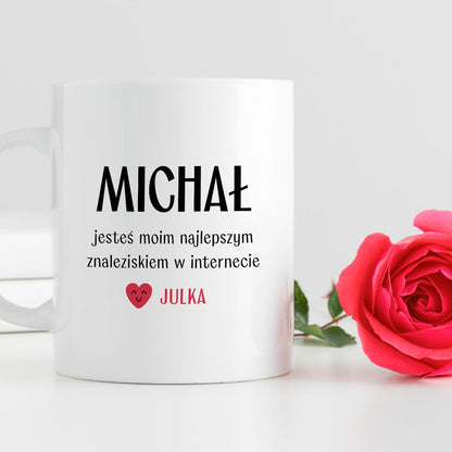 Kubek spersonalizowany z nadrukiem "Jesteś moim najlepszym znaleziskiem w internecie" [2 imiona] - WALENTYNKI - FB