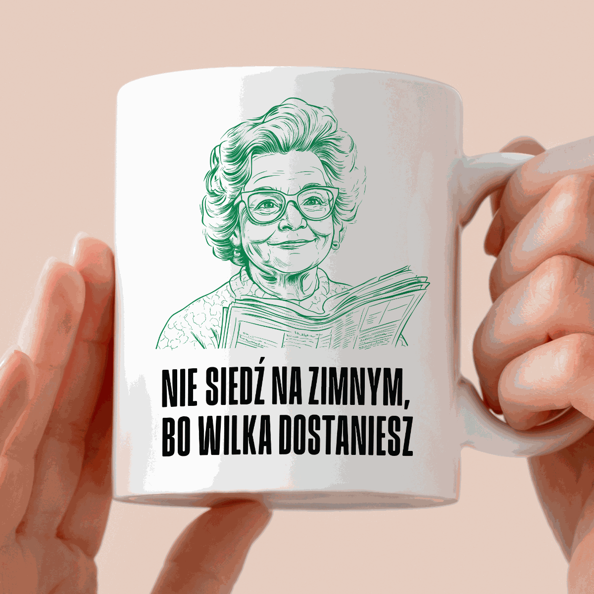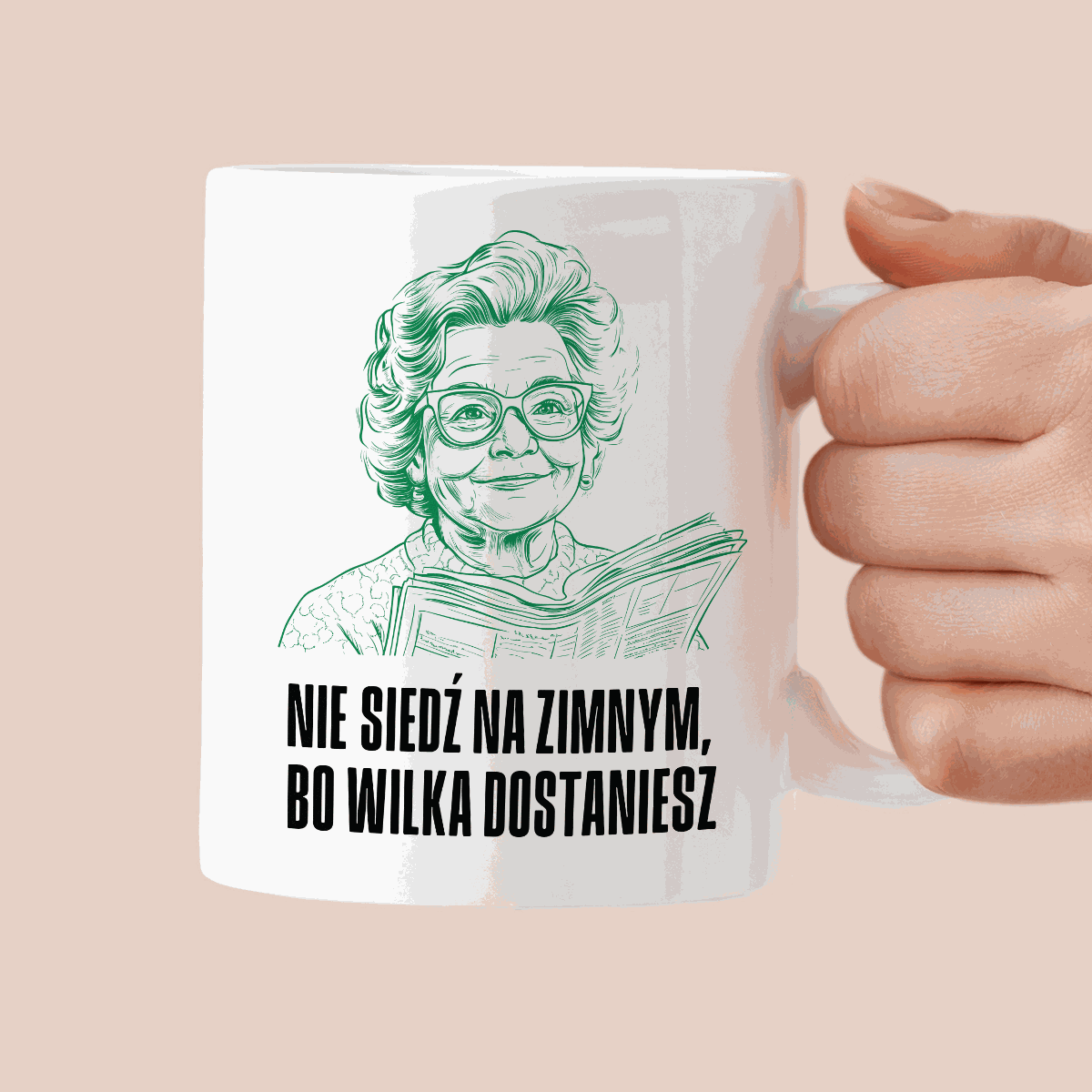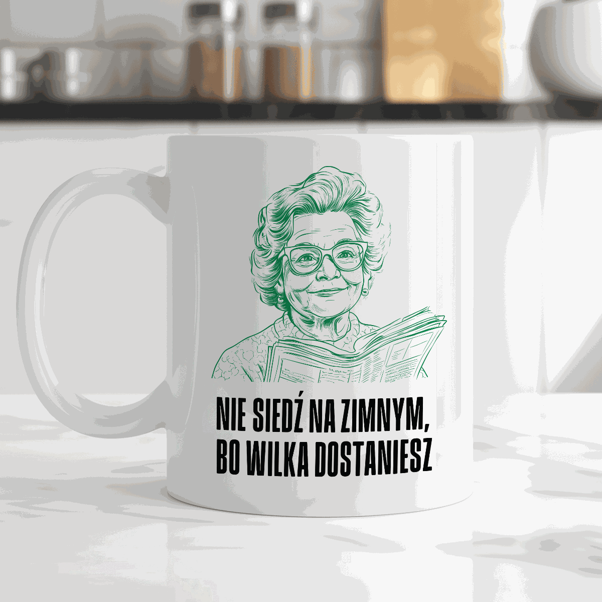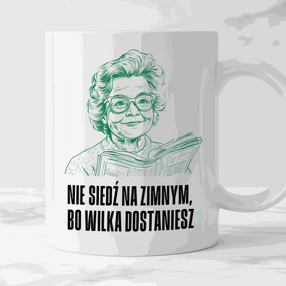 Kubek z cytatem Babci "Nie siedź na zimny, bo wilka dostaniesz"