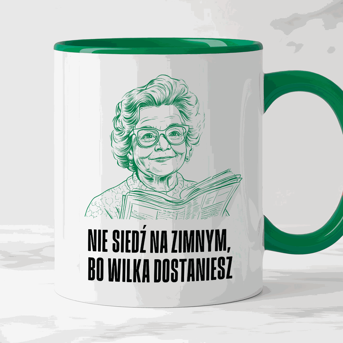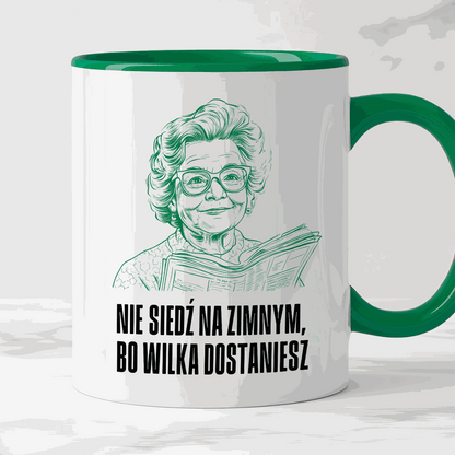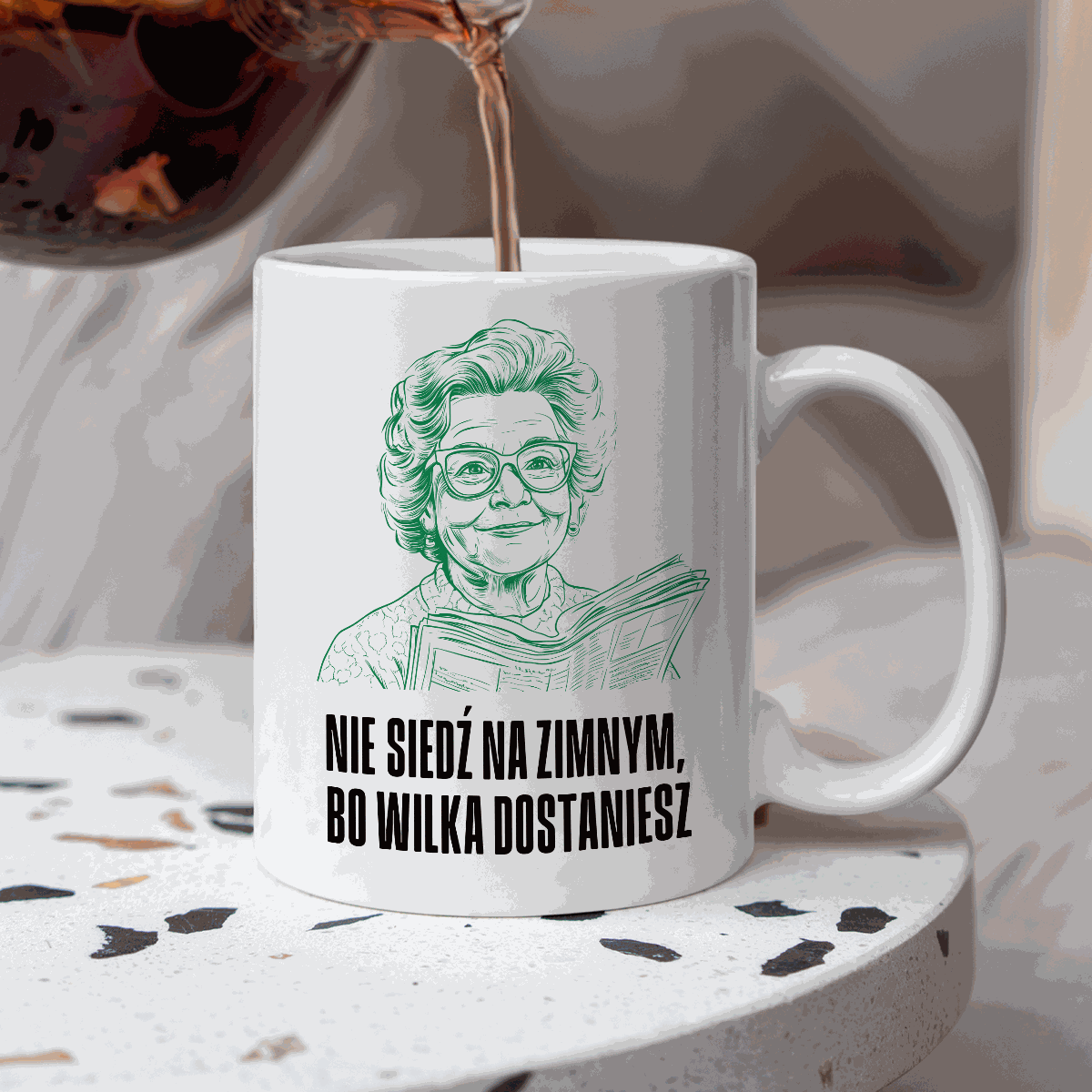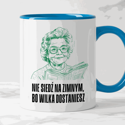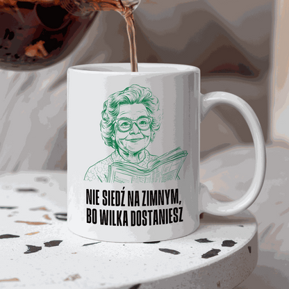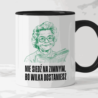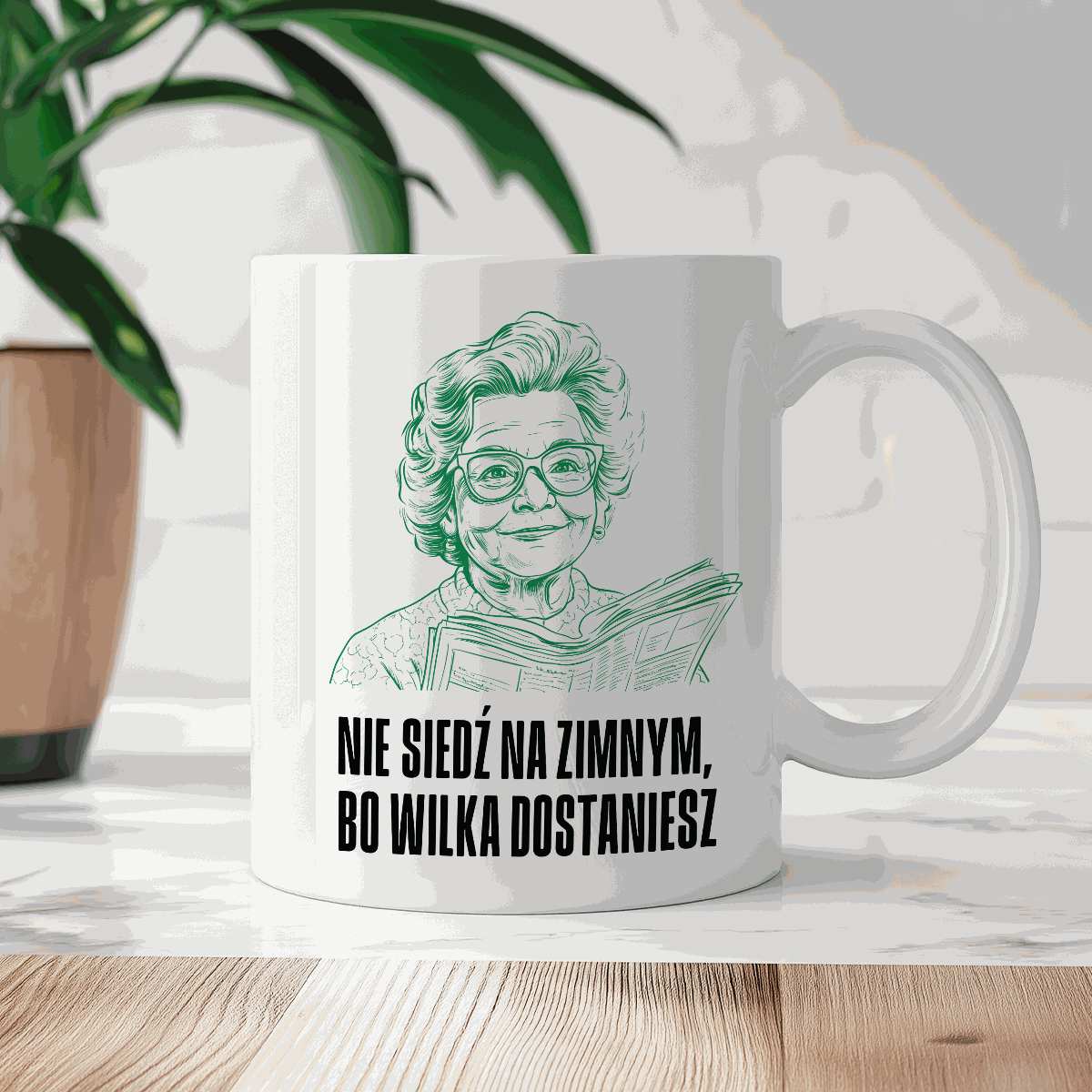 Kubek z cytatem Babci "Nie siedź na zimny, bo wilka dostaniesz"