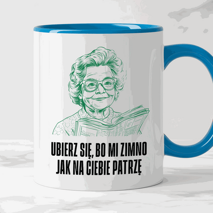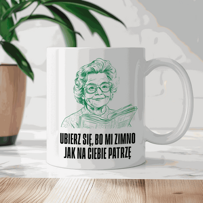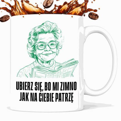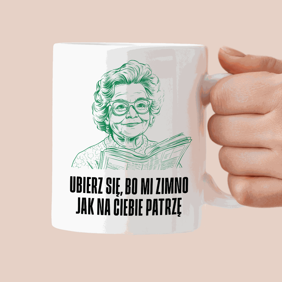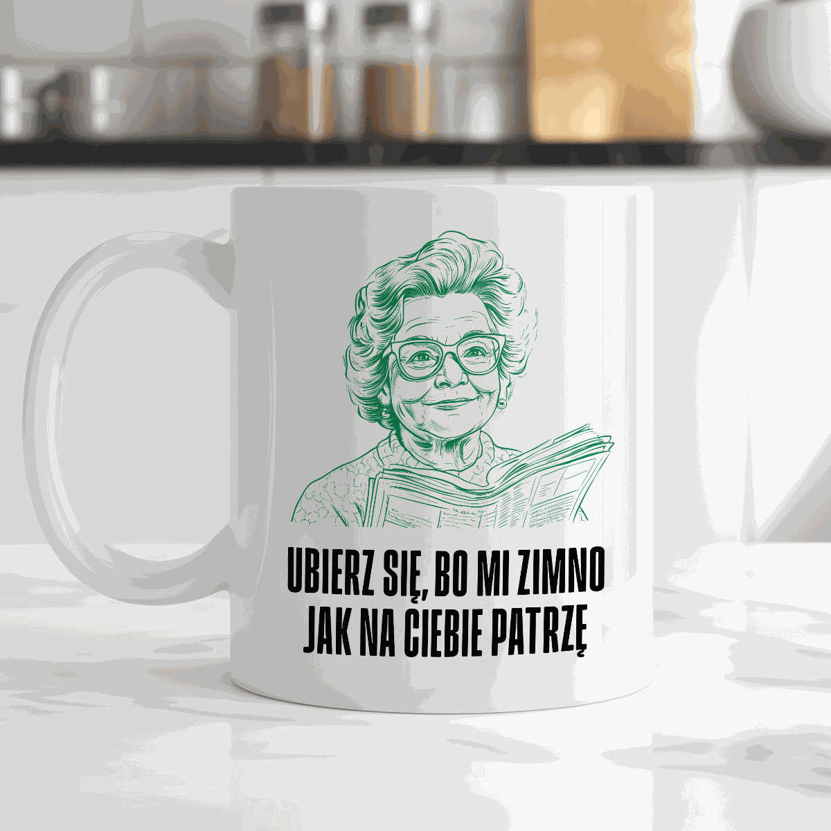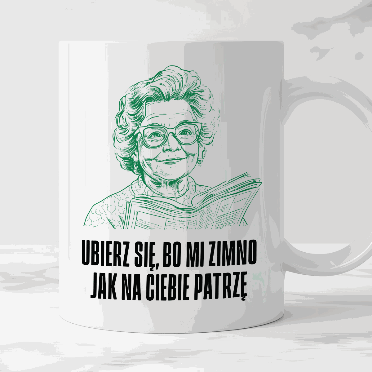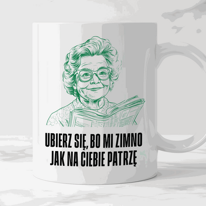 Kubek z cytatem Babci "Ubierz się, bo mi zimno jak na Ciebie patrzę"