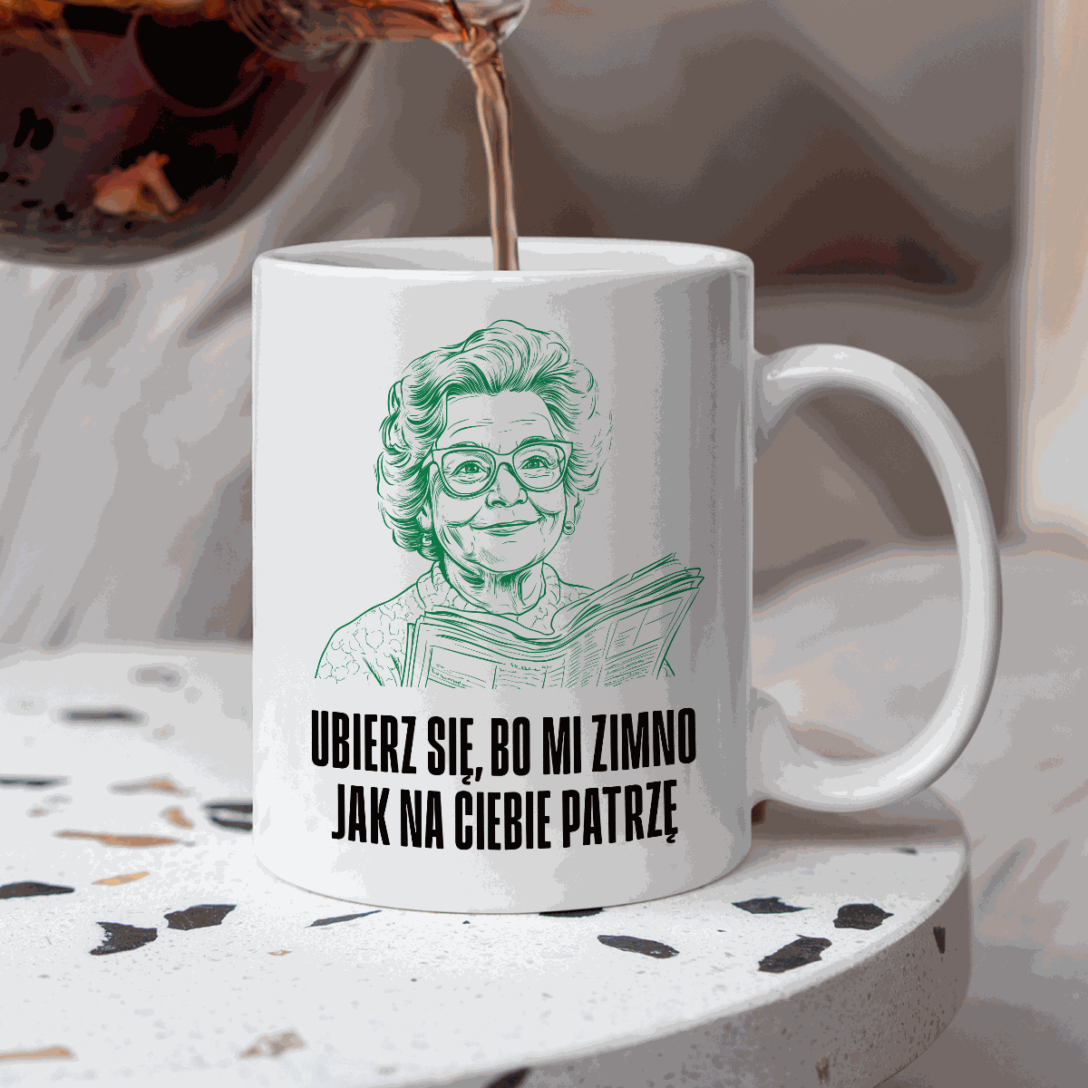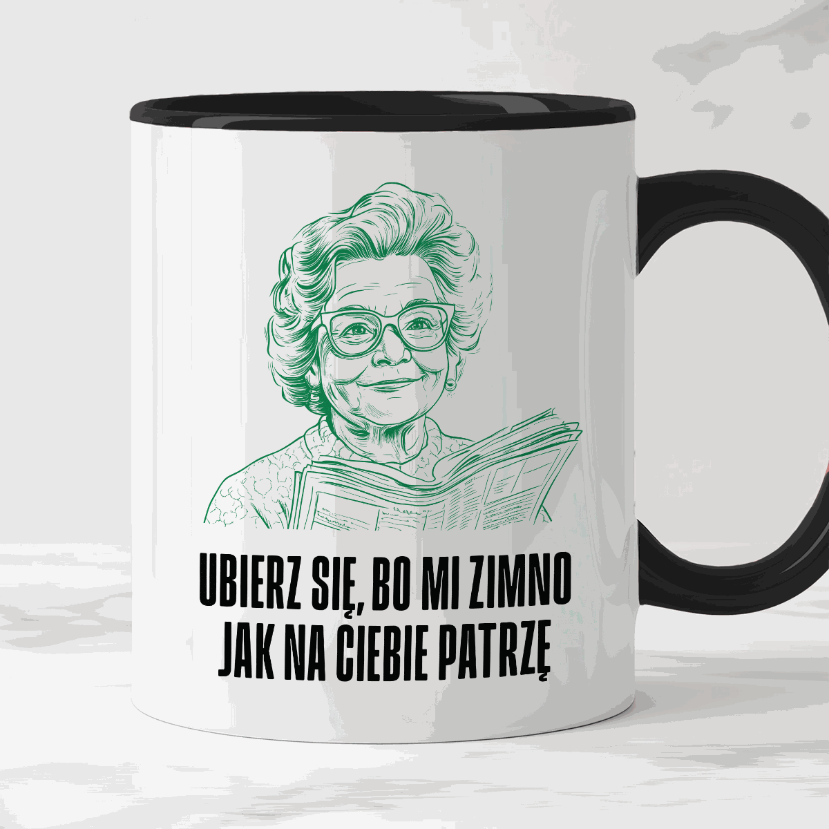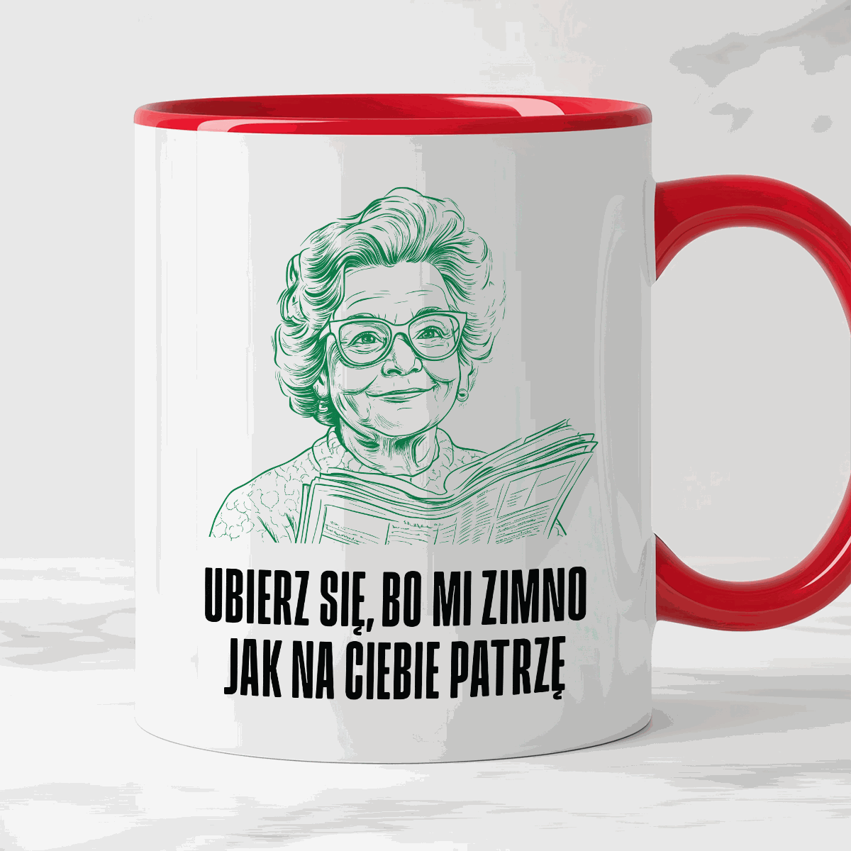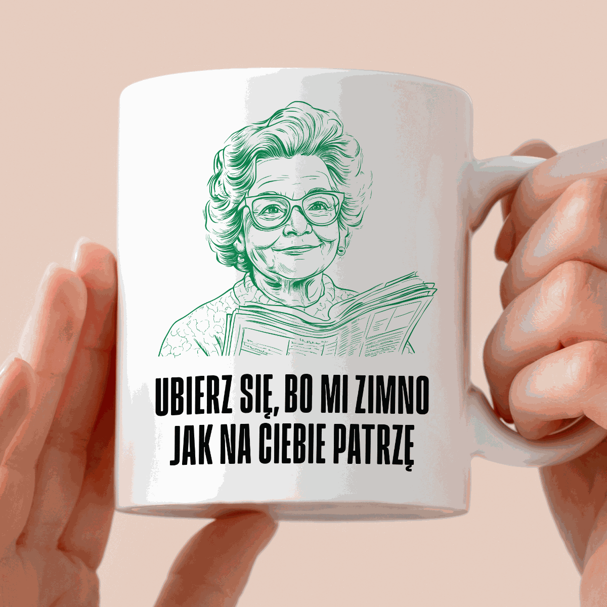 Kubek z cytatem Babci "Ubierz się, bo mi zimno jak na Ciebie patrzę"