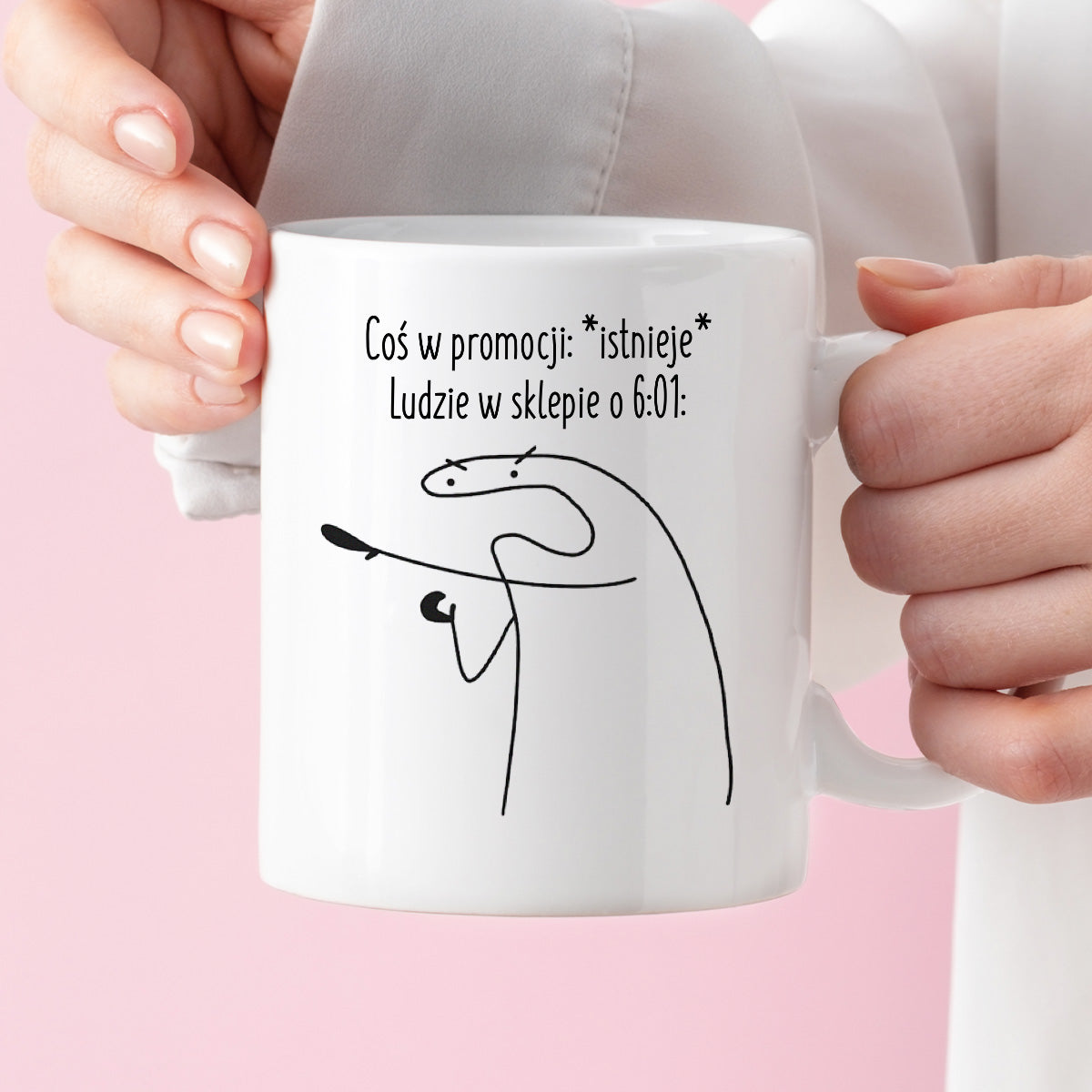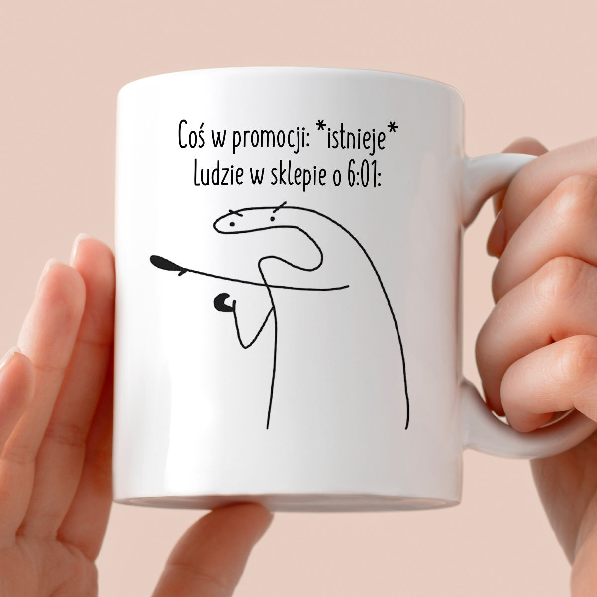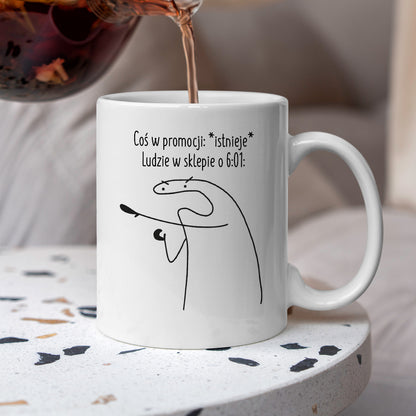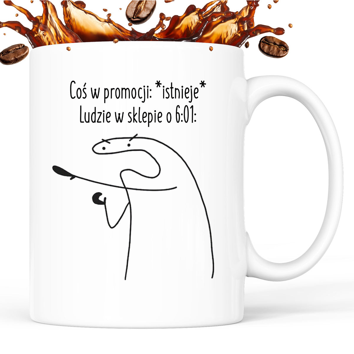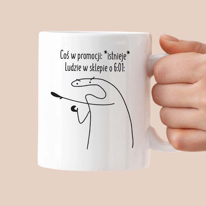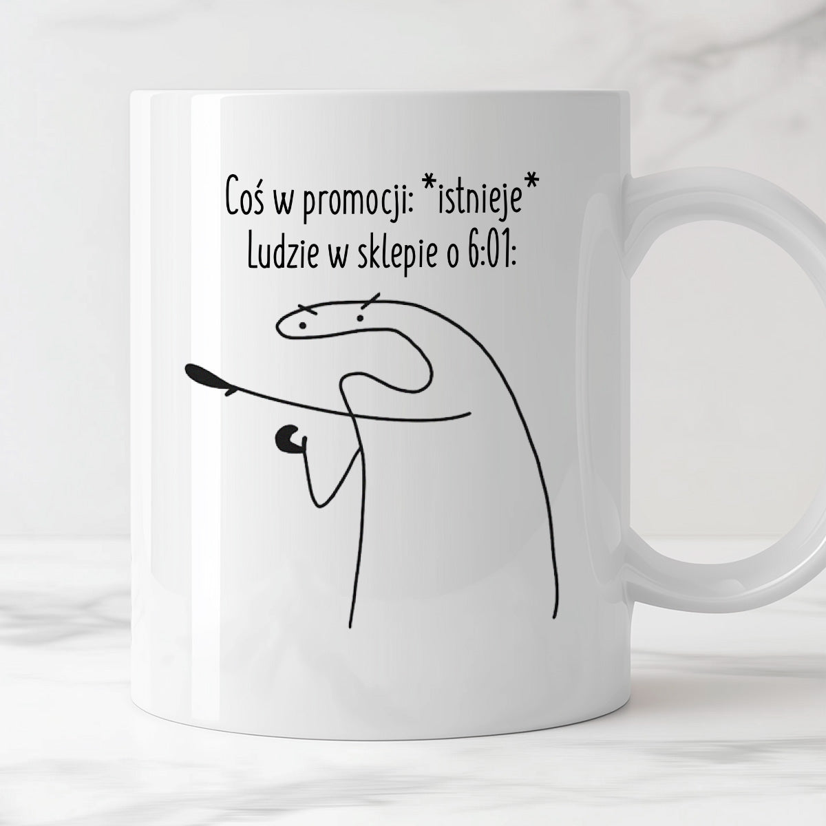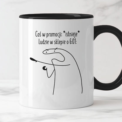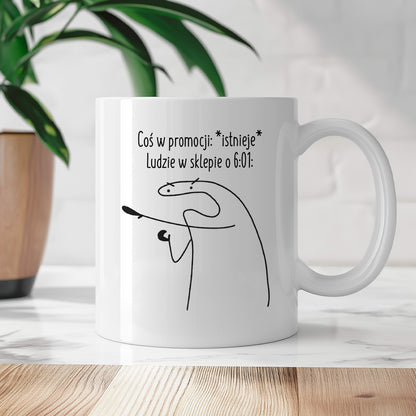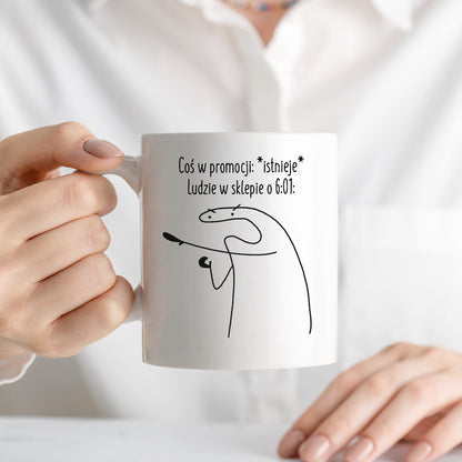 Kubek z nadrukiem "Coś w promocji: *istnieje*, ludzie w sklepie o 6:01:"