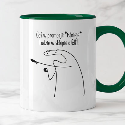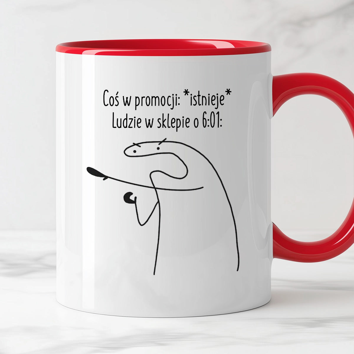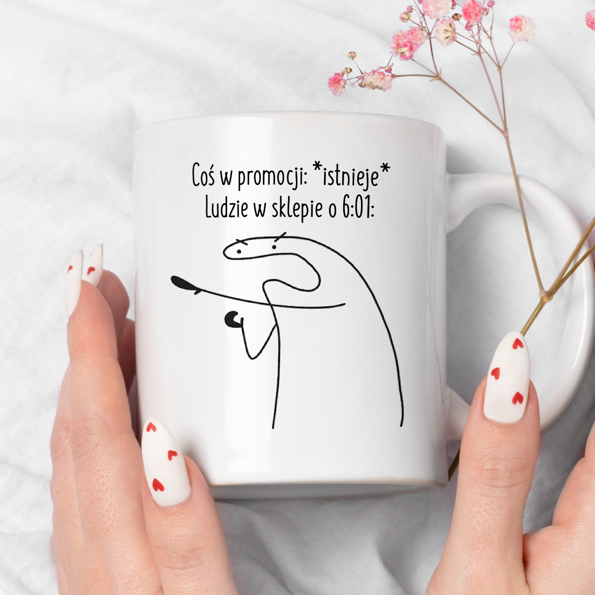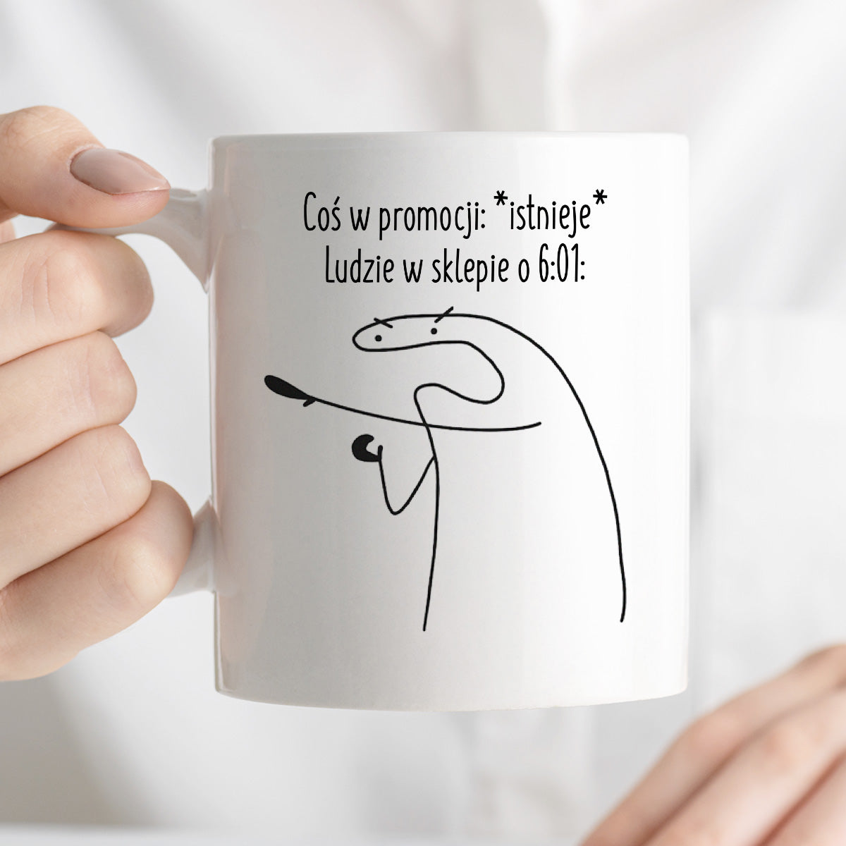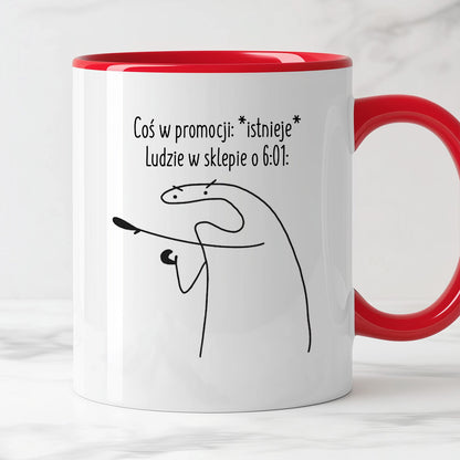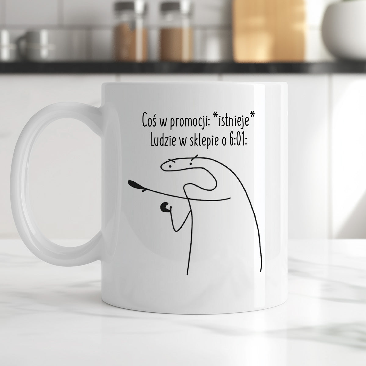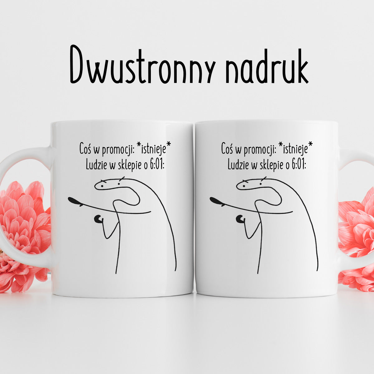 Kubek z nadrukiem "Coś w promocji: *istnieje*, ludzie w sklepie o 6:01:"