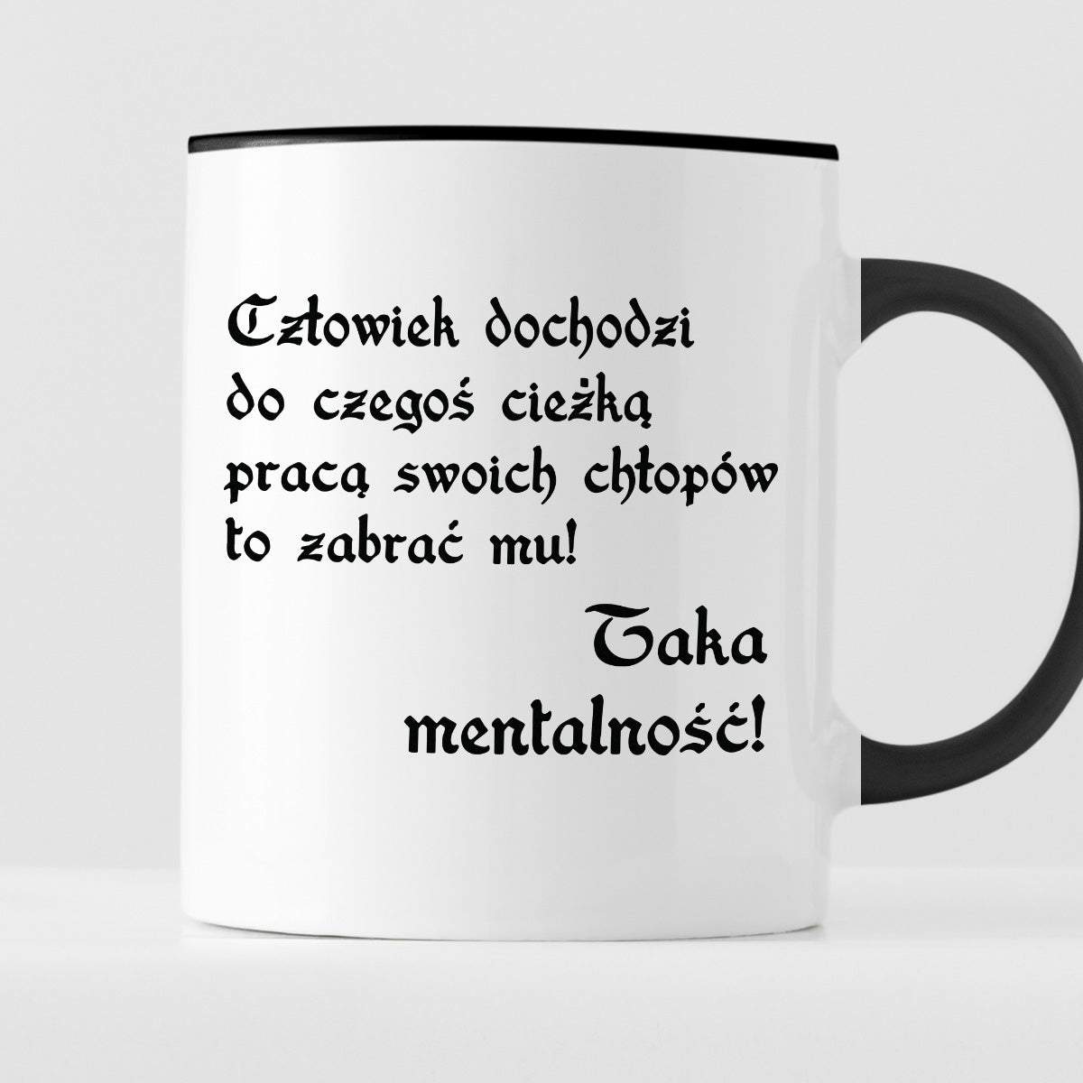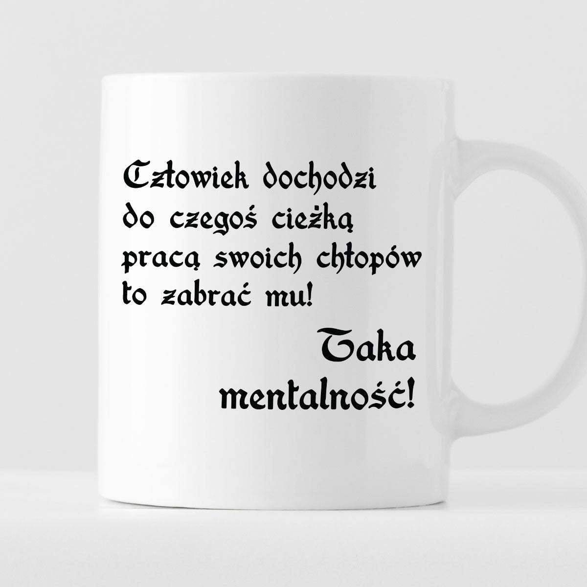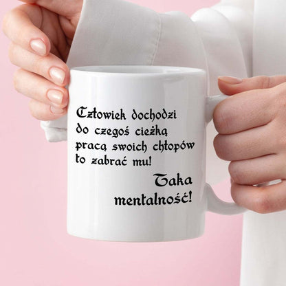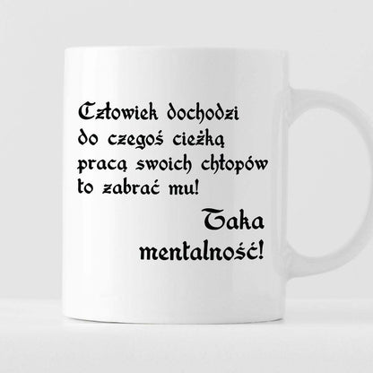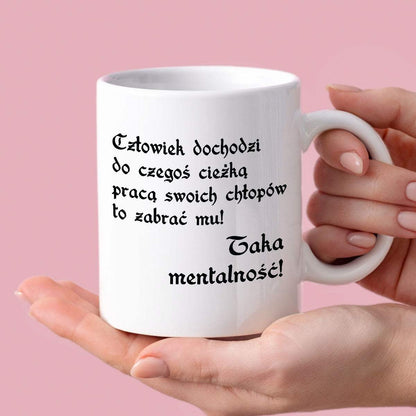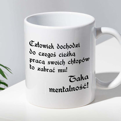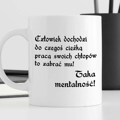 Kubek z nadrukiem "Człowiek dochodzi do czegoś ciężką pracą swoich chłopów, to zabrać mu! Taka mentalność!" 330 ml