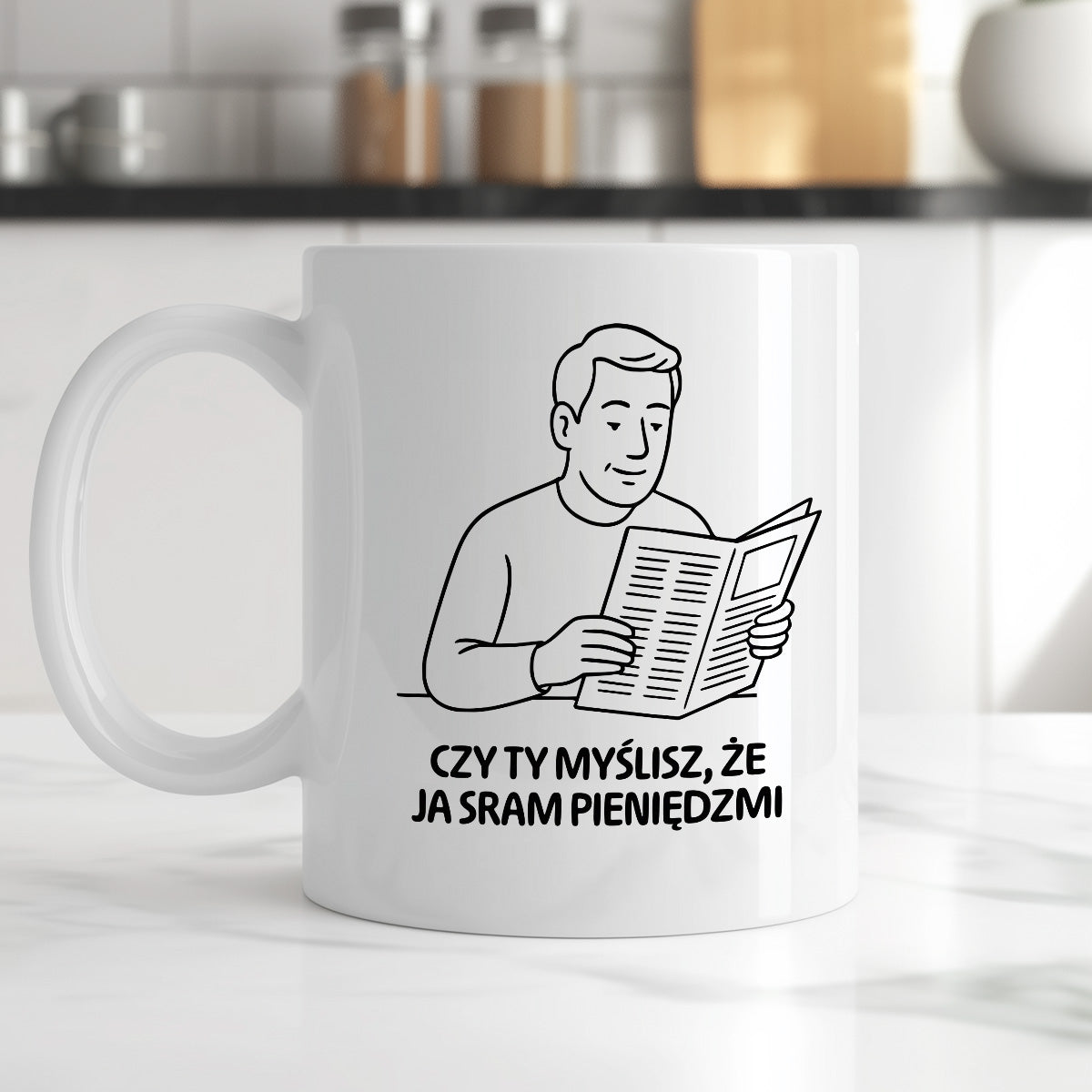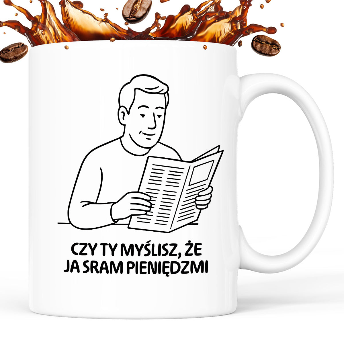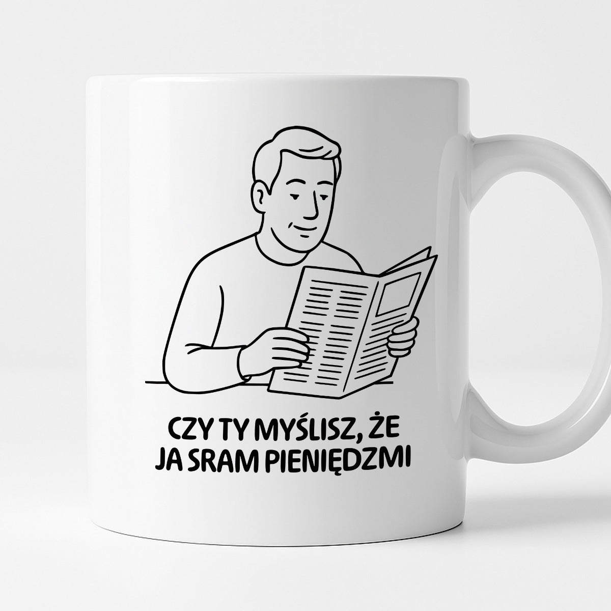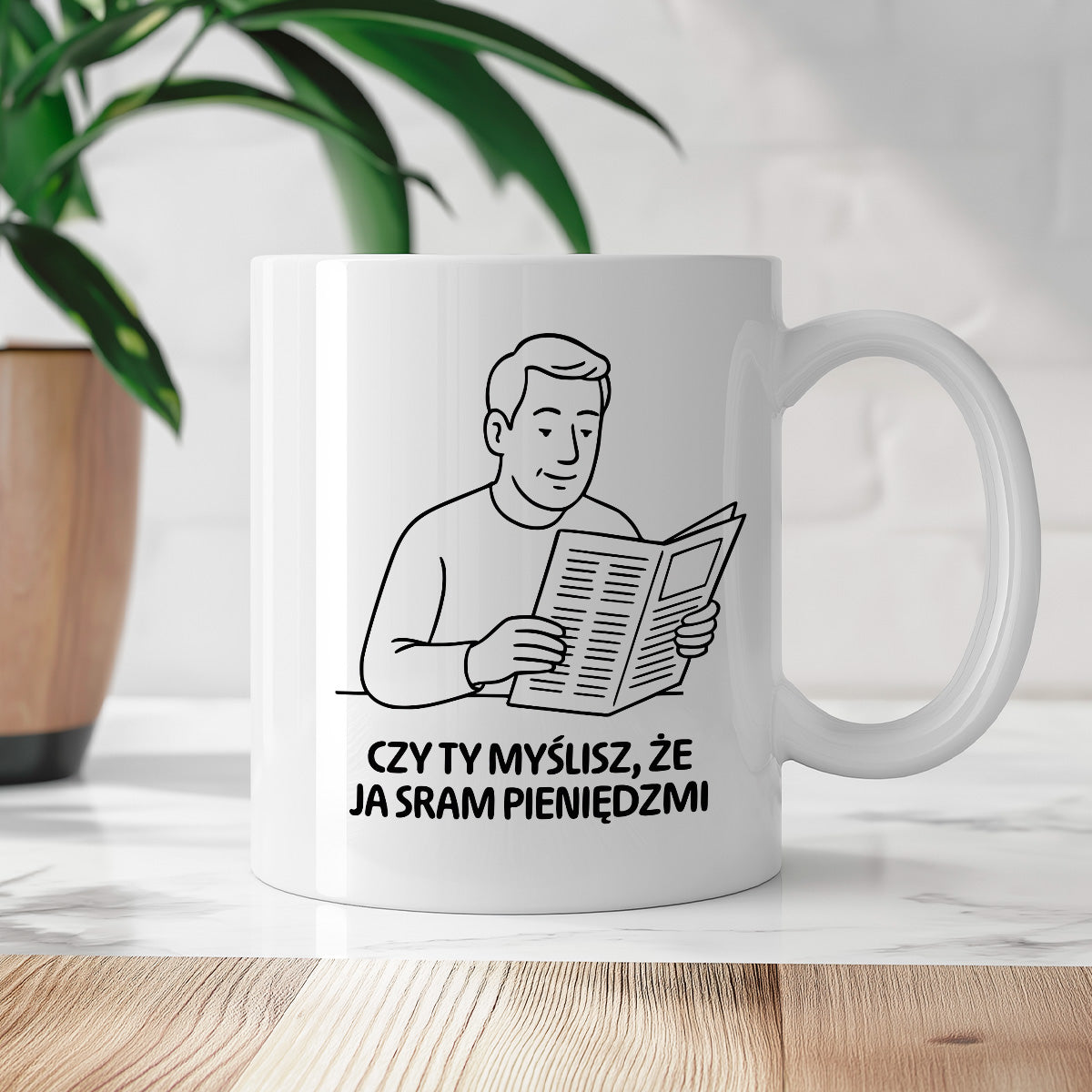 Kubek z nadrukiem "Czy Ty myślisz, że ja sram pieniędzmi" – prezent na Dzień Taty z przymrużeniem oka