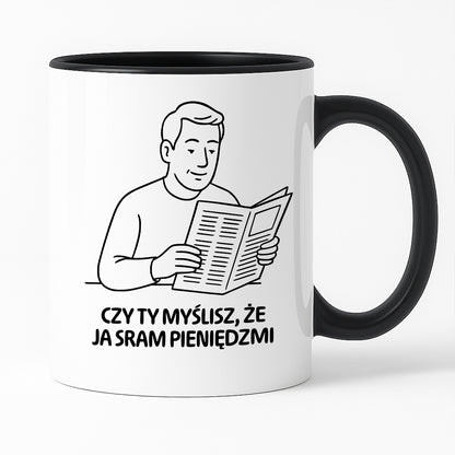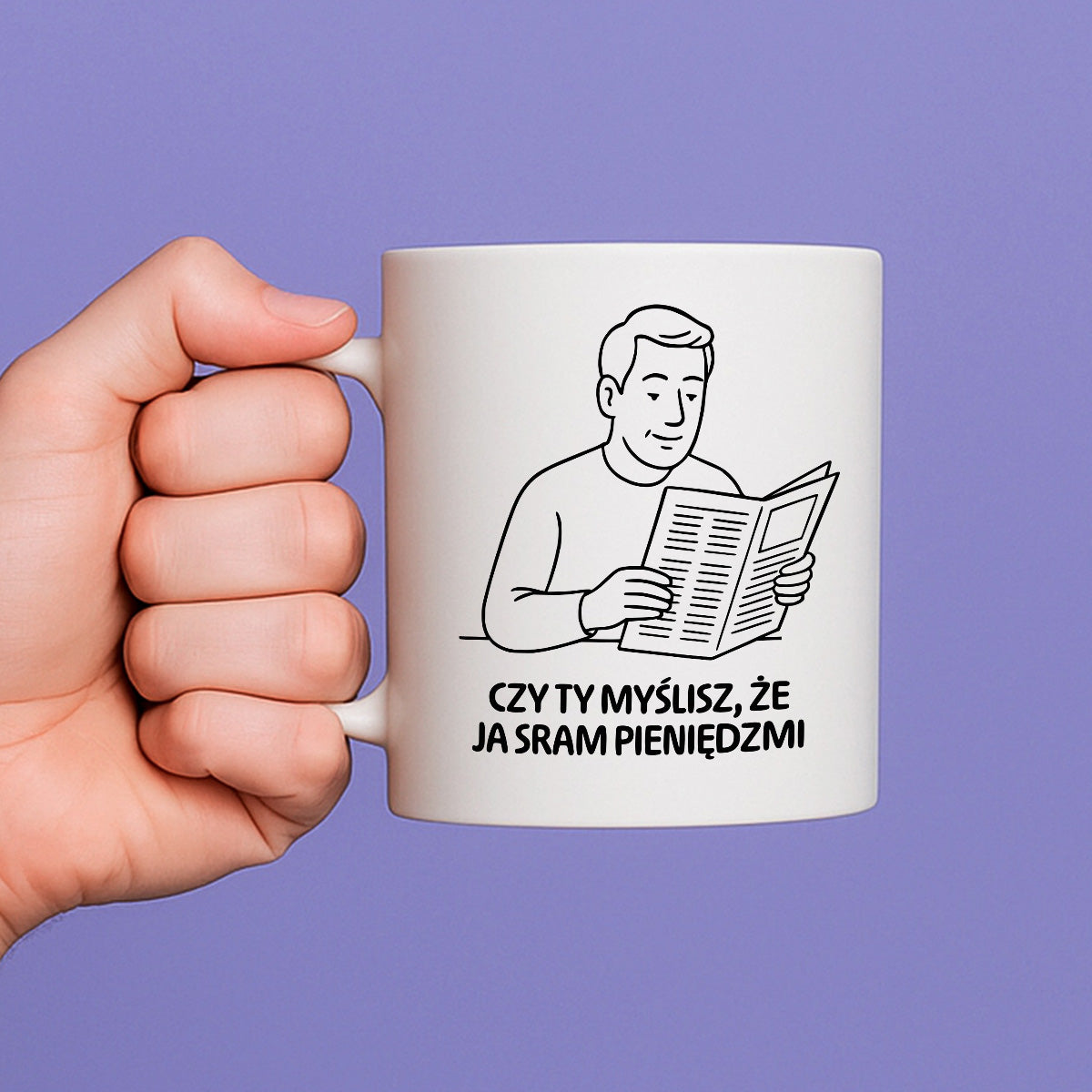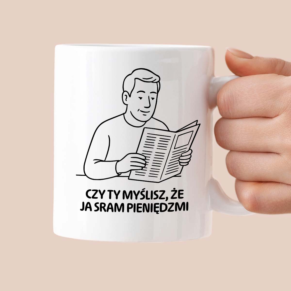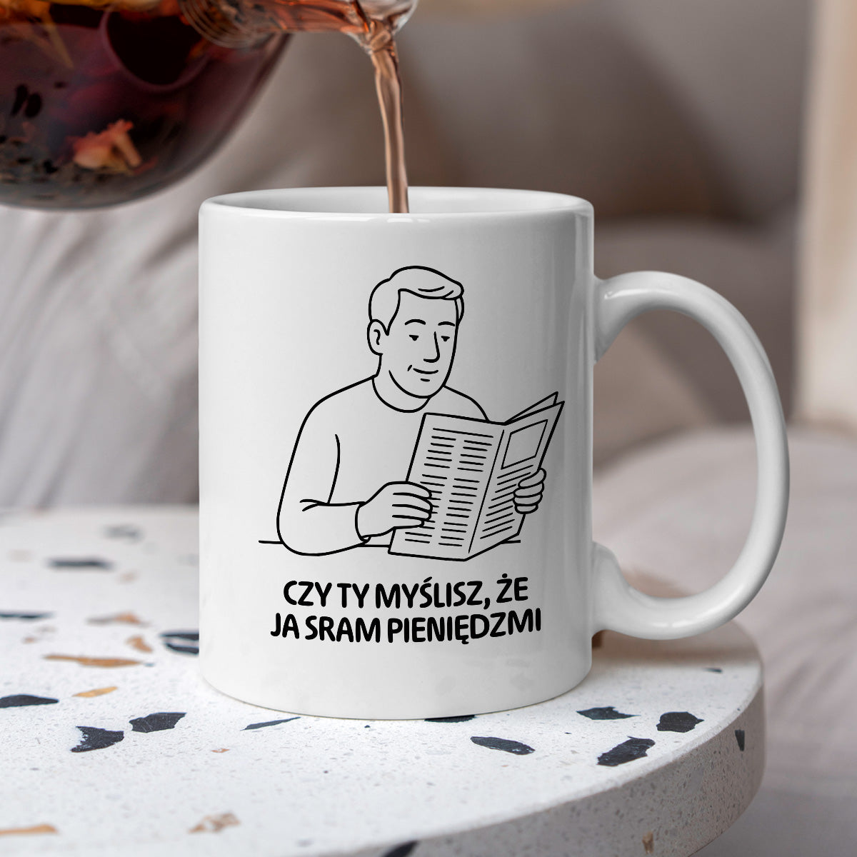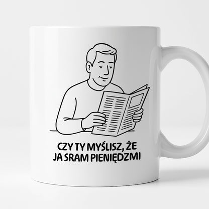 Kubek z nadrukiem "Czy Ty myślisz, że ja sram pieniędzmi" – prezent na Dzień Taty z przymrużeniem oka