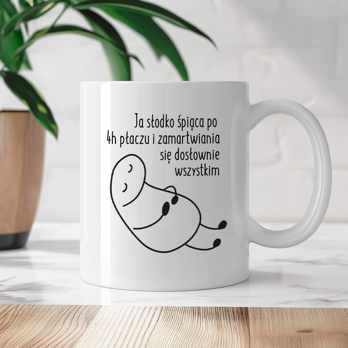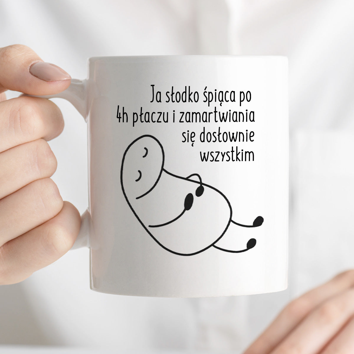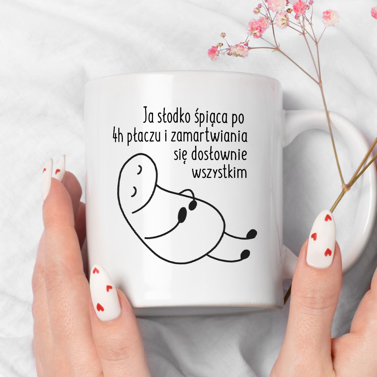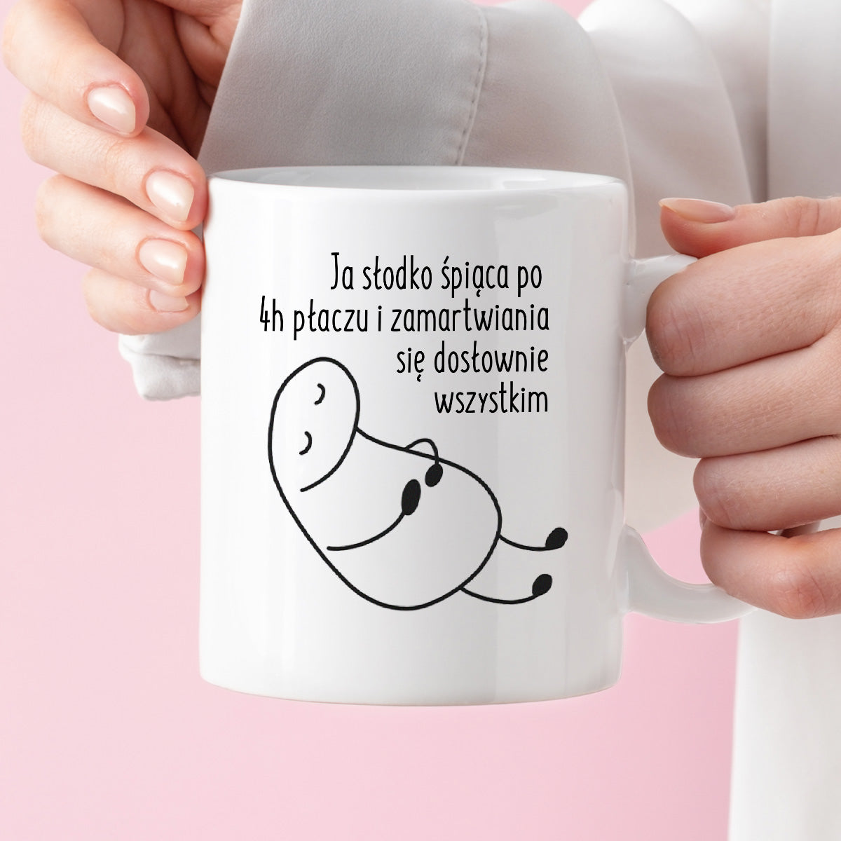 Kubek z nadrukiem "Ja słodko śpiąca po 4h płaczu i zamartwiania się dosłownie wszystkim"