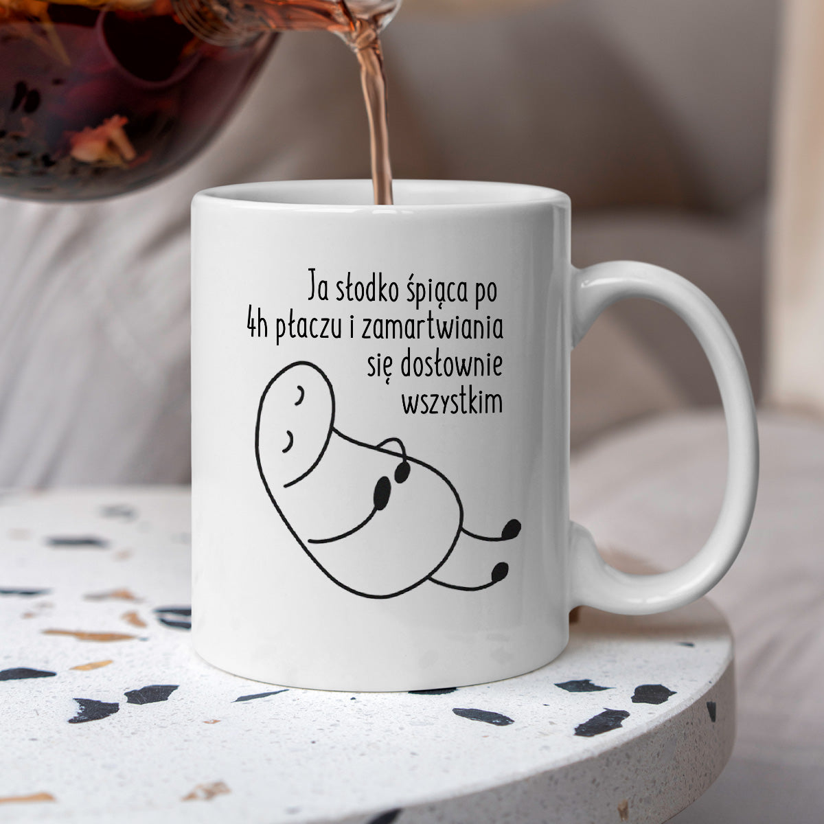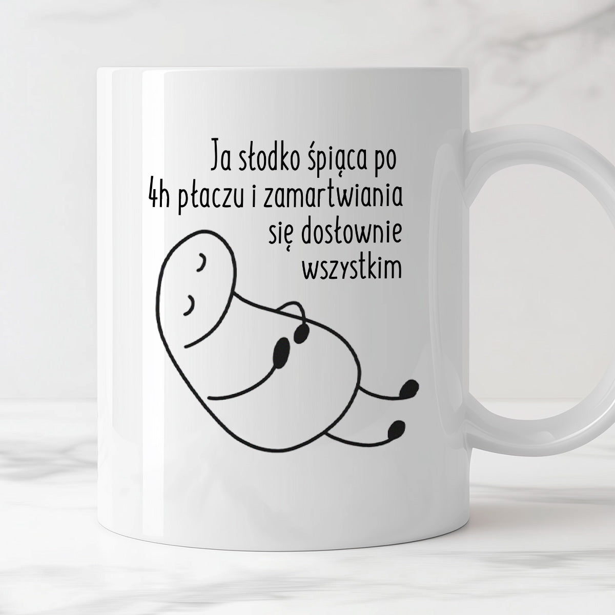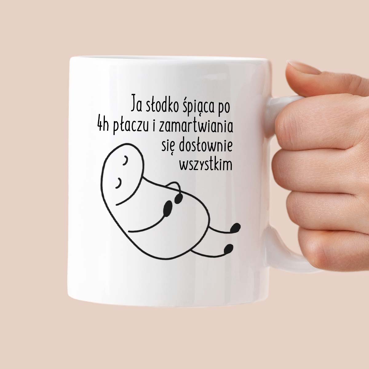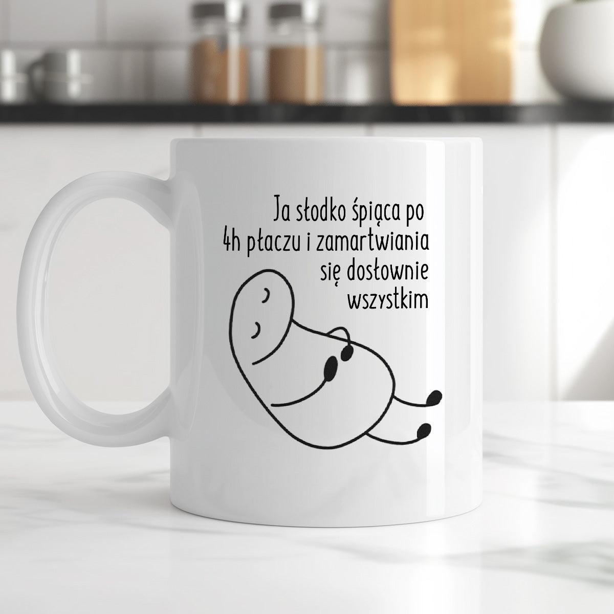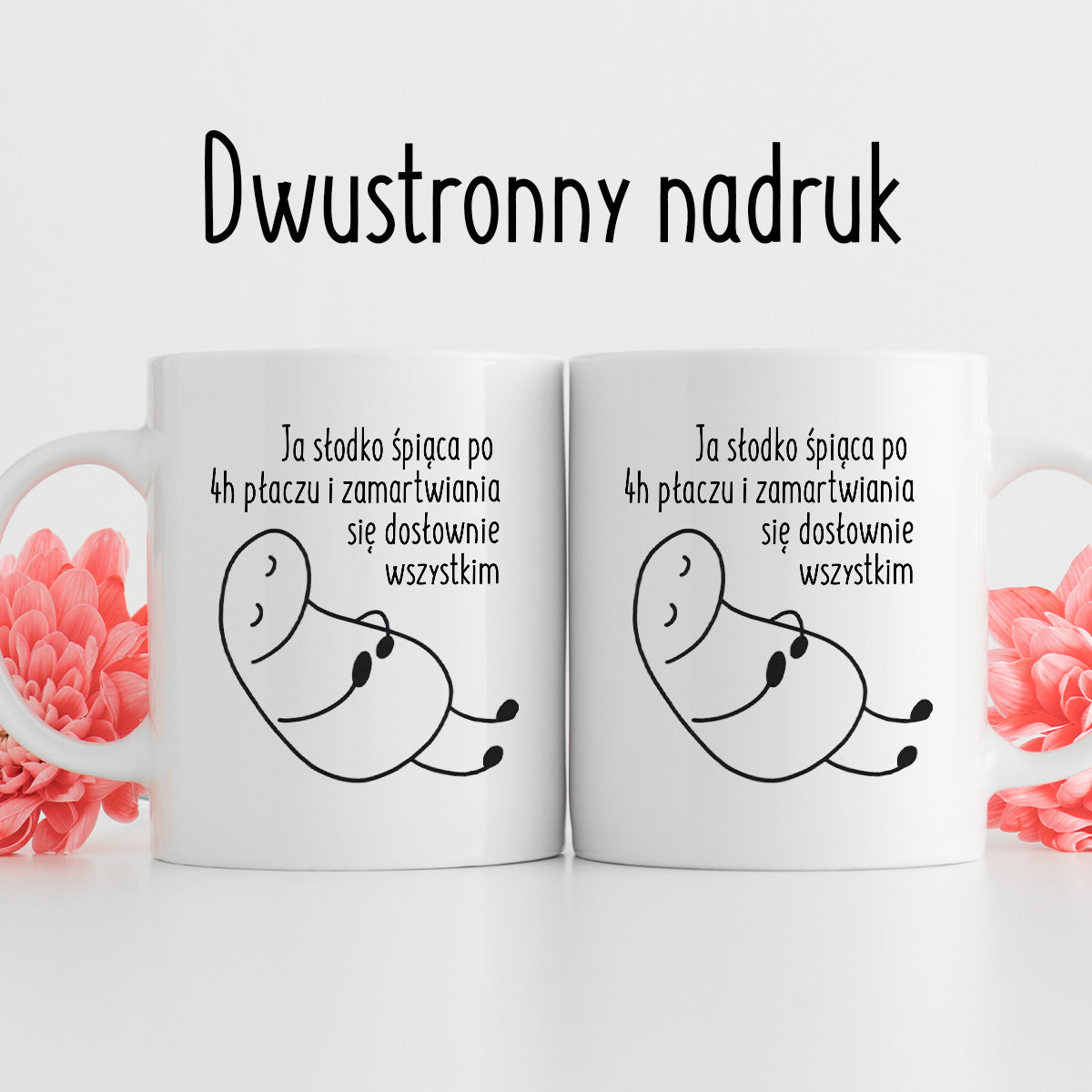 Kubek z nadrukiem "Ja słodko śpiąca po 4h płaczu i zamartwiania się dosłownie wszystkim"