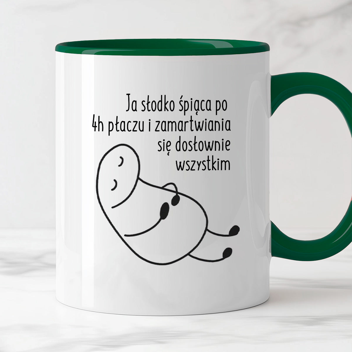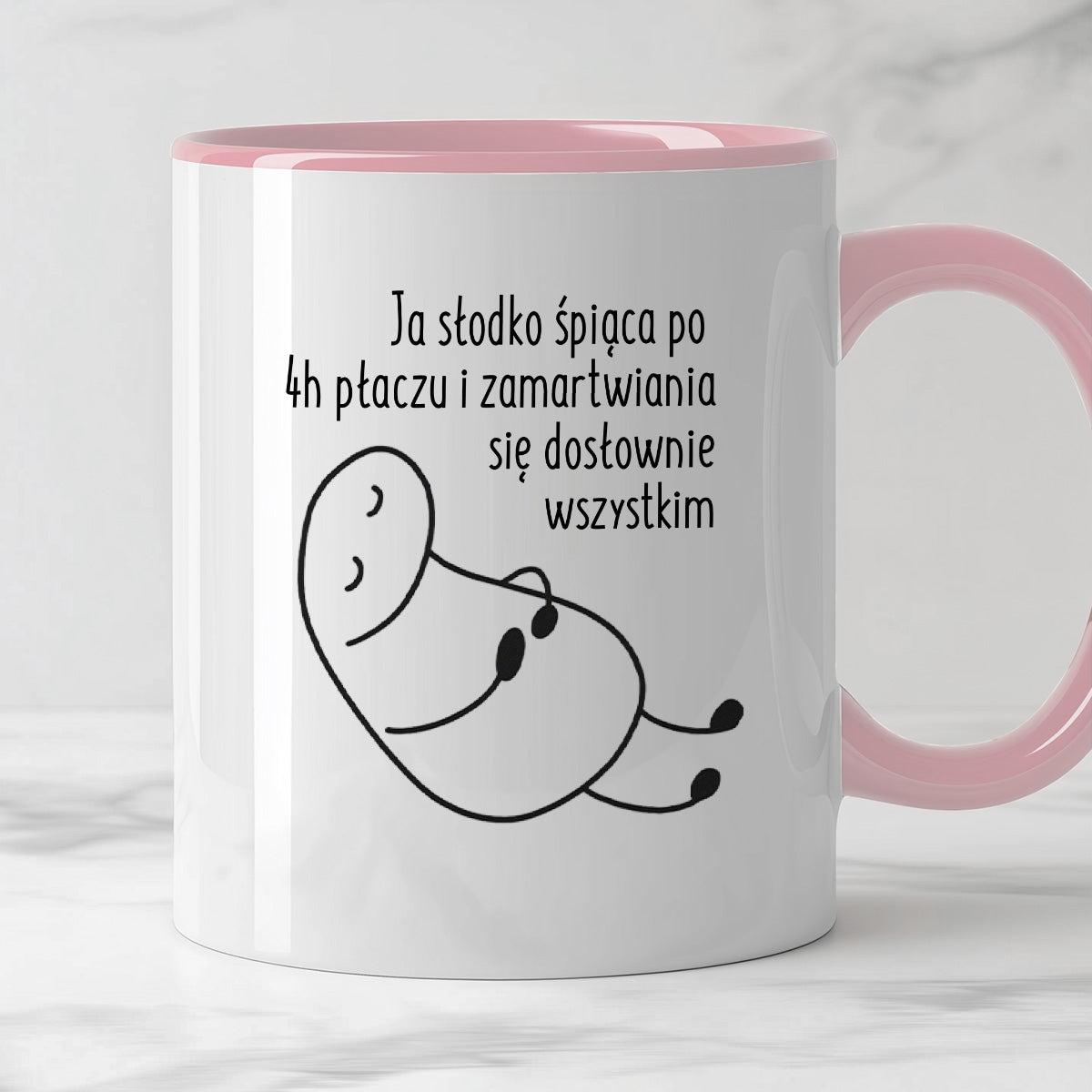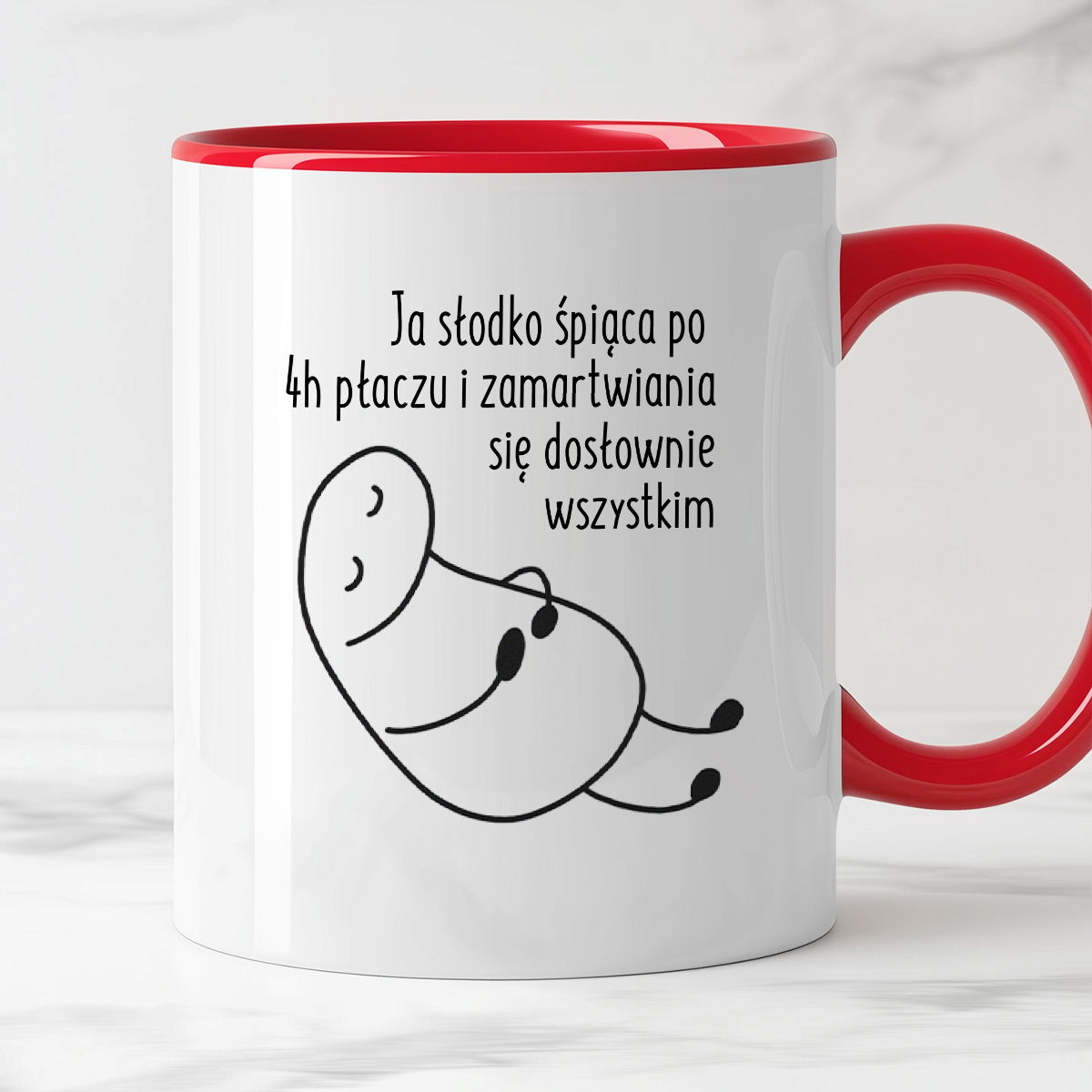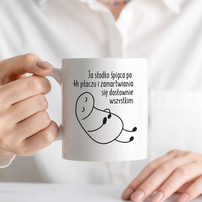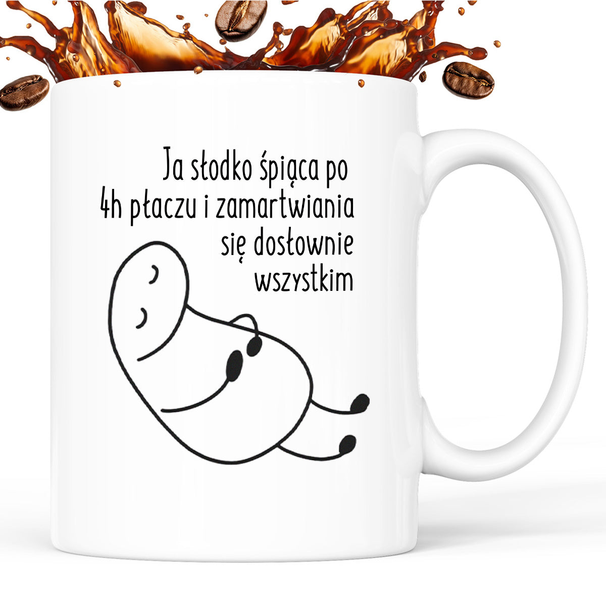 Kubek z nadrukiem "Ja słodko śpiąca po 4h płaczu i zamartwiania się dosłownie wszystkim"