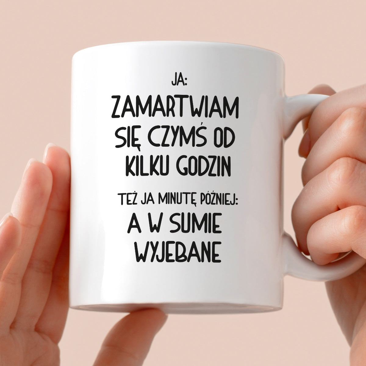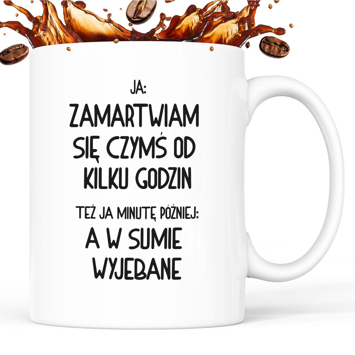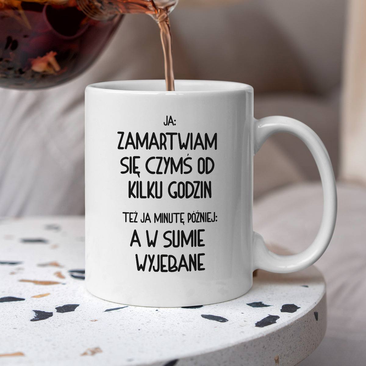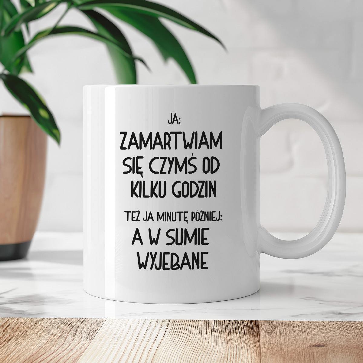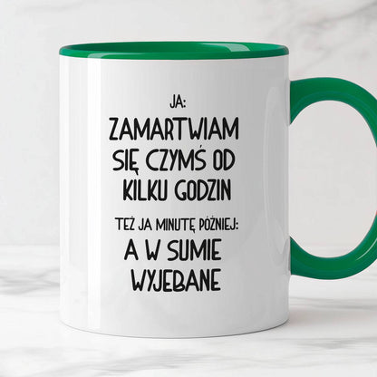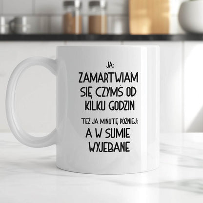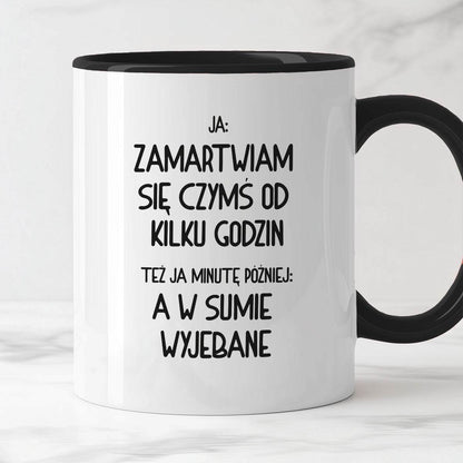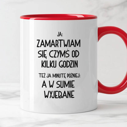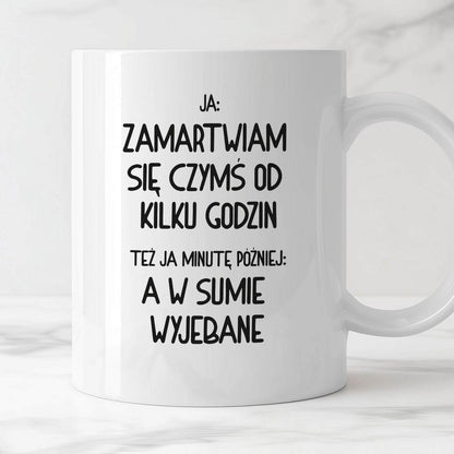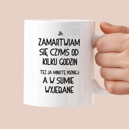 Kubek z nadrukiem "Ja: zamartwiam się czymś od kliku godzin, tez ja kilka godzin później: a w sumie wyjebane"