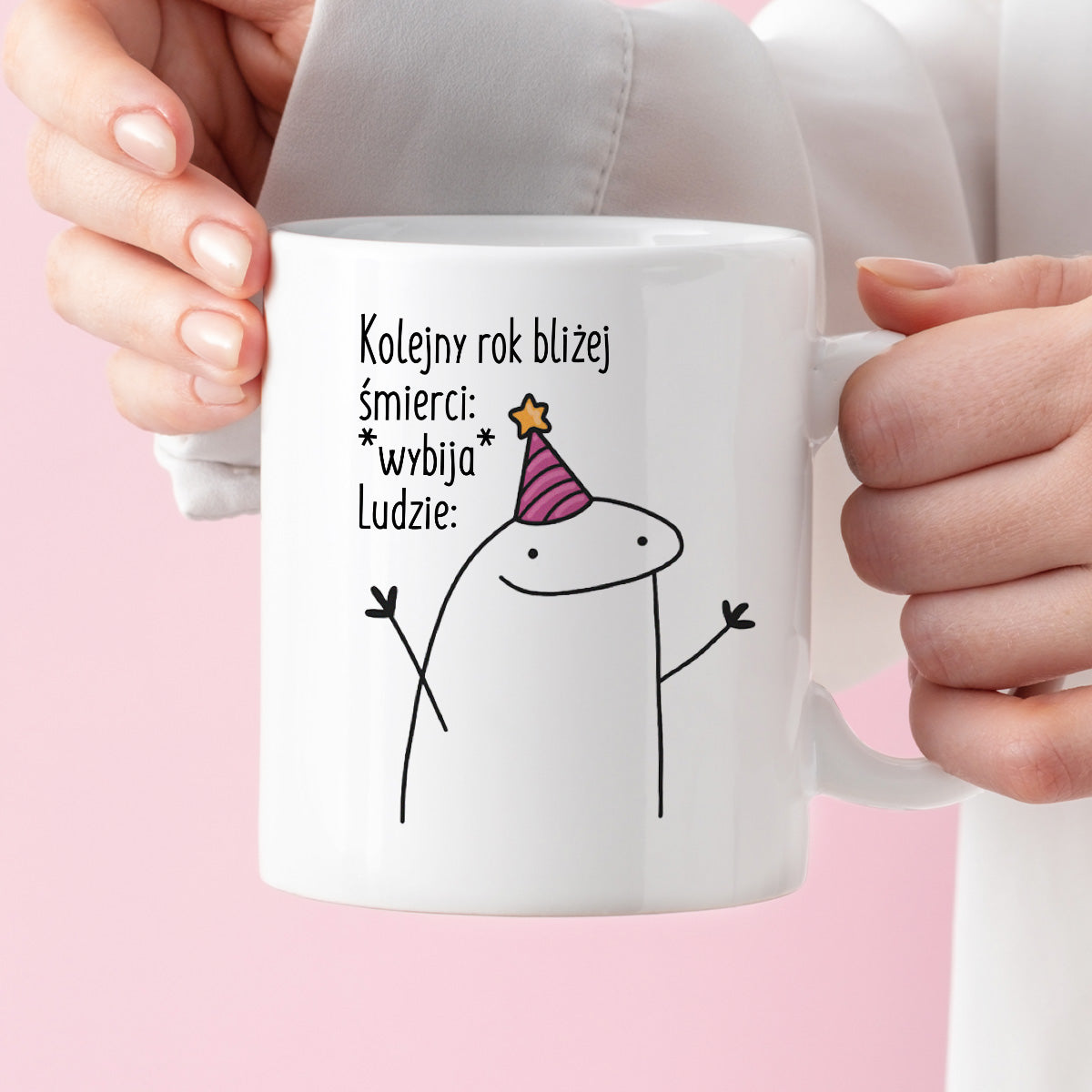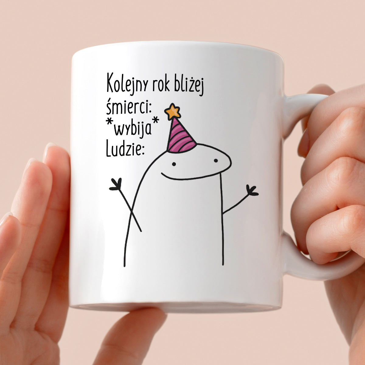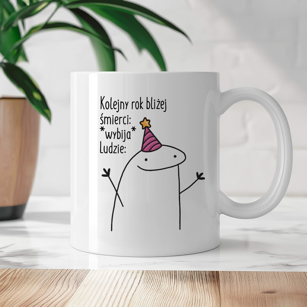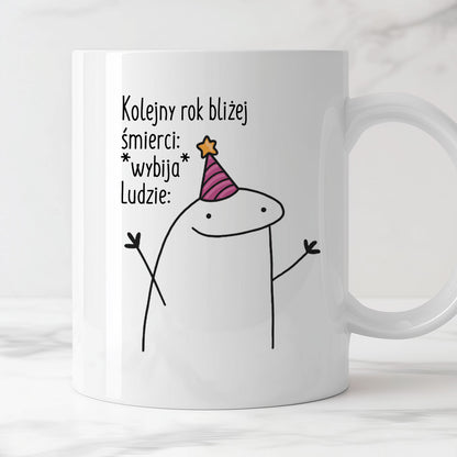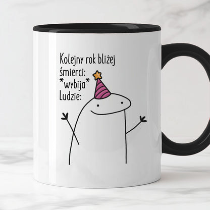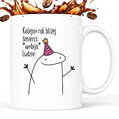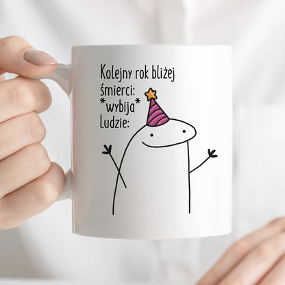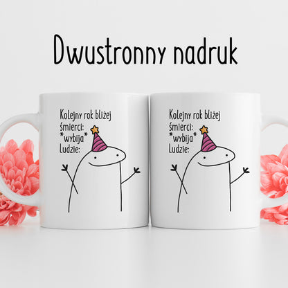 Kubek z nadrukiem "Kolejny rok bliżej śmierci: *wybija* Ludzie:"