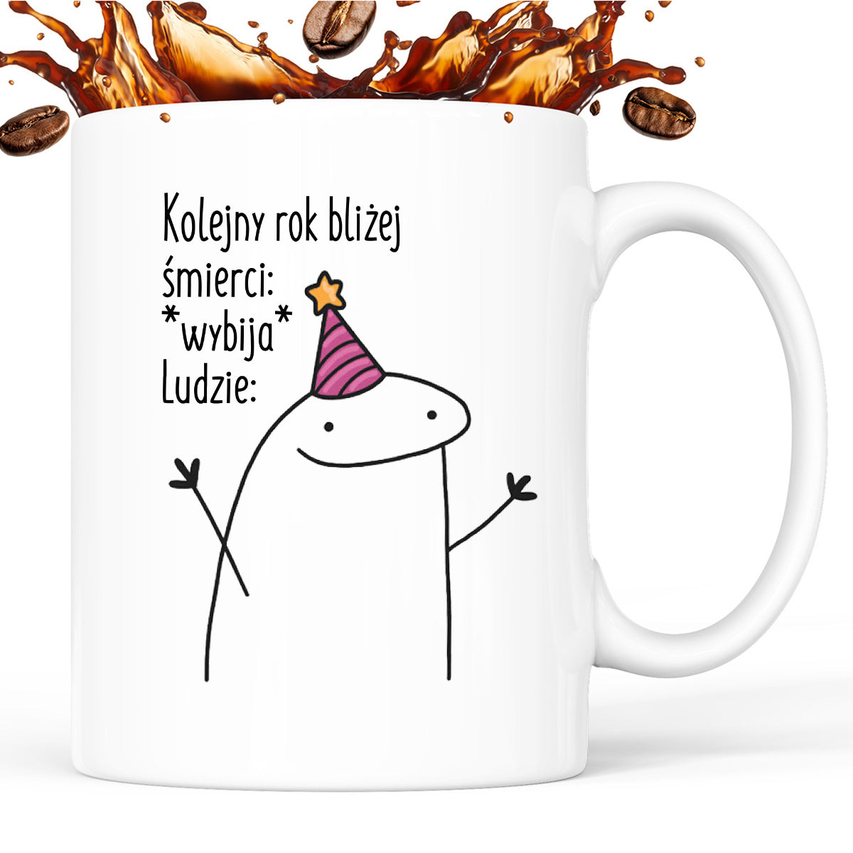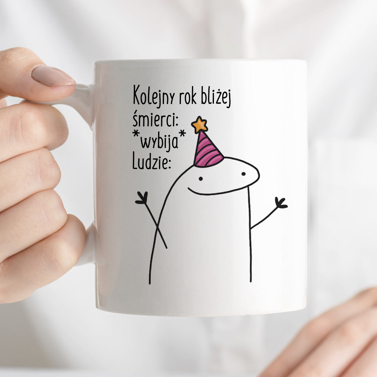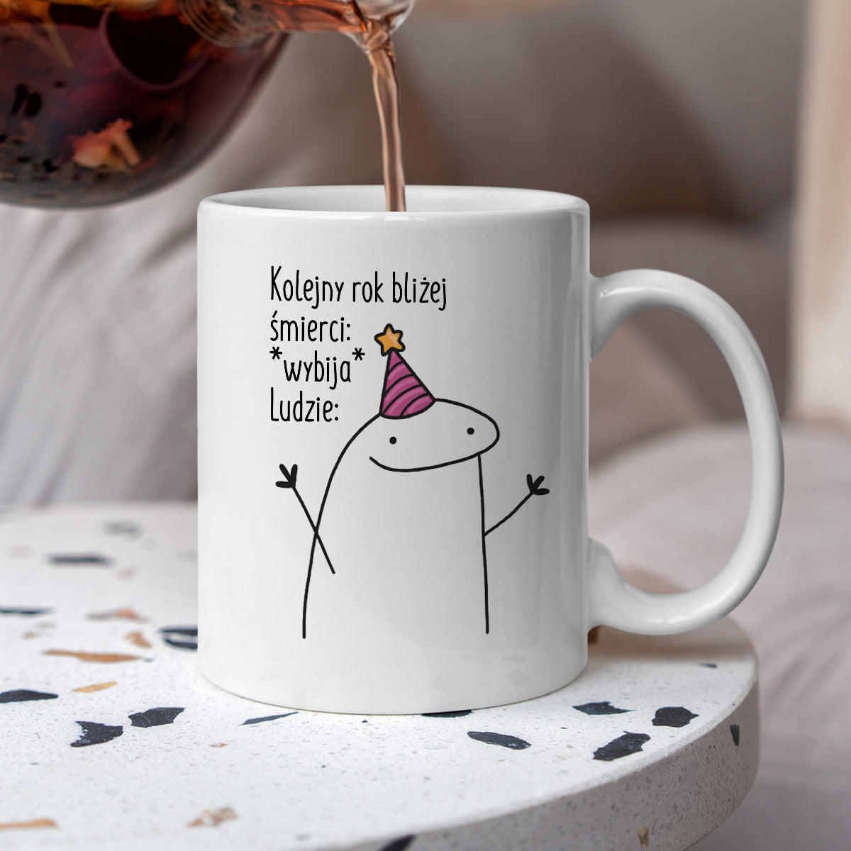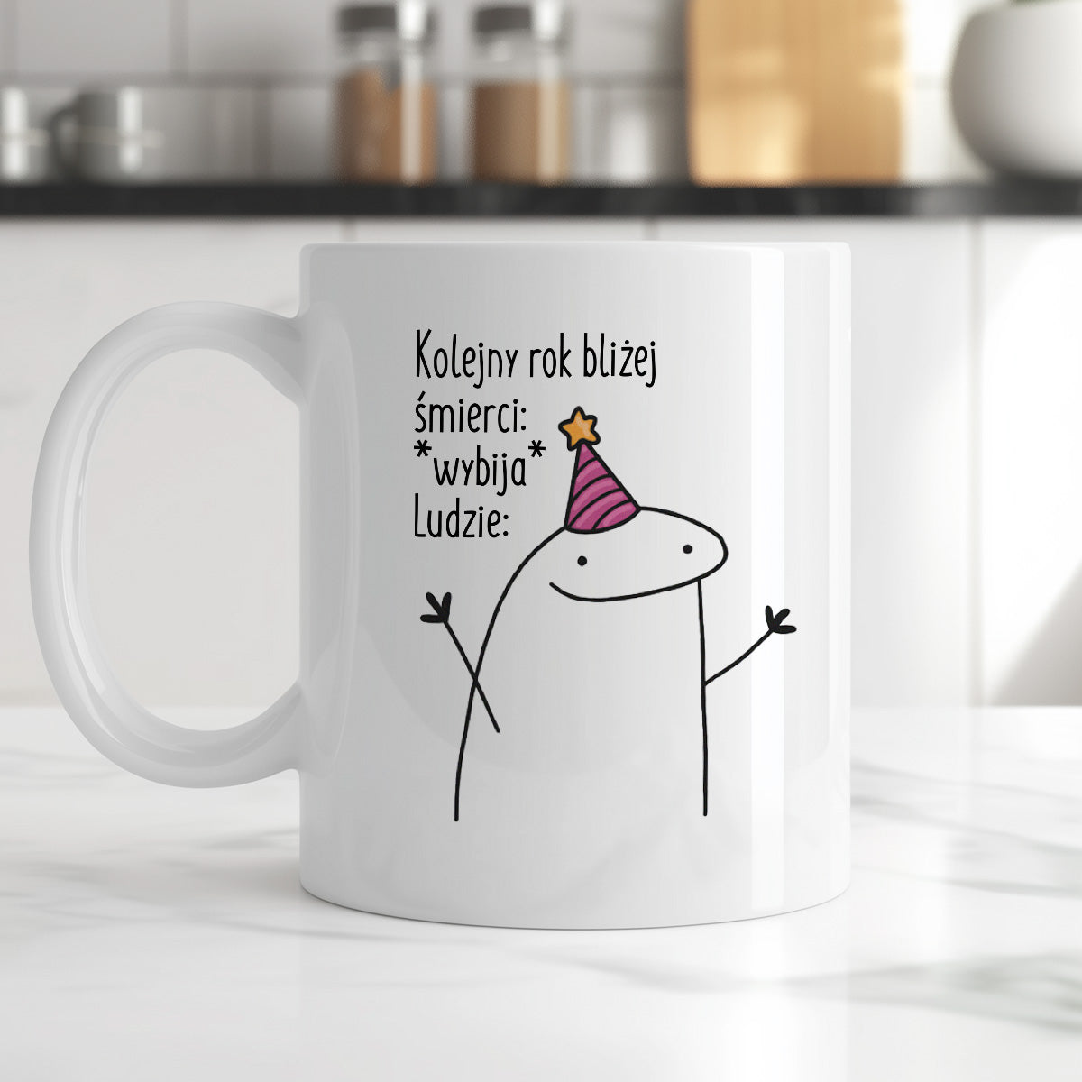 Kubek z nadrukiem "Kolejny rok bliżej śmierci: *wybija* Ludzie:"
