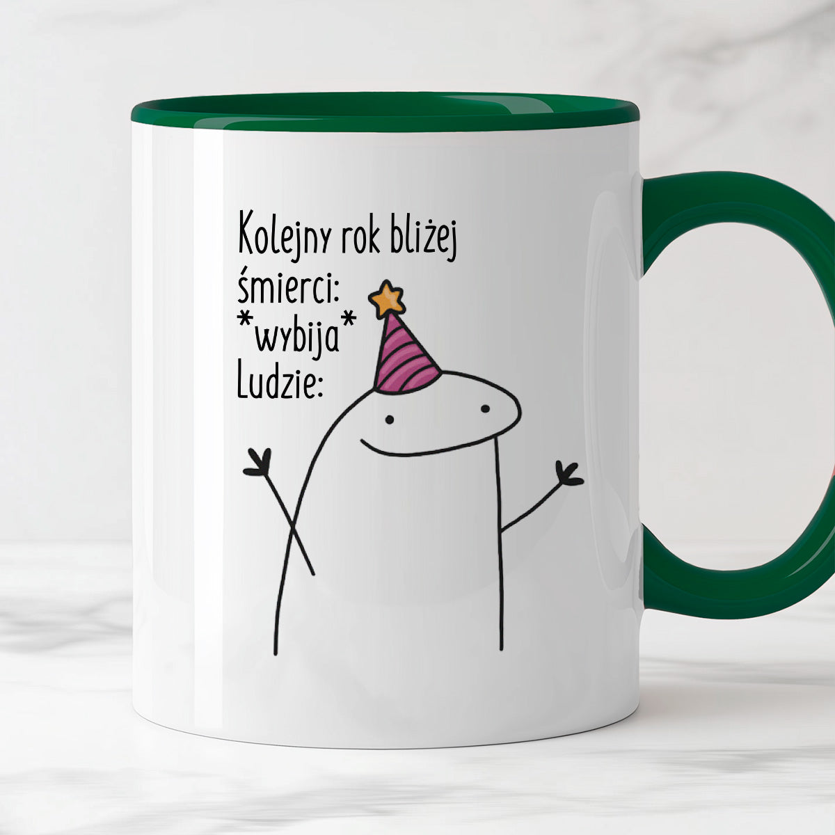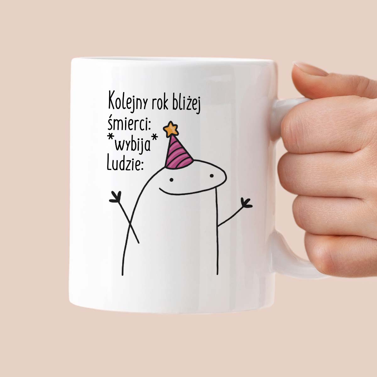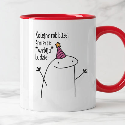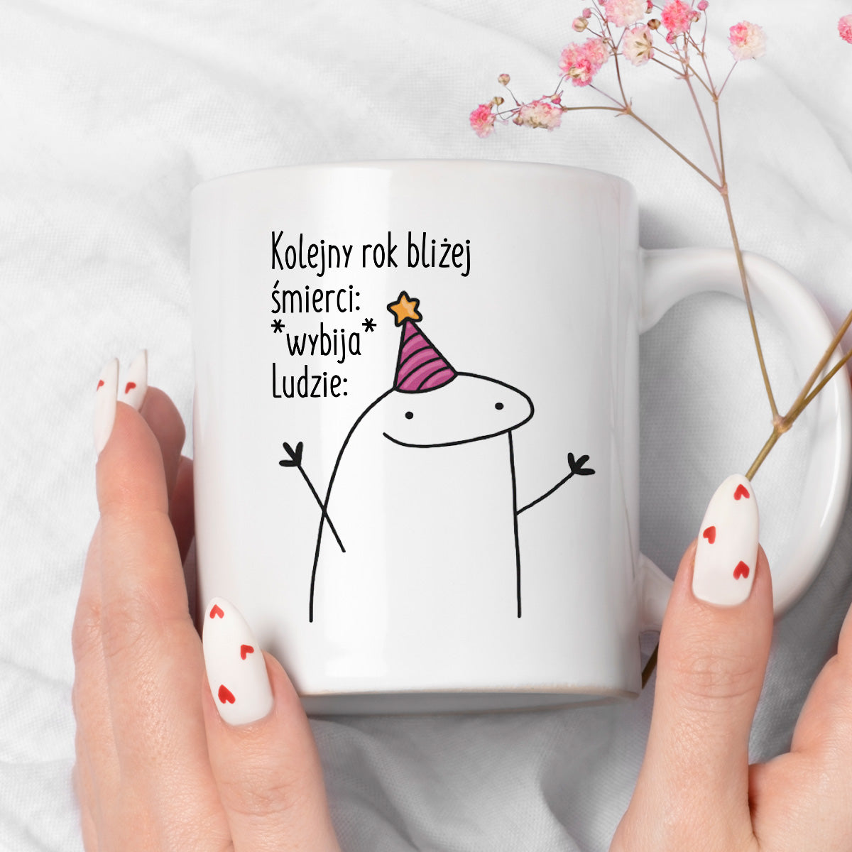 Kubek z nadrukiem "Kolejny rok bliżej śmierci: *wybija* Ludzie:"