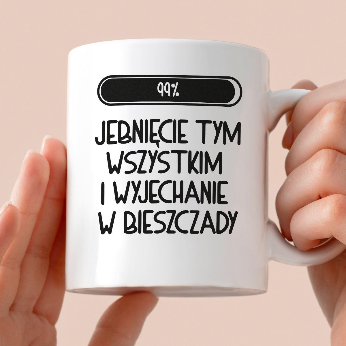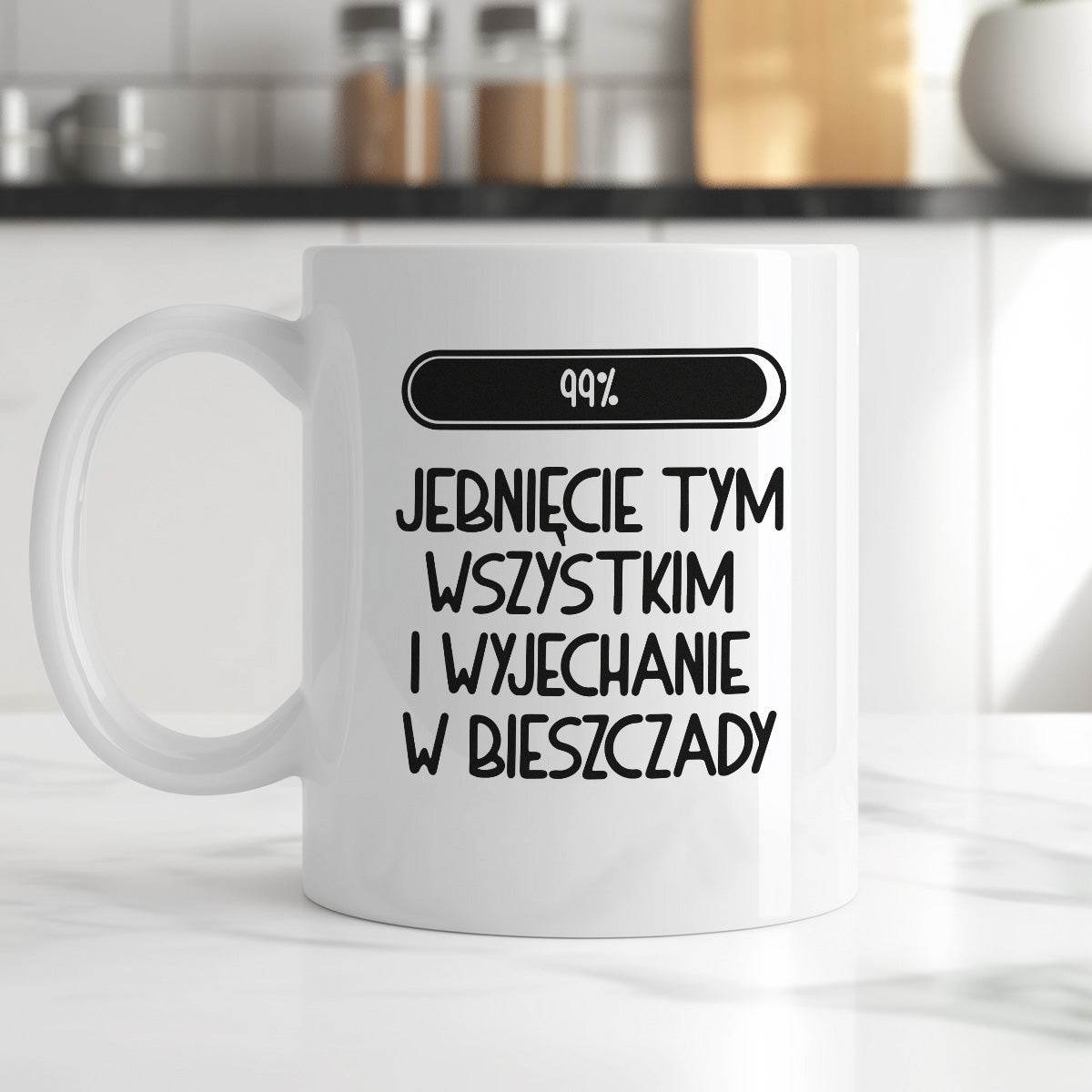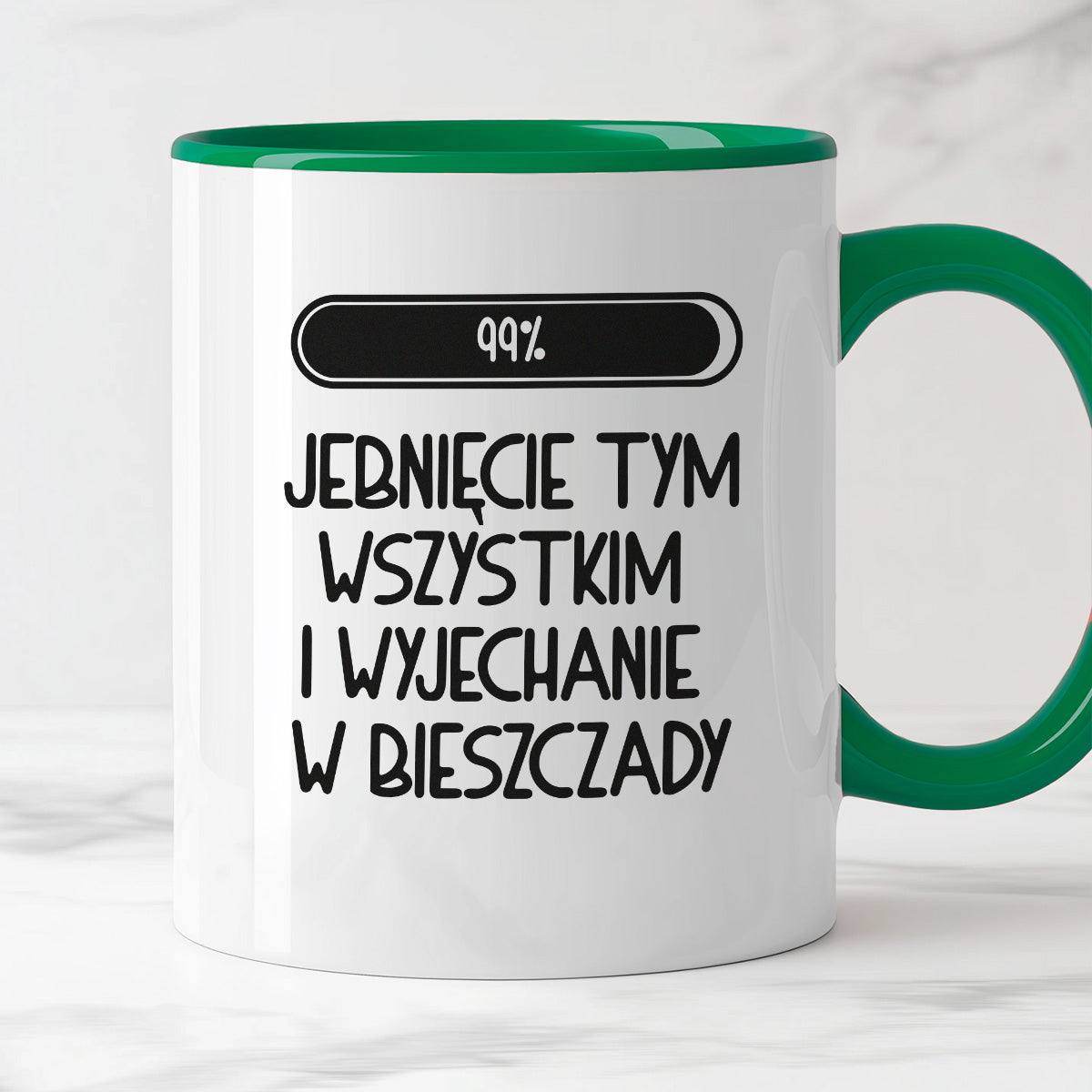 Kubek z nadrukiem "Loading 99% - jebnięcie tym wszystkim i wyjechanie w Bieszczady"
