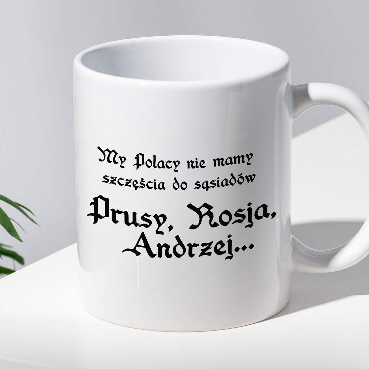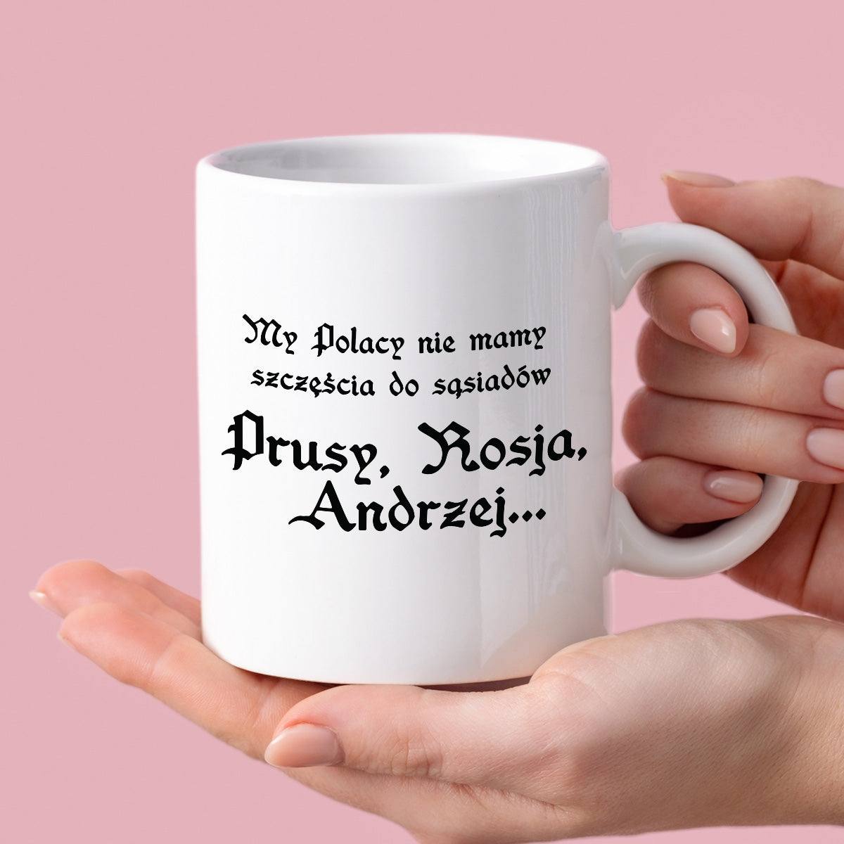 Dodaj do swojej kolekcji kubek z nadrukiem "My Polacy nie mamy szczęścia do sąsiadów - Prusy, Rosja, Andrzej...", czyli jednym z najbardziej kultowych tekstów.