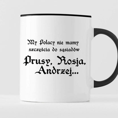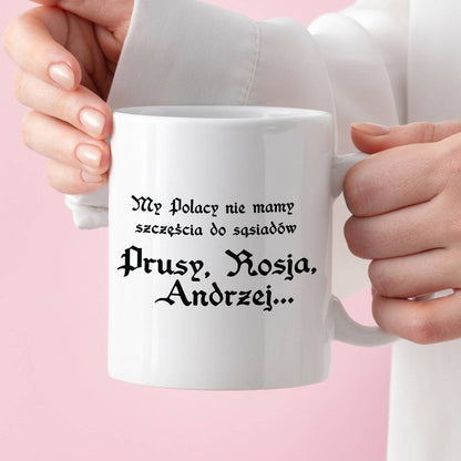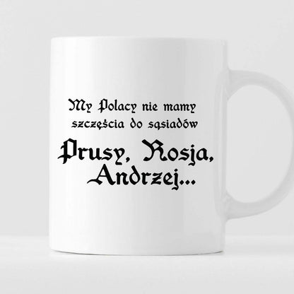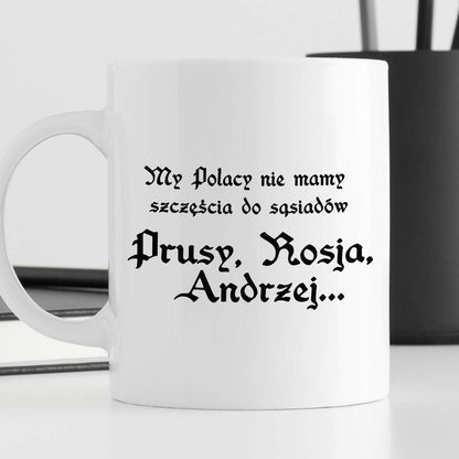 Kubek z nadrukiem "My Polacy nie mamy szczęścia do sąsiadów - Prusy, Rosja, Andrzej..." 330 ml