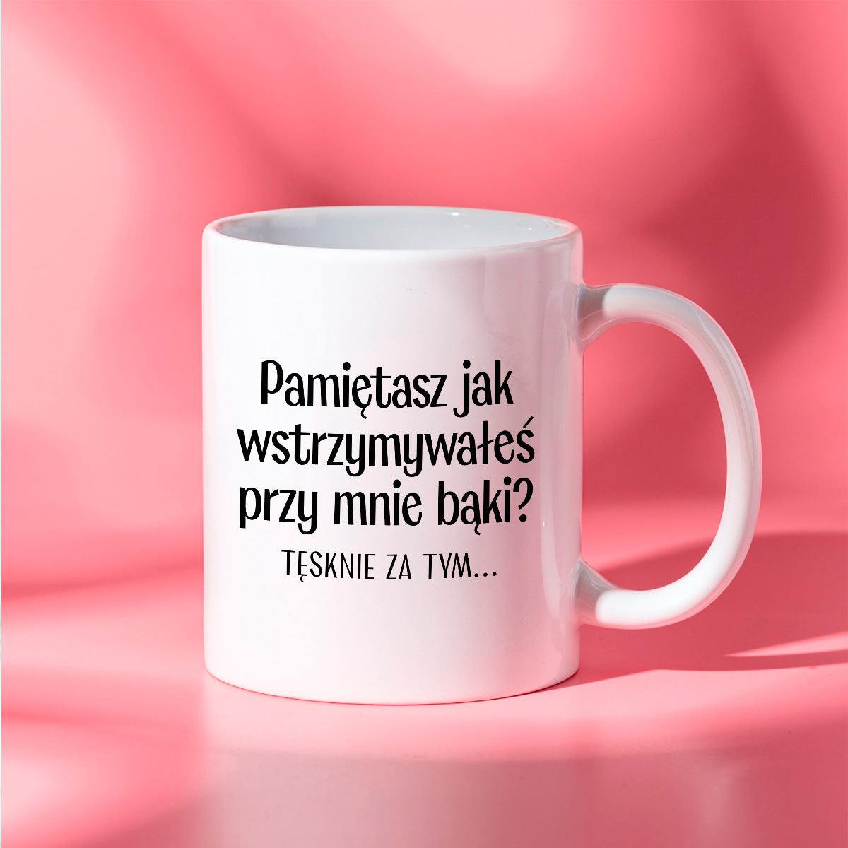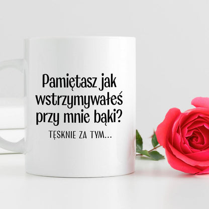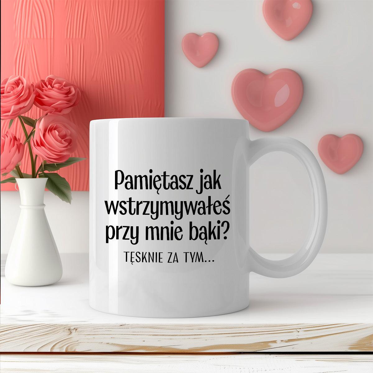 Kubek z nadrukiem "Pamiętasz jak wstrzymywałeś przy mnie bąki? Tęsknie za tym..." - WALENTYNKI - FB
