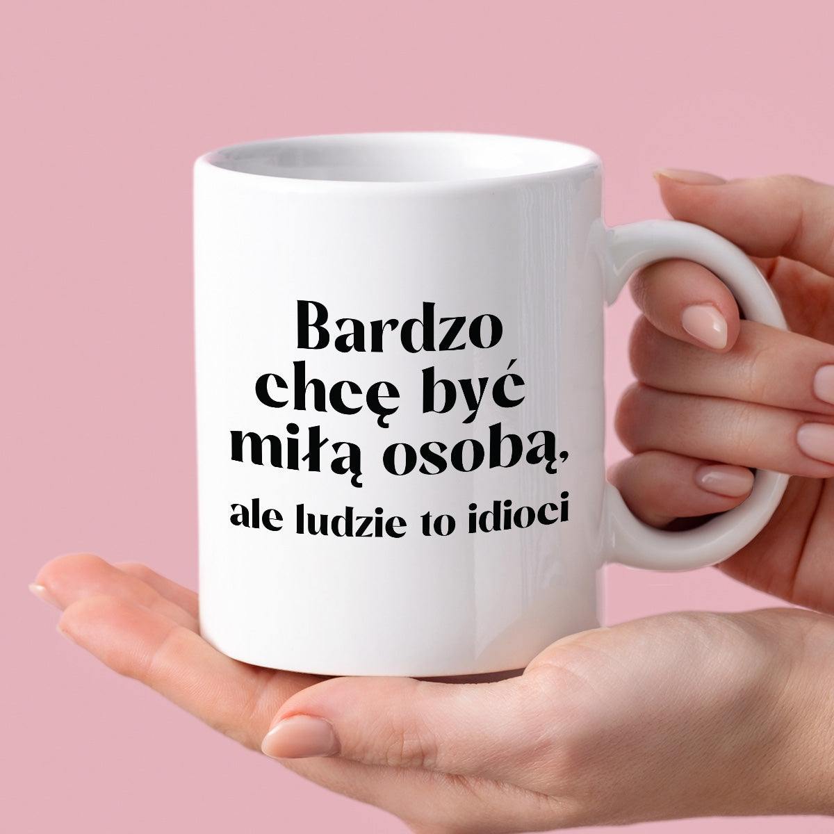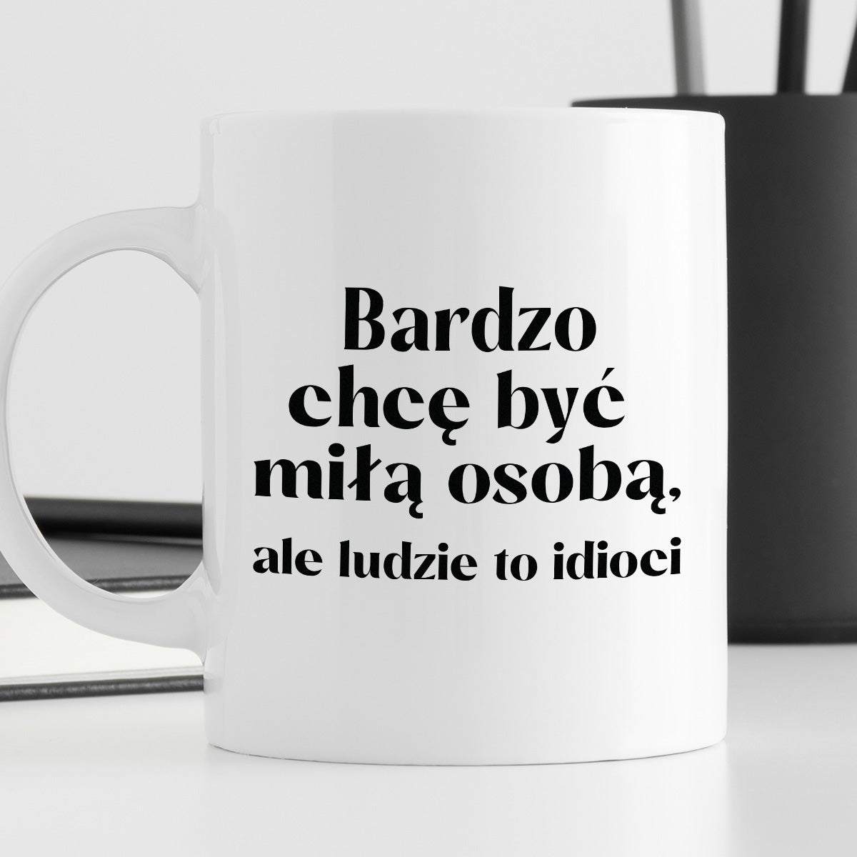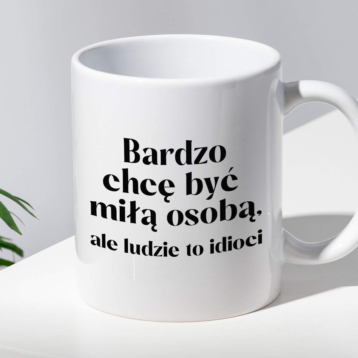 Kubek z nadrukiem "Bardzo chcę być miłą osobą, ale ludzie to idioci"