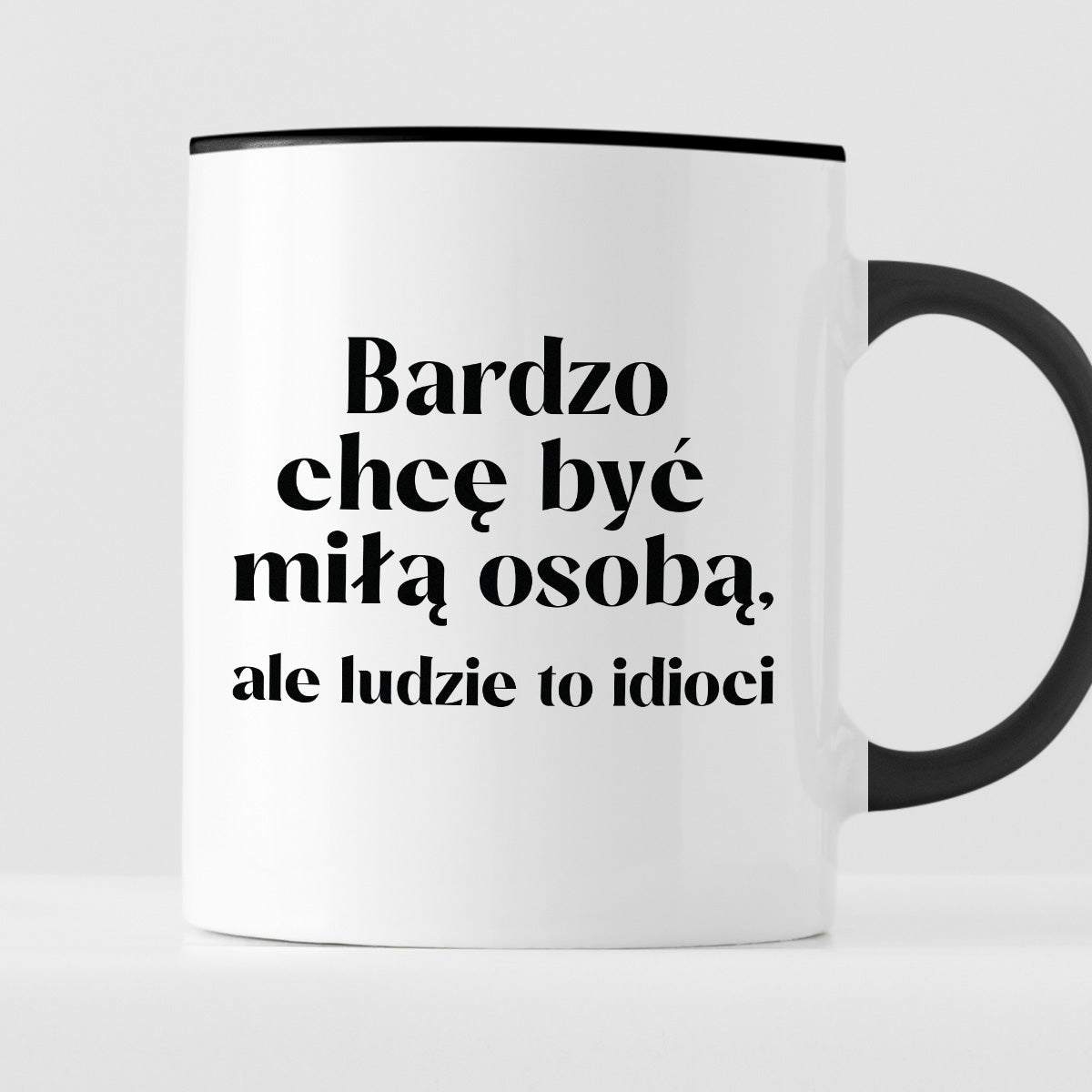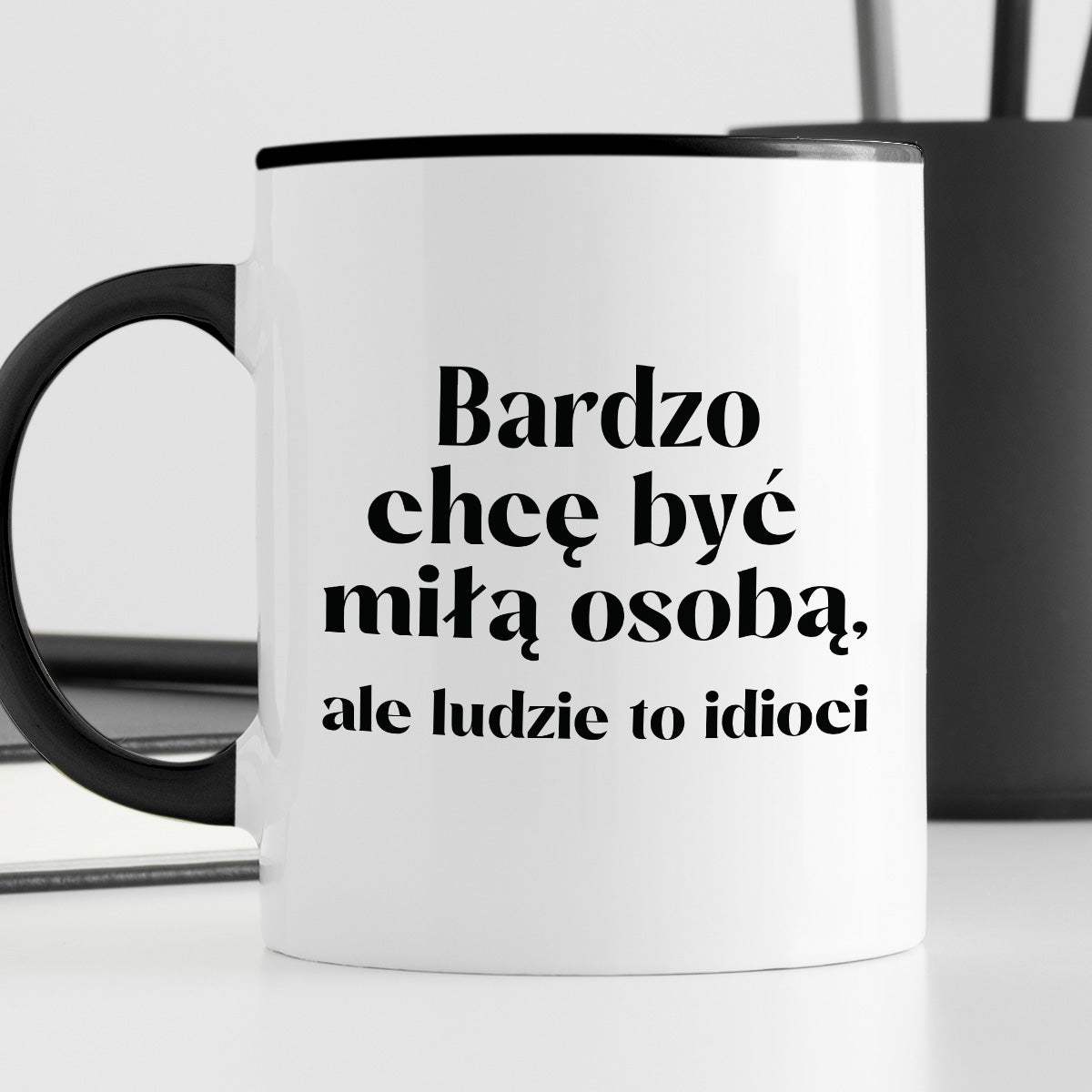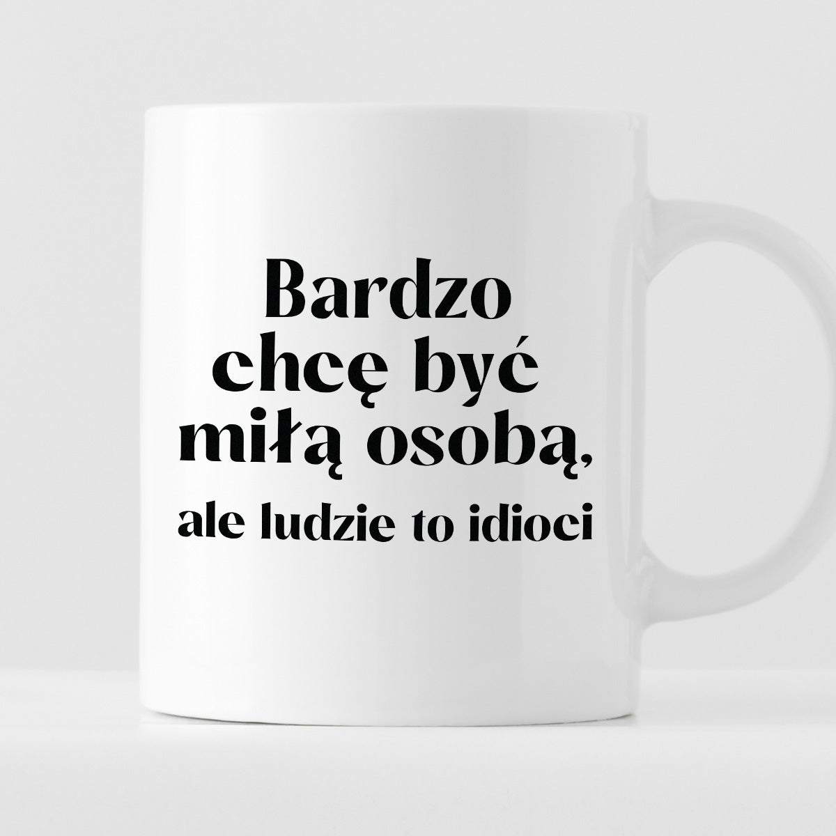 Kubek z nadrukiem "Bardzo chcę być miłą osobą, ale ludzie to idioci"