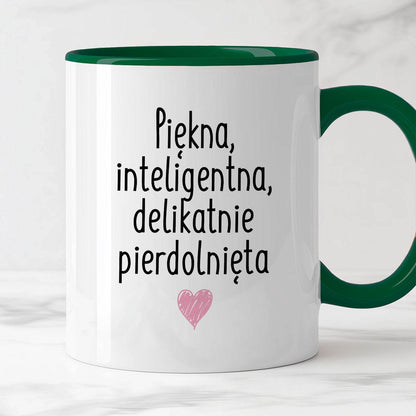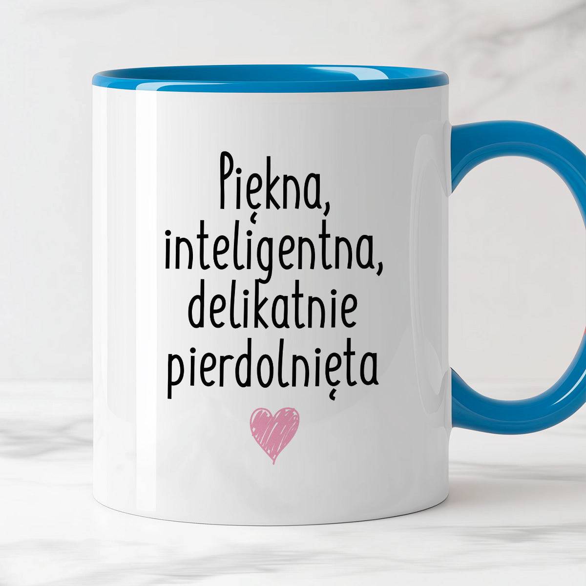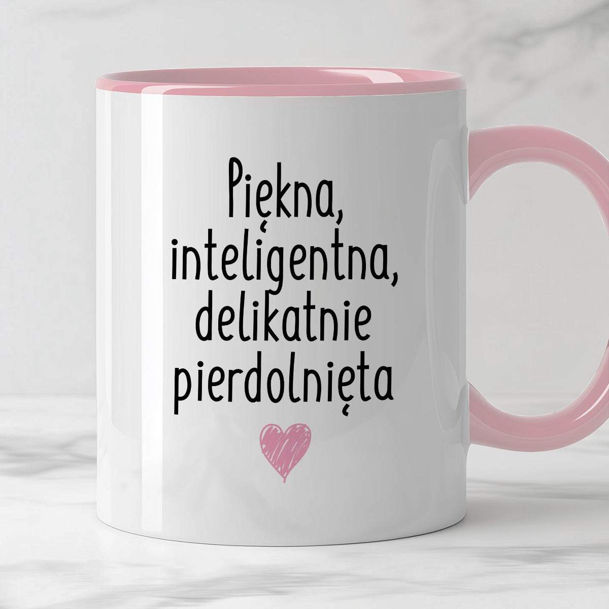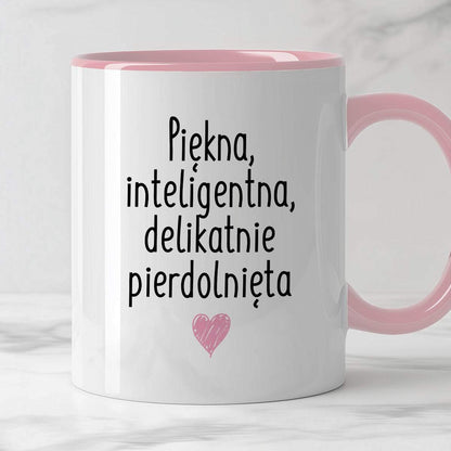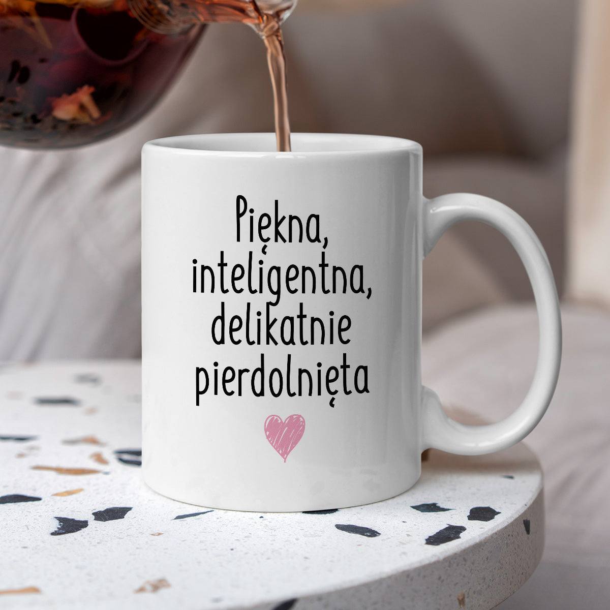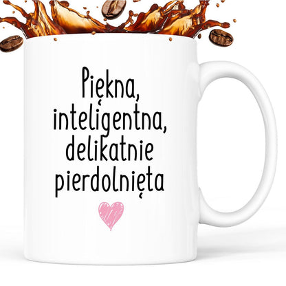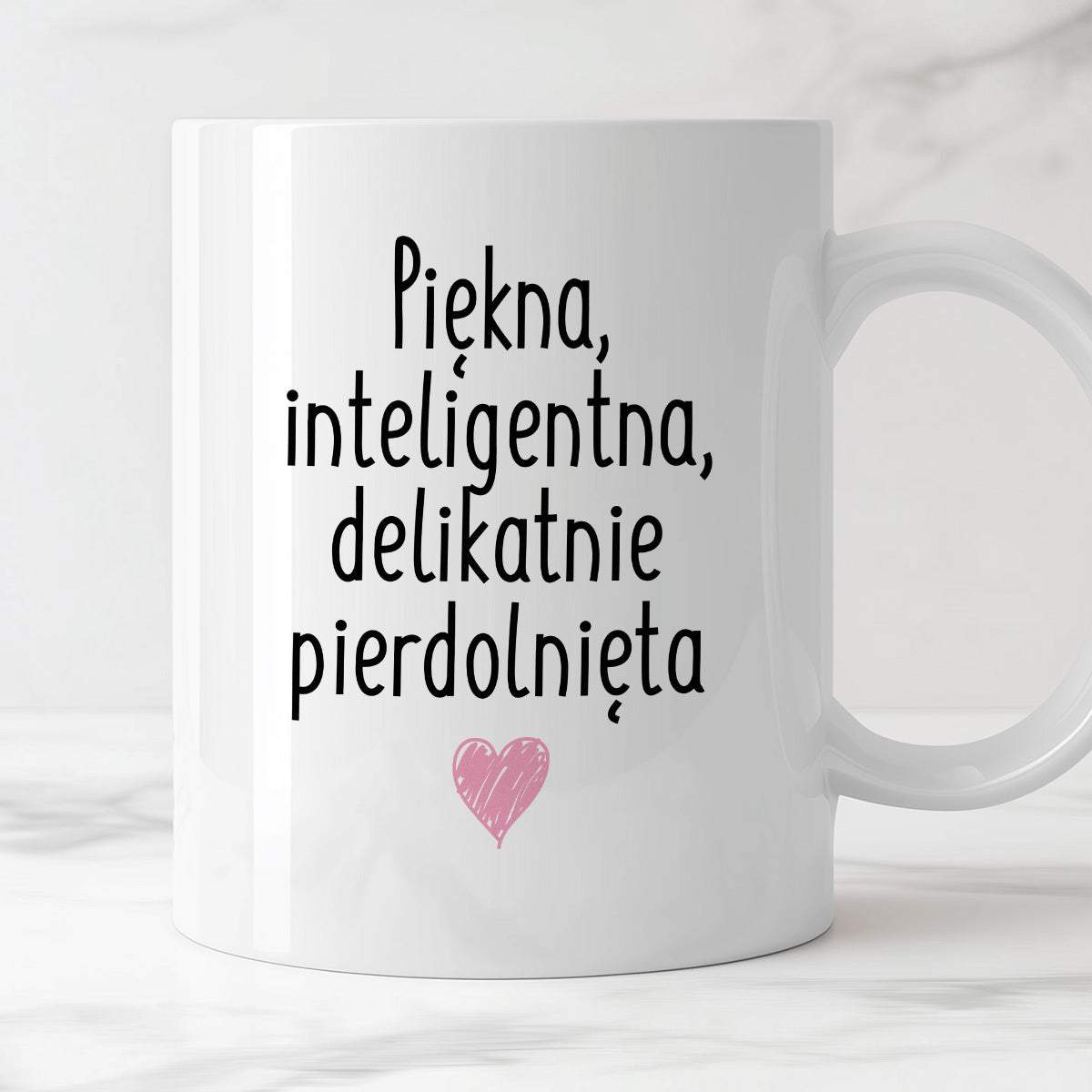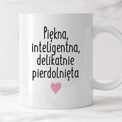 Kubek z nadrukiem "Piękna, inteligenta, delikatnie pierdolnięta"
