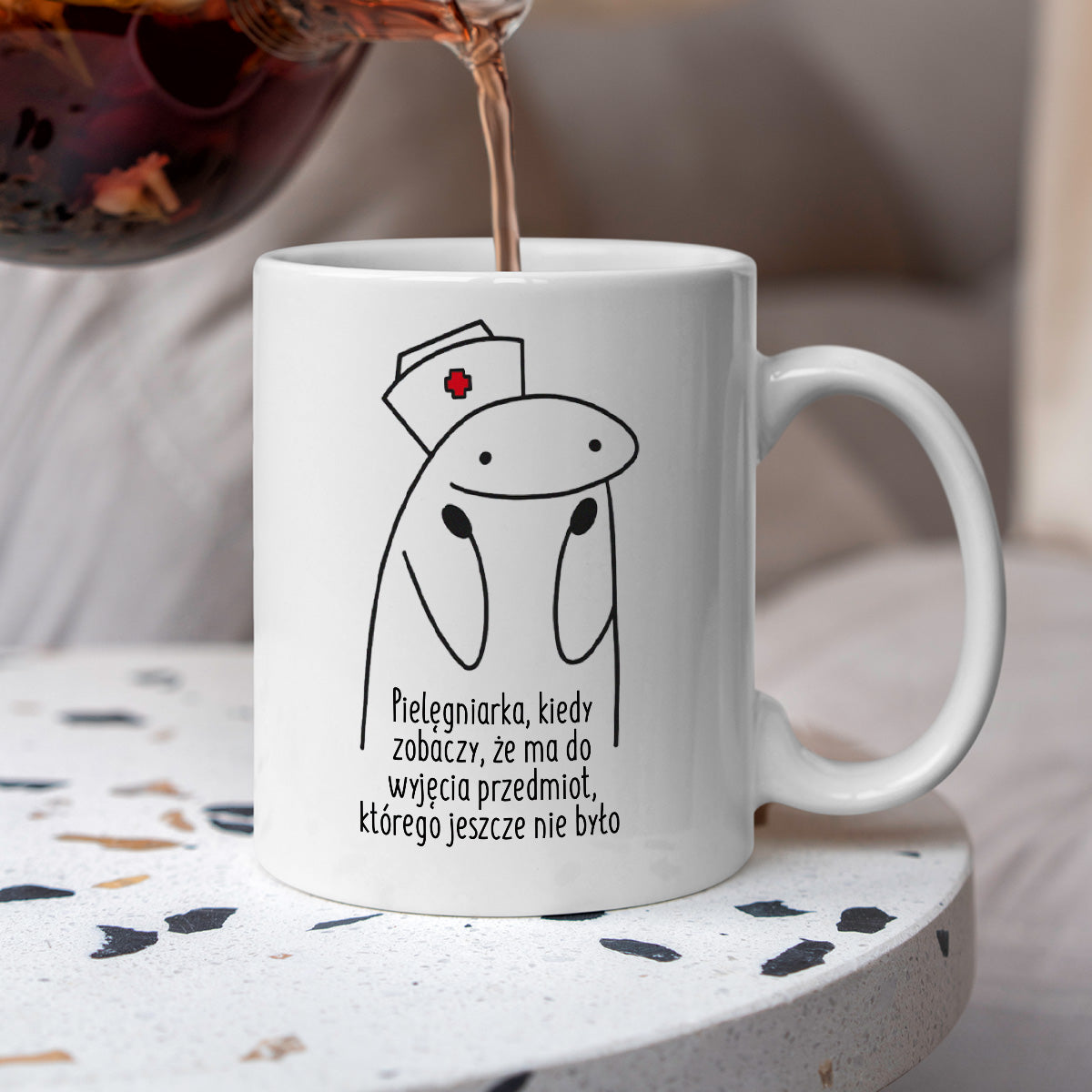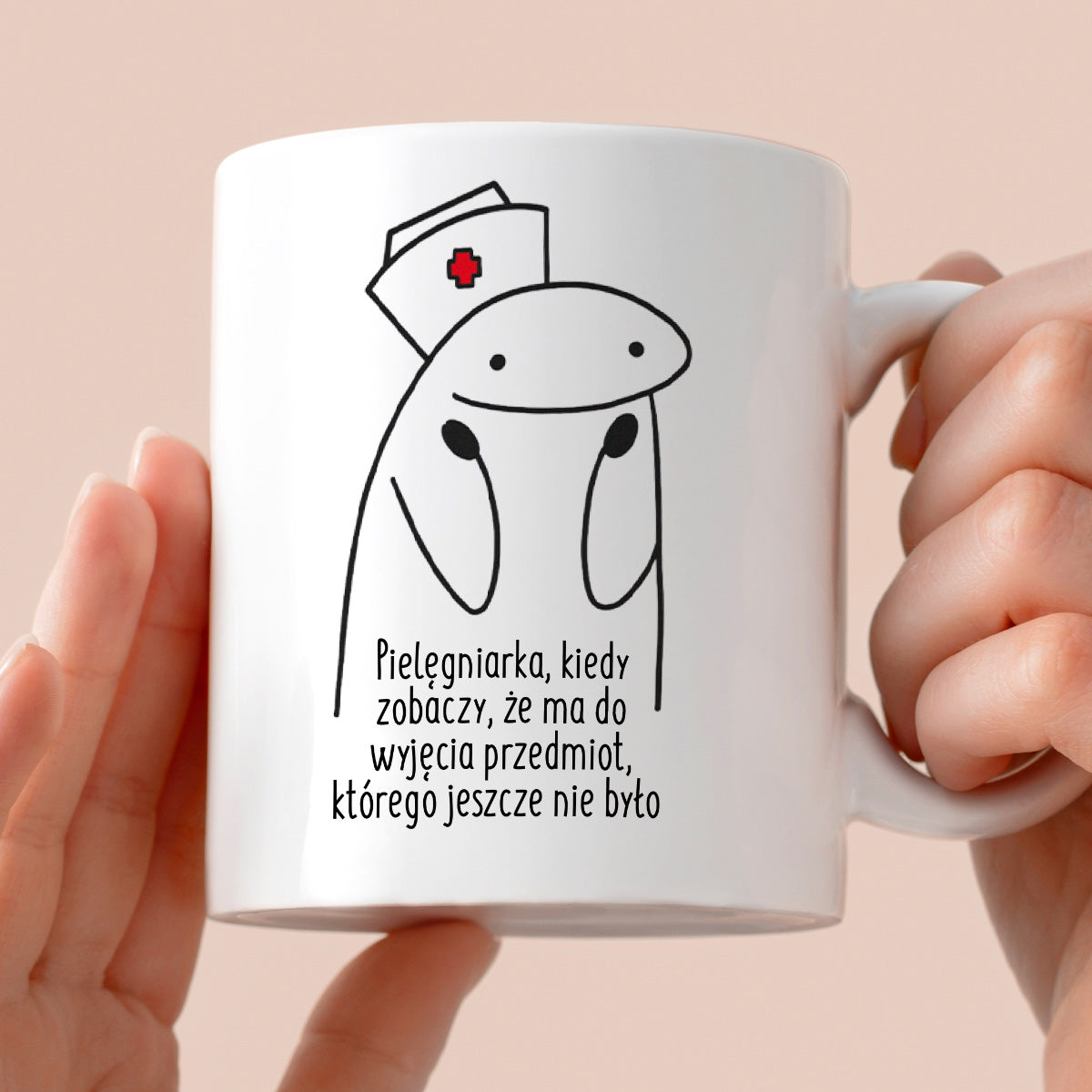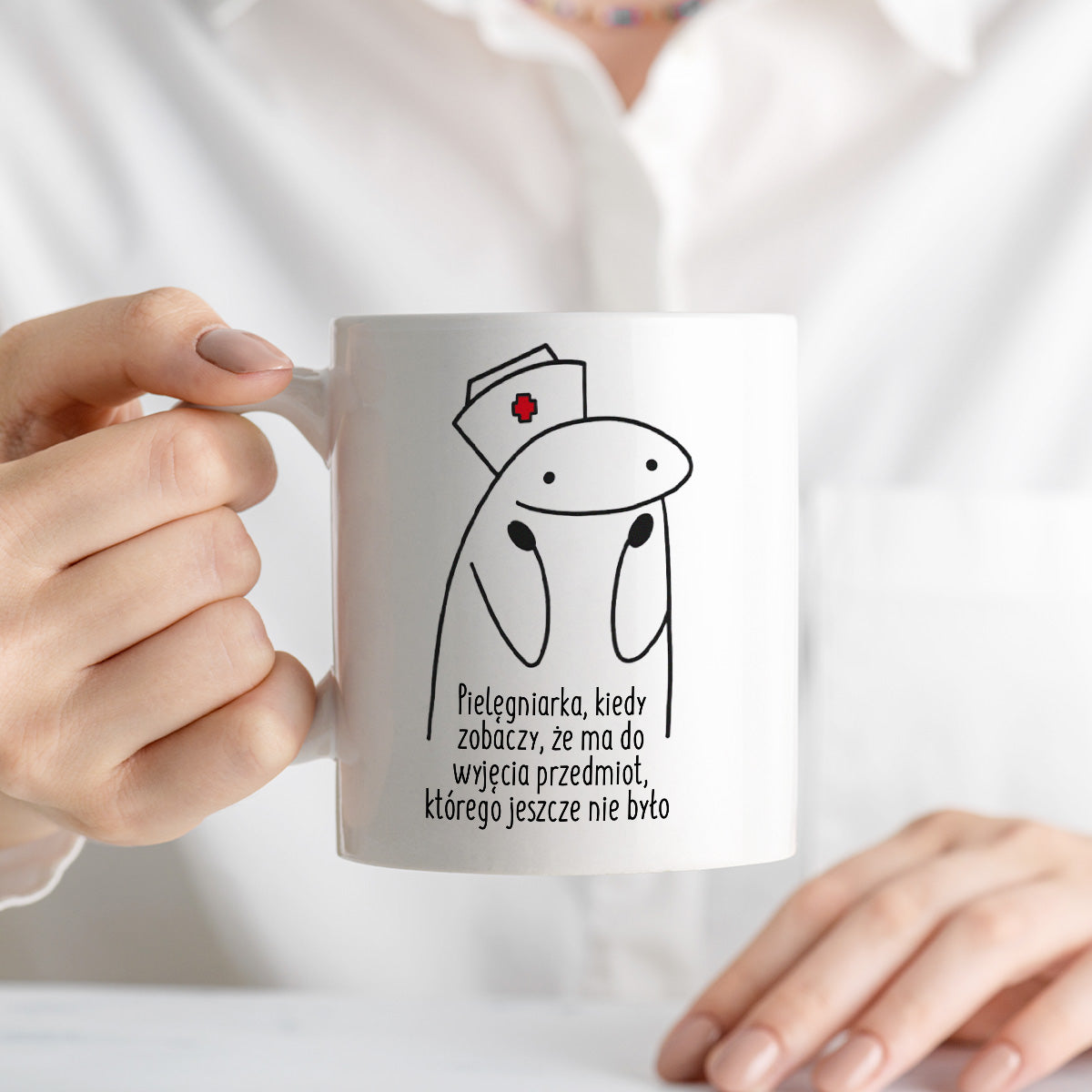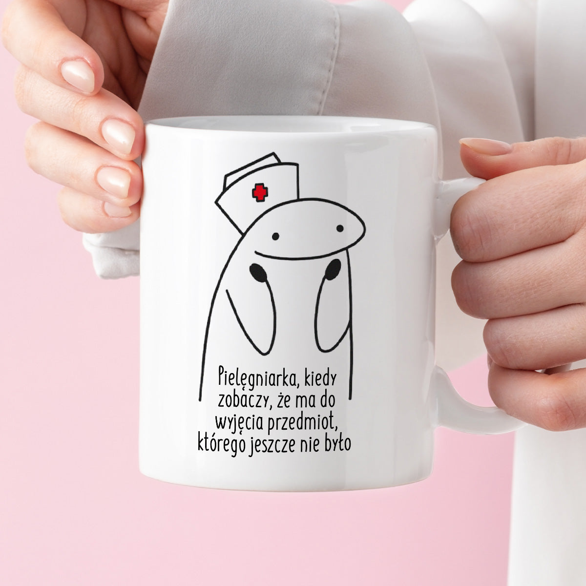 Kubek z nadrukiem "Pielęgniarka, kiedy zobaczy, że ma do wyjęcia przedmiot, którego jeszcze nie było "
