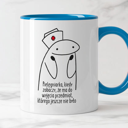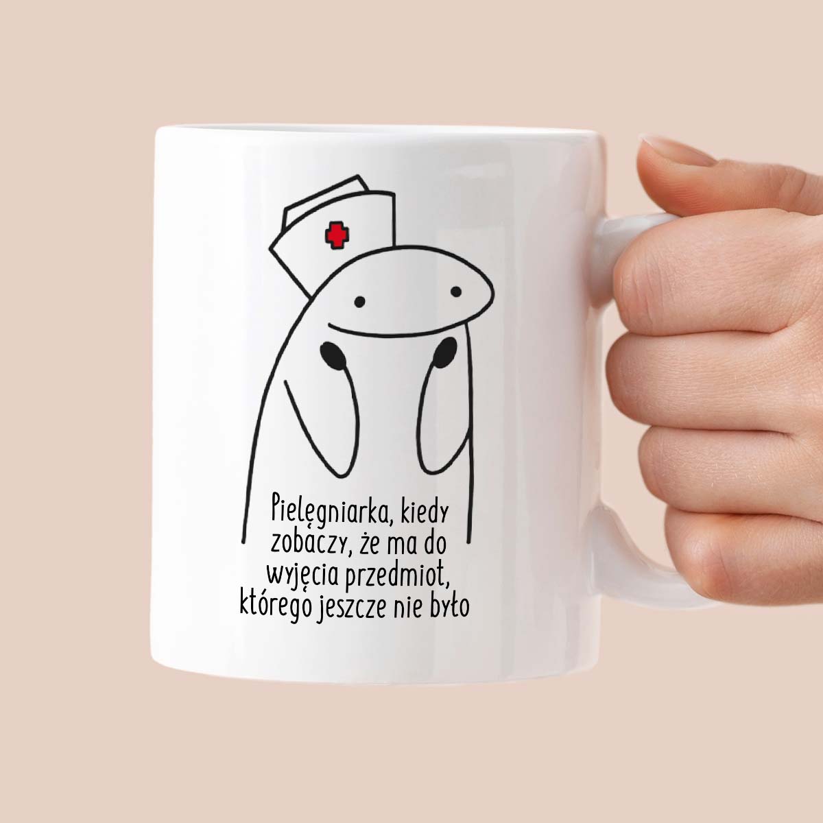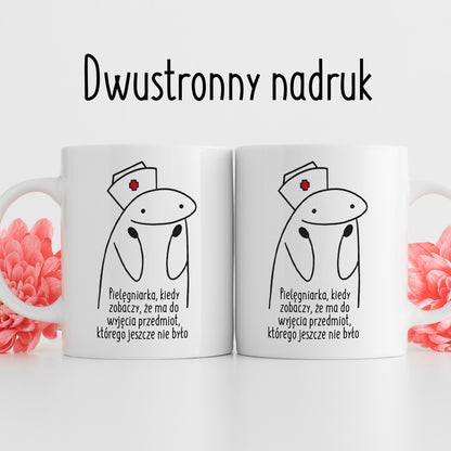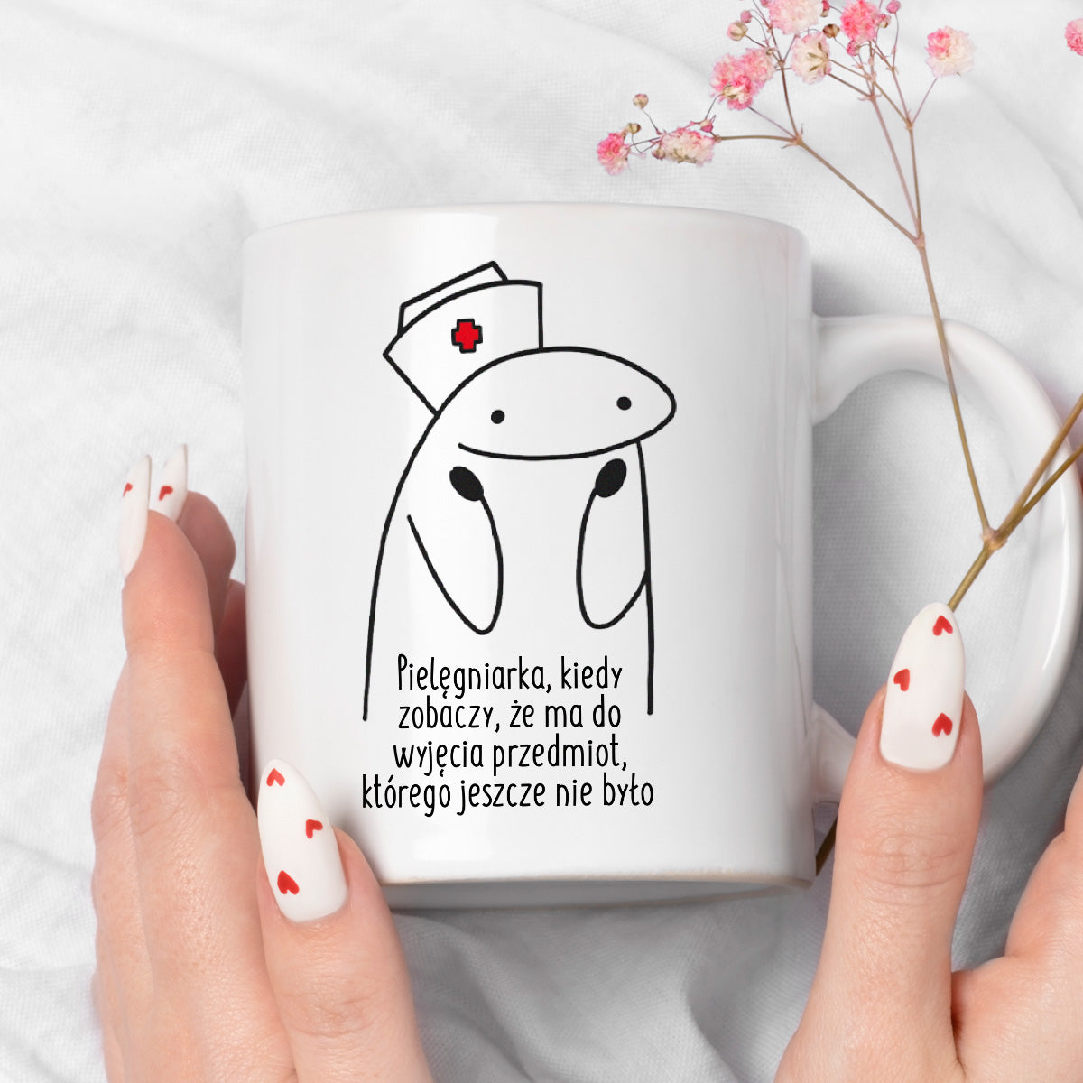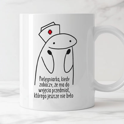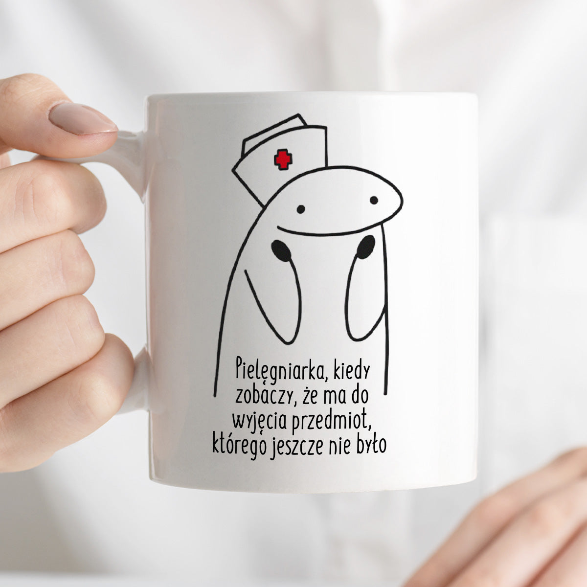 Kubek z nadrukiem "Pielęgniarka, kiedy zobaczy, że ma do wyjęcia przedmiot, którego jeszcze nie było "