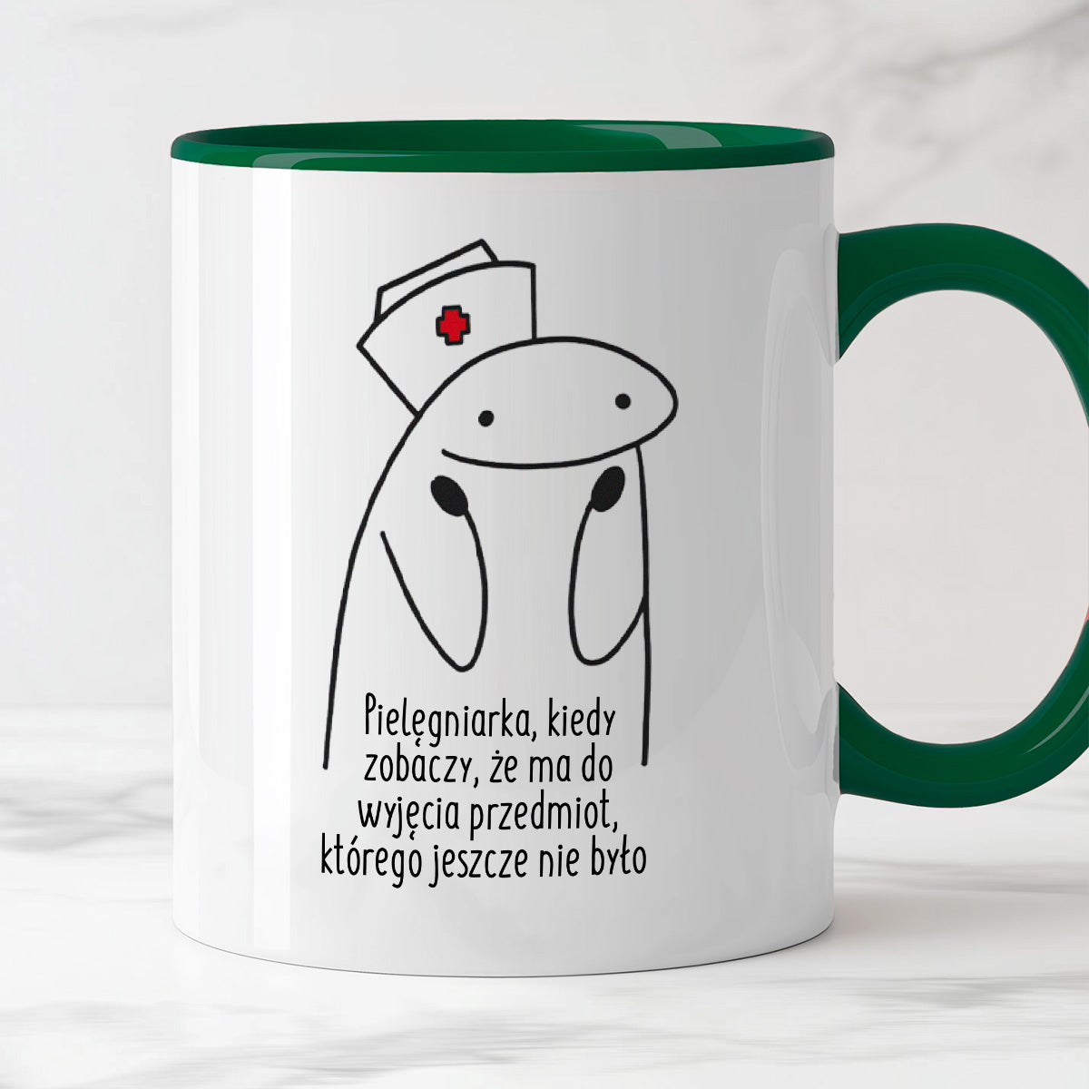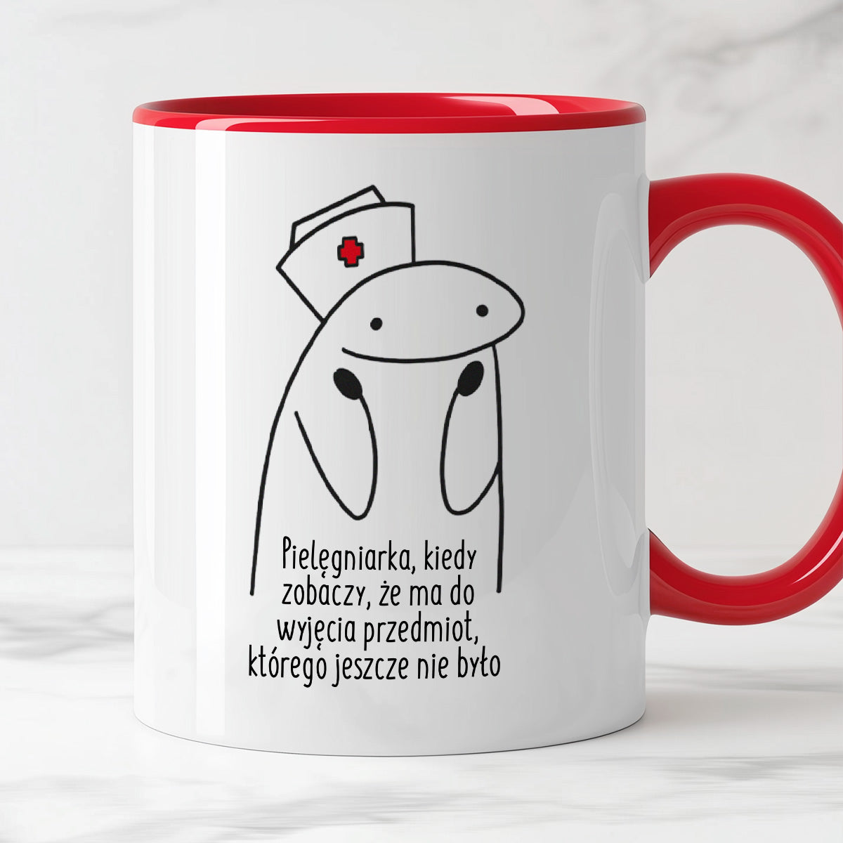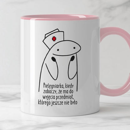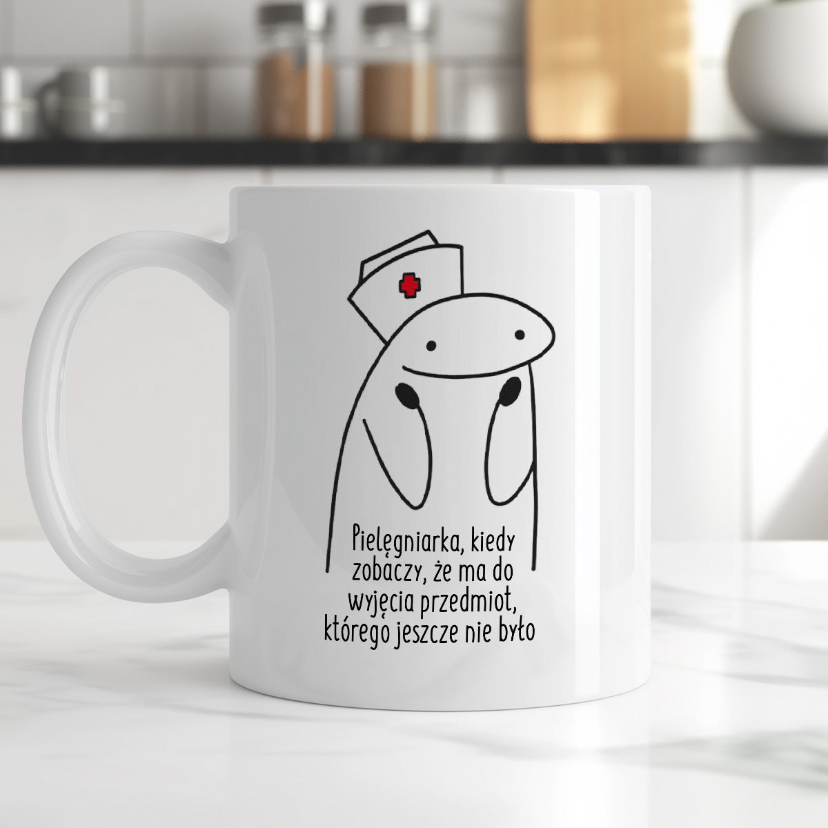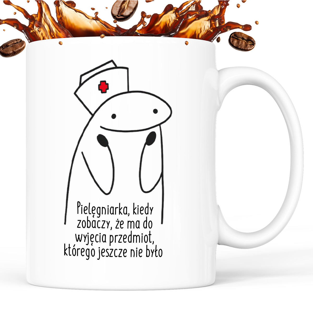 Kubek z nadrukiem "Pielęgniarka, kiedy zobaczy, że ma do wyjęcia przedmiot, którego jeszcze nie było "