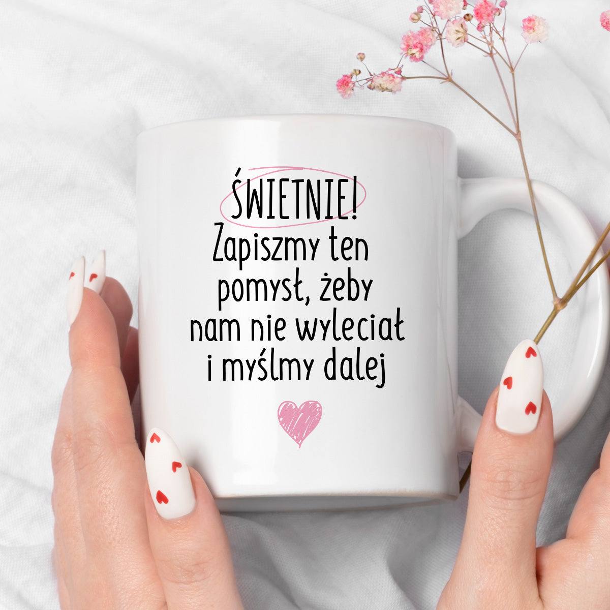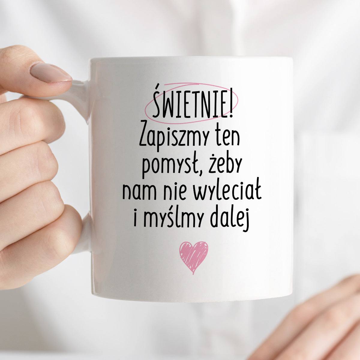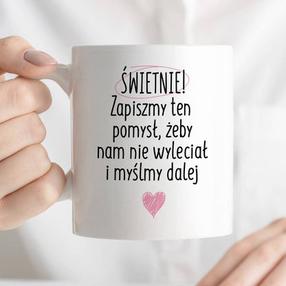 Kubek z nadrukiem "Świetnie! Zapiszmy ten pomysł, żeby nam nie wyleciał i myślmy dalej" - DZIEŃ KOBIET 🌸