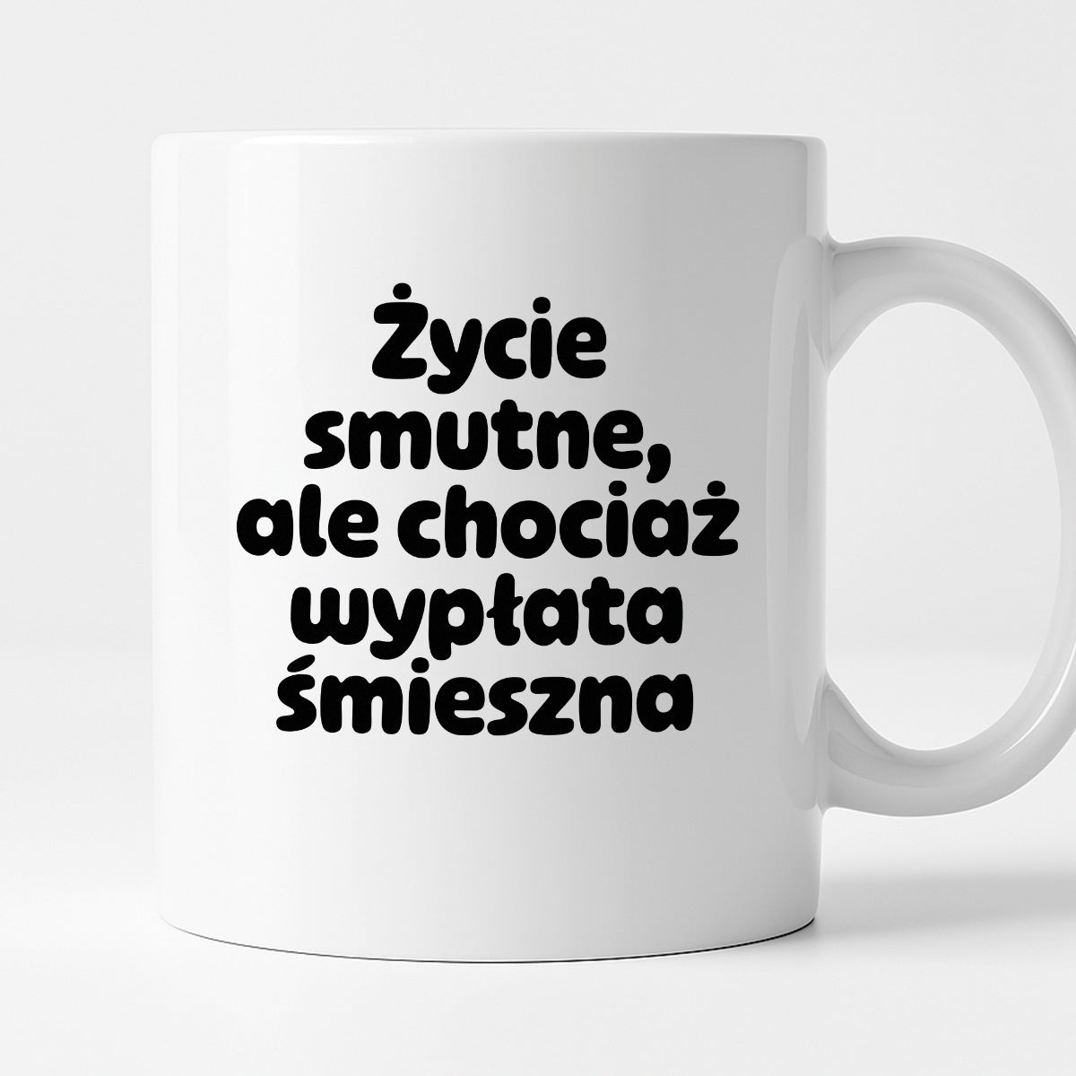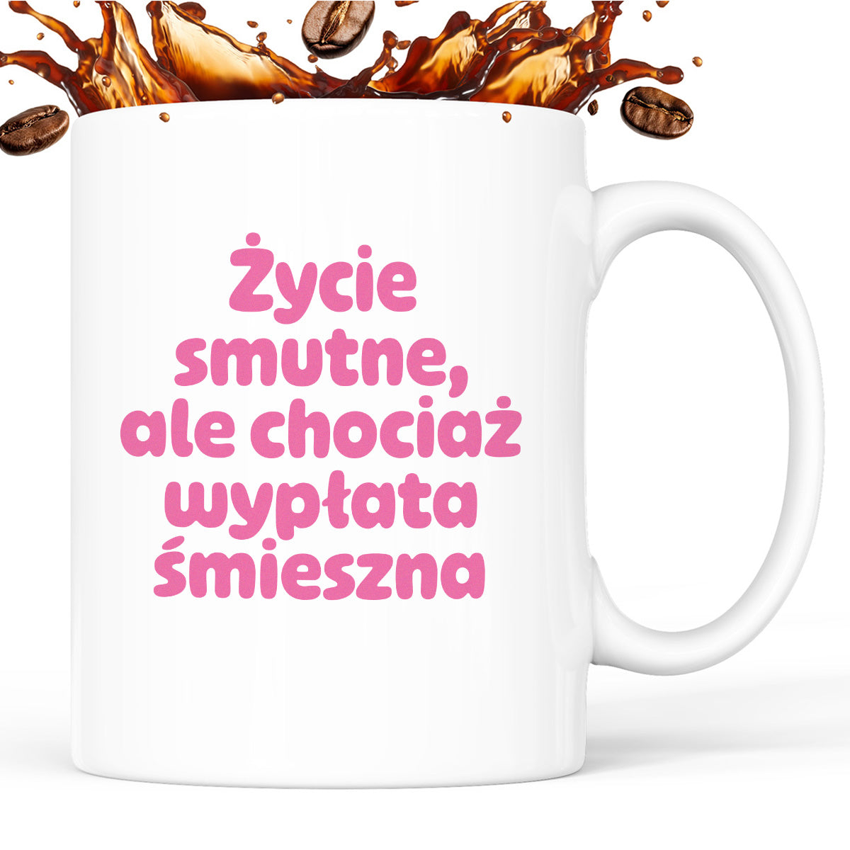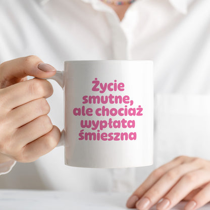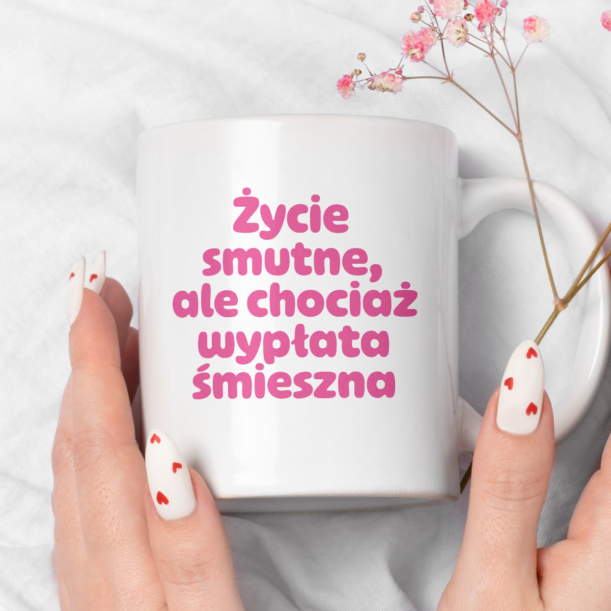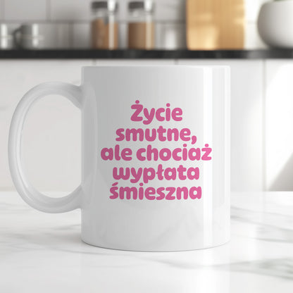 Kubek dla wszystkich, którzy rano wstają tylko dlatego, że trzeba... a potem patrzą na konto i śmieją się przez łzy. No cóż — życie bywa ciężkie, ale przynajmniej konto bankowe potrafi rozbawić.